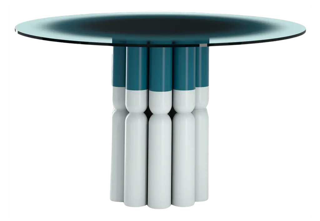 Red Happy meal, unique dining table by Studio YolkOne of a KindDimensions: Ø 130 cm, 72 cmMaterials: ash wood and glass topHappy meal is about the energy that is found in and around ingesting a meal, about being in and out of focus and contact, seeing through or being closed off, or closing off yourself. Alone and or with. The dining table is part of a larger installation where vintage plates with love in bio-resin are included. Plates are made by Pernille Iben Linde The glass top is Ø130 cm, hand-drawn base is 72 cm in painted ash local artisans have turned the wooden frame.YOLK is a family based art and design studio founded by Pernille Iben and Morten Linde. Their shared interests, professional backgrounds, love of materials, aesthetic sensibility, creative urge and curiosity is the basis for YOLK. So far, two of their three children - Amanda and Carl Otto Linde - are active members.The starting point is the academic discipline and professional expertise of each YOLK member, ranging from product and furniture design, to visual communication, to fashion and fine art. YOLK artists are represented individually and also through collaborative cross-disciplinary work.They only produce one of each piece of art and design, i.e. each and every item is a one-off. Occasionally there are series, but never with identical expression. YOLK work in all materials and draw upon external artisans and craftsmen.Pernille Iben and Morten have been together for the last 35 years. They live and work in Copenhagen. Amanda also lives in Copenhagen where she in addition to her YOLK art, produces and sells accessories through her own company. Carl Otto is currently studying fine arts in Amsterdam.
