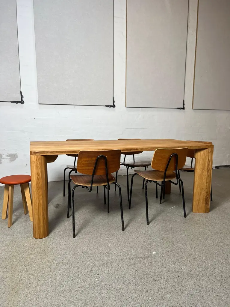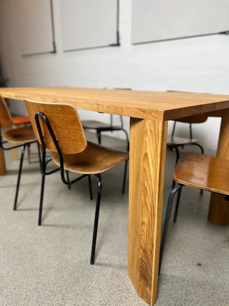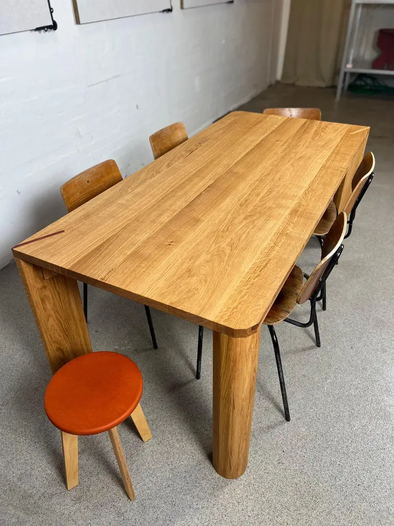 This handcrafted dining table is a modern design masterpiece, combining simplicity with architectural elegance. Its clean, rectangular form is complemented by rounded leg profiles, offering a sleek yet warm presence that makes it perfect for any dining or workspace. Built from premium solid wood, the table pictured features oak, but customers have the freedom to choose from a variety of solid woods to create a piece that reflects their personal style and complements their interior. The table's dimensions are fully customizable, ensuring a perfect fit for any space, whether you’re furnishing a cozy dining area or a spacious office. Designed with both form and function in mind, this table showcases the natural beauty of wood grain while maintaining durability and practicality for everyday use. A signature red line, a hallmark of the design, subtly adds a unique accent, creating a modern and memorable aesthetic. This table is more than furniture—it’s a statement piece, designed to bring lasting beauty and warmth to your home.