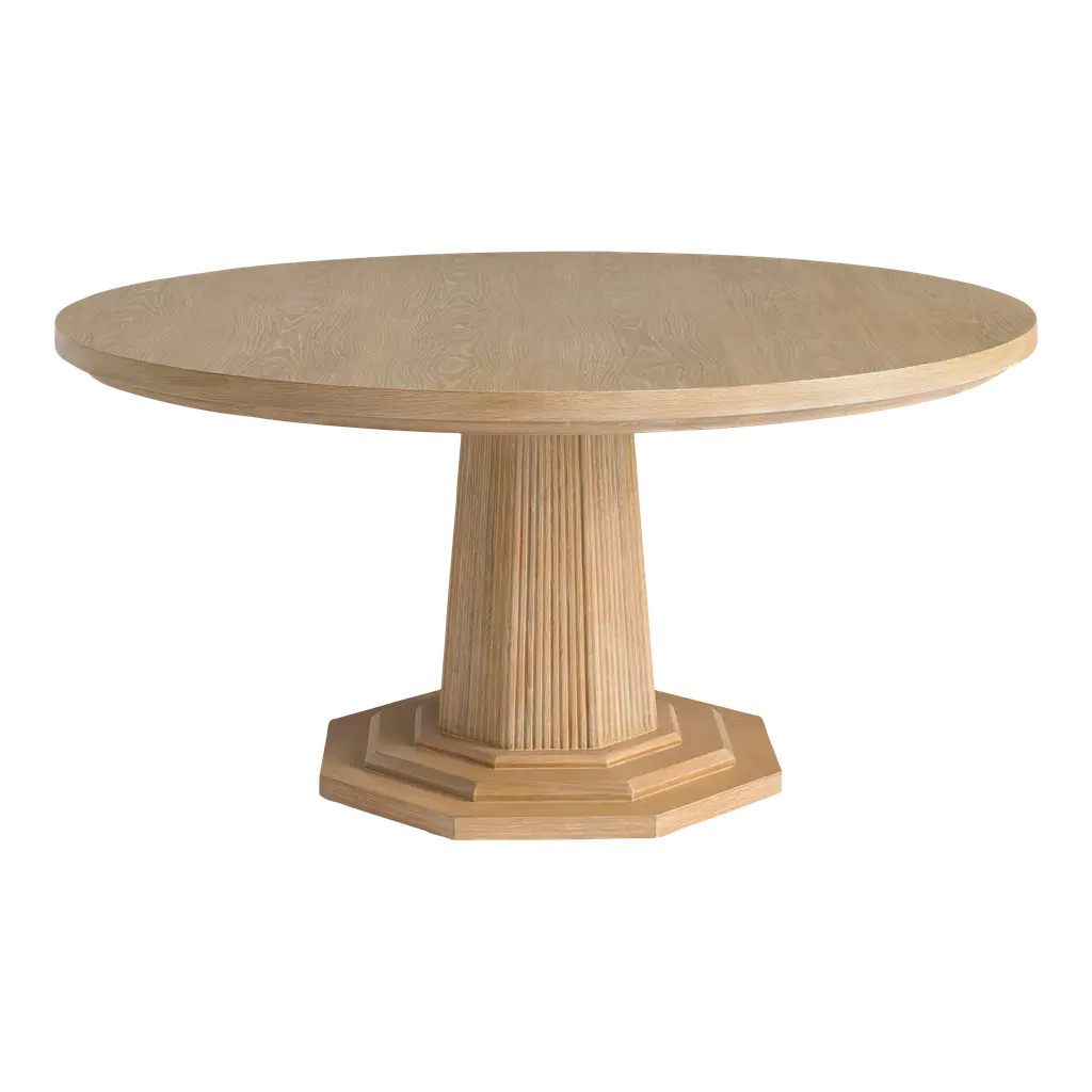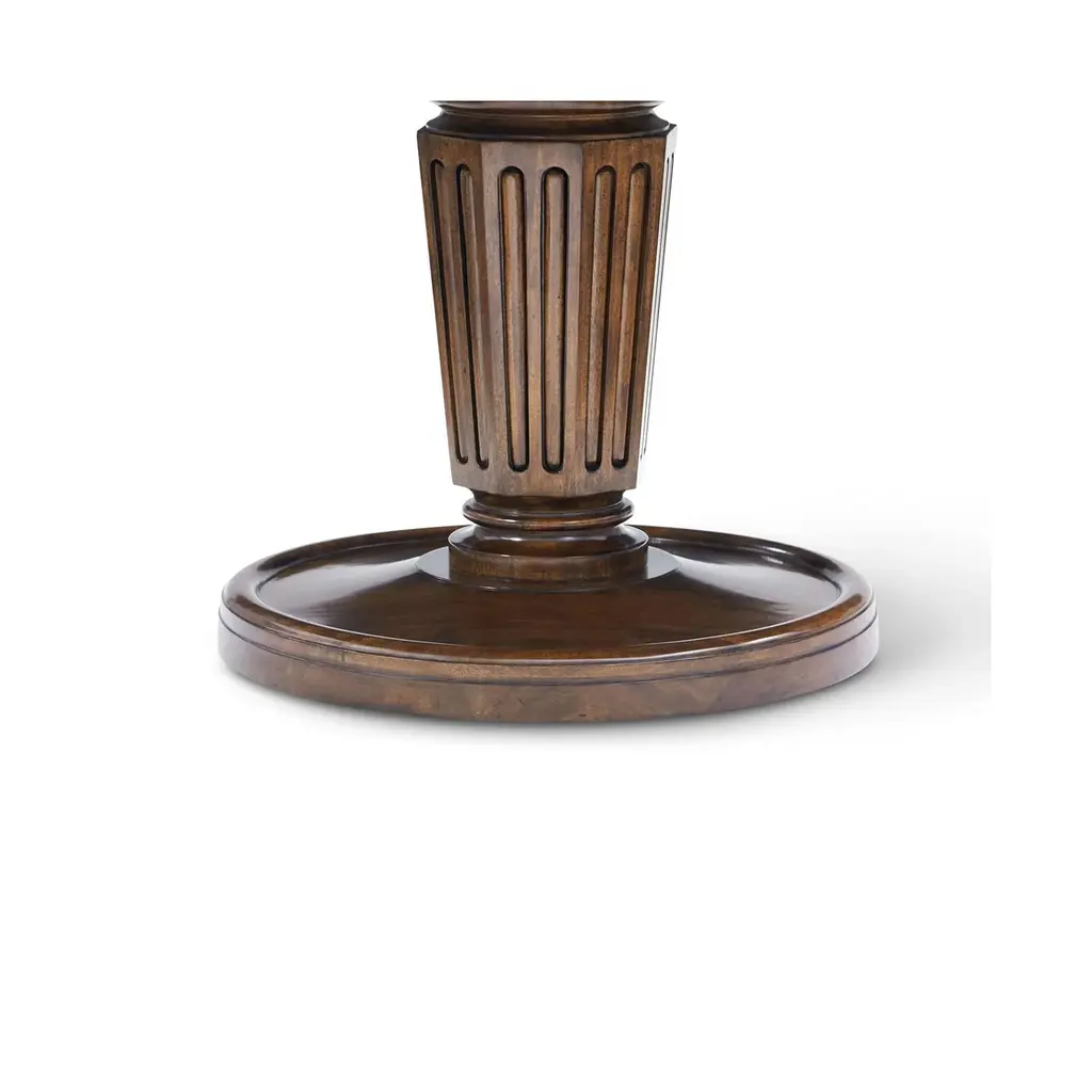 Masterfully crafted with figured walnut with a rich warm heirloom finish. The expansive round top sits on a sculptural pedestal base that is both reeded and tapered, offering a refined nod to neoclassical forms. Classic brass detailing subtly accents the top, adding warmth and elegance without overpowering the table's graceful profile. This piece makes a striking centerpiece for a formal dining room or refined breakfast space, where timeless proportion and artisanal detail speak to an enduring sense of taste. Its scale and silhouette invite convivial gatherings, while its construction showcases a dedication to lasting beauty and craftsmanship. Dimensions: 60" W x 60" D x 30" H