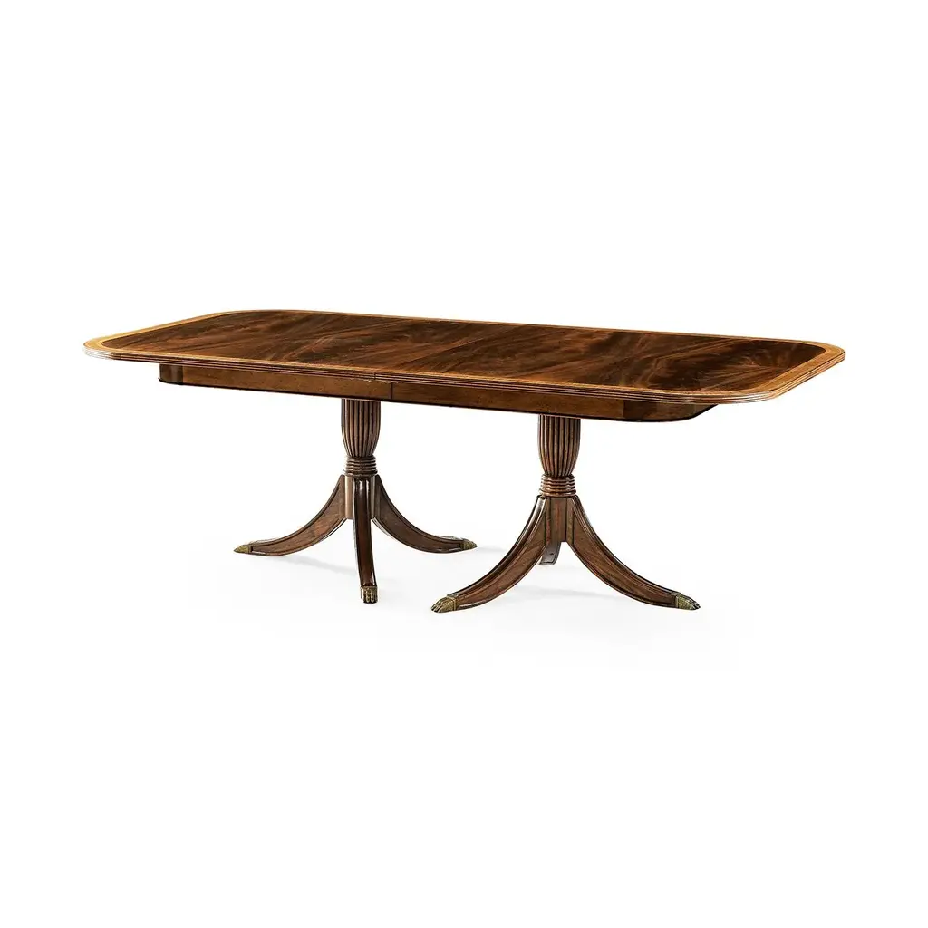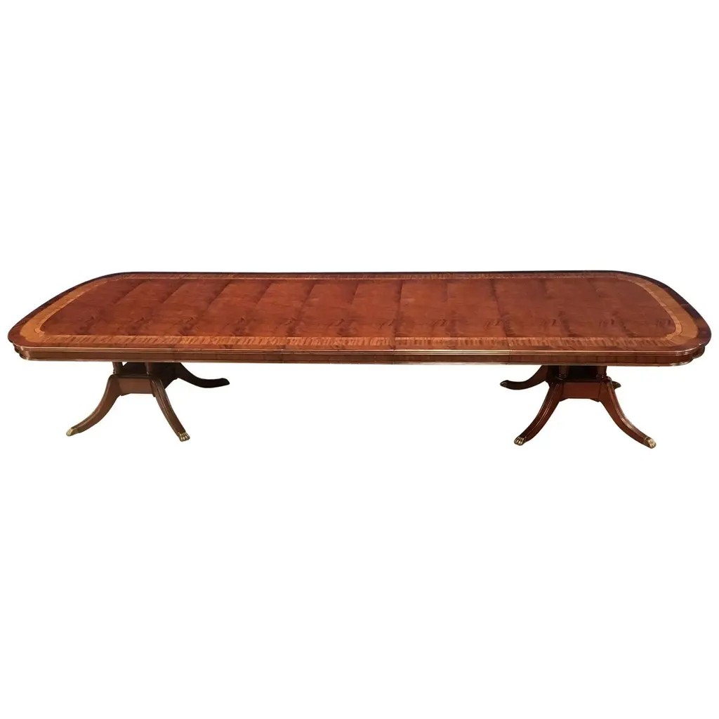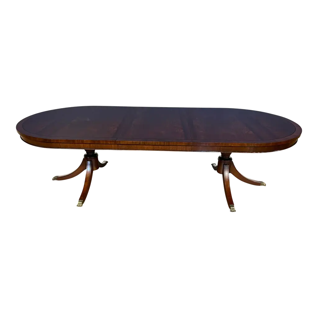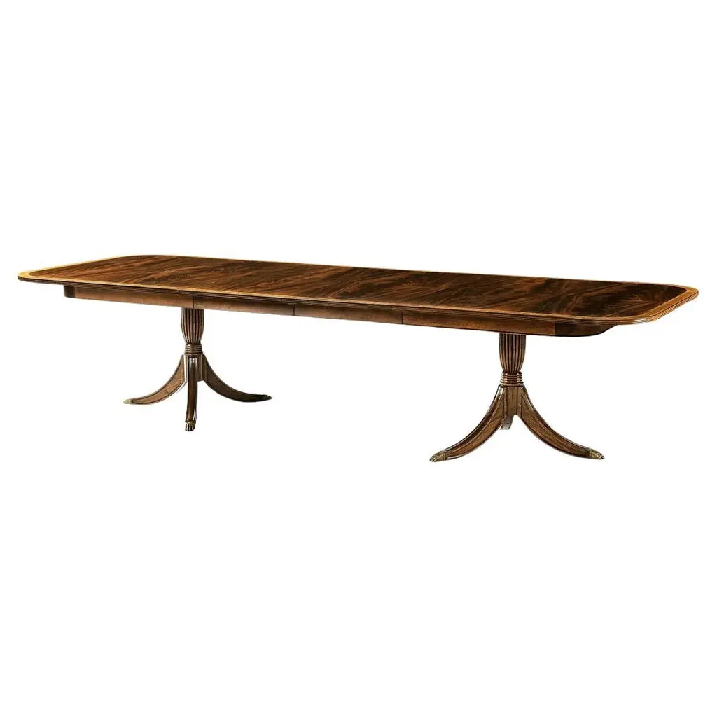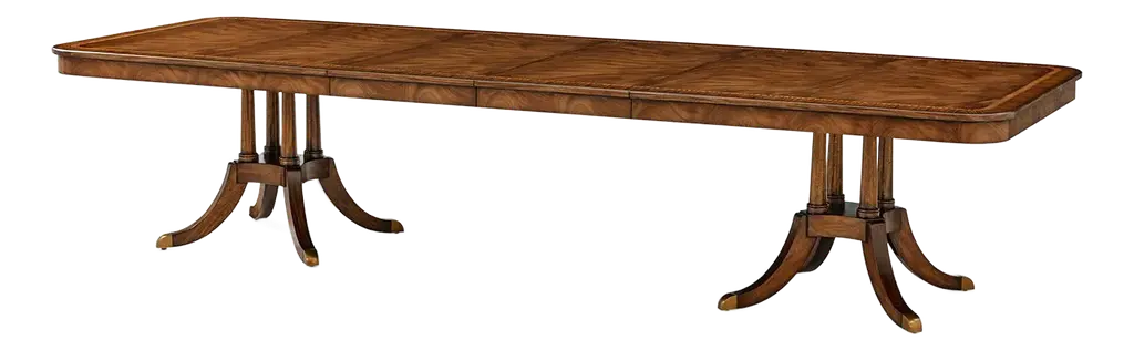 Crafted with crotch mahogany veneers, its extendable top features rich grain patterns. The two 22" extension leaves expand seating for grand gatherings. Set on twin pedestal baluster bases, it blends classic craftsmanship with modern versatility, perfect for intimate dinners or lavish celebrations. With its Medium Antique Mahogany finish with a crossbanded edge, this dining table radiates warmth and opulence, enhancing any traditional or transitional interior. The twin pedestal design ensures stability while maintaining an air of grace. Designed to seat up to ten guests, it is an investment in both style and practicality. Elevate your dining experience with a piece that honors heritage and impeccable artistry. Open Dimensions: 132" W x 48" D x 30" H Two 22" extension leaves