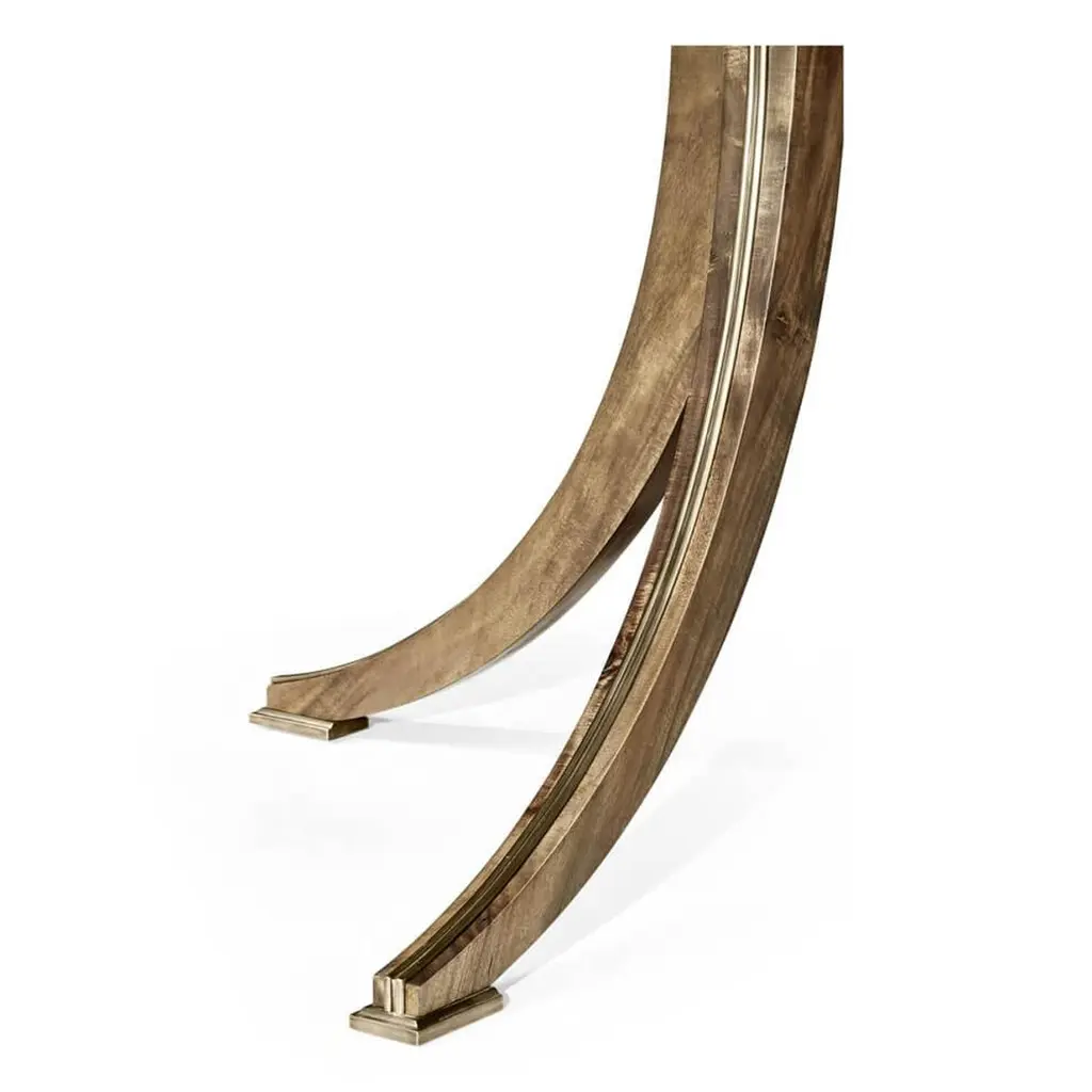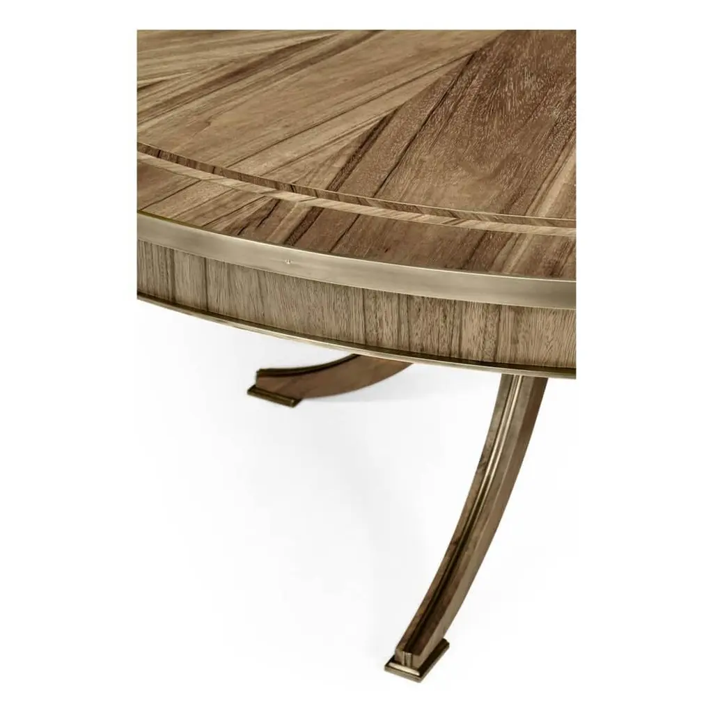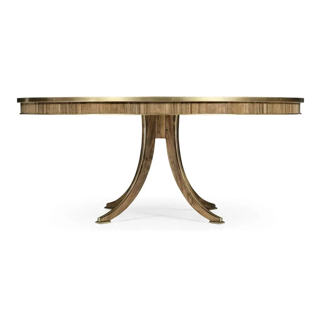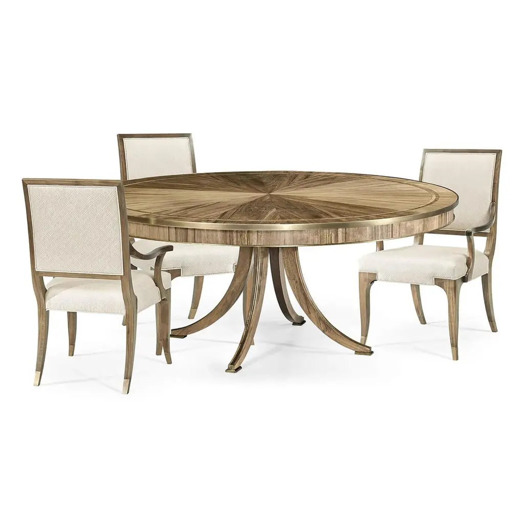A modern interpretation of a Regency style round 72" dining table. With golden amber finished exotic Paldoa veneers, a rayed sunburst design top with herringbone crossbanding, brass trim, and details, and raised on a four-splay leg pedestal base. Dimensions: 72" W x 72" D x 30 1/8" H.
