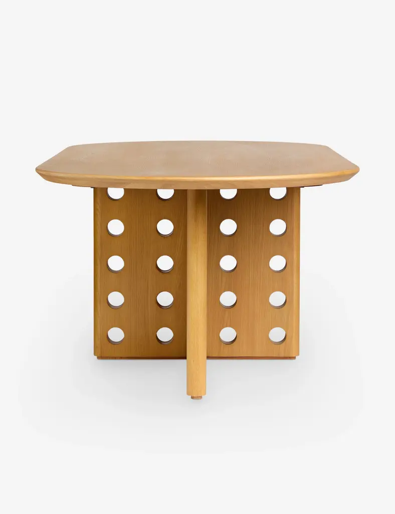 The Reika dining table features an oval top set on a perforated cross-base in a design that feels airy yet grounded. The clean rhythm of the circular cutouts adds a modern edge to the natural wood grain, creating a sculptural silhouette that anchors the room. This table is from our exclusive Sarah Sherman Samuel collaboration and features all the trademarks of her warm, edited style.