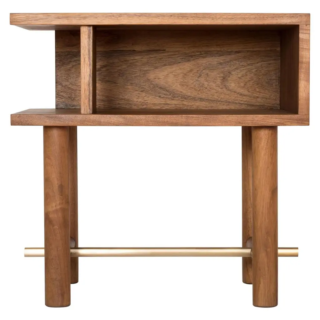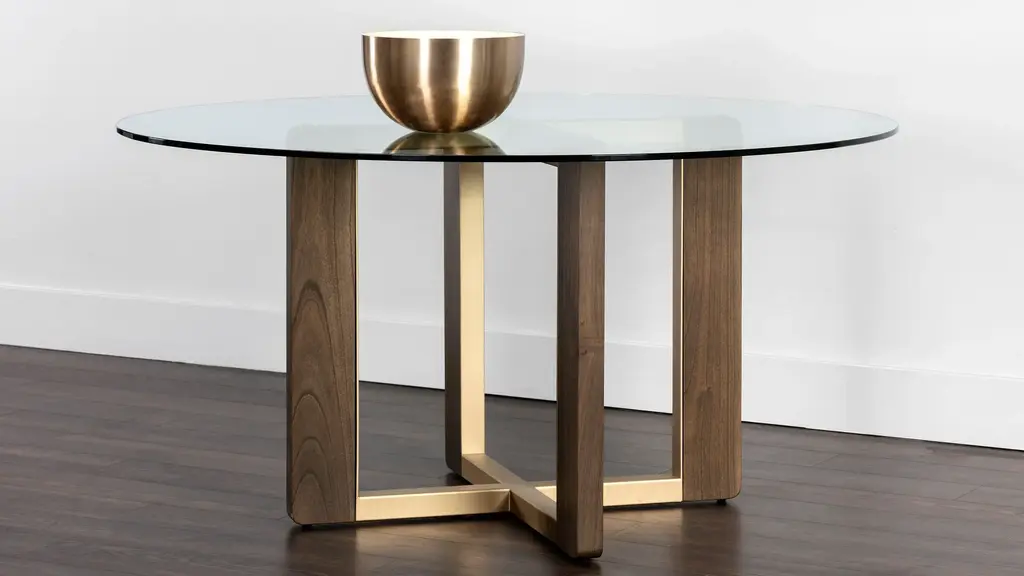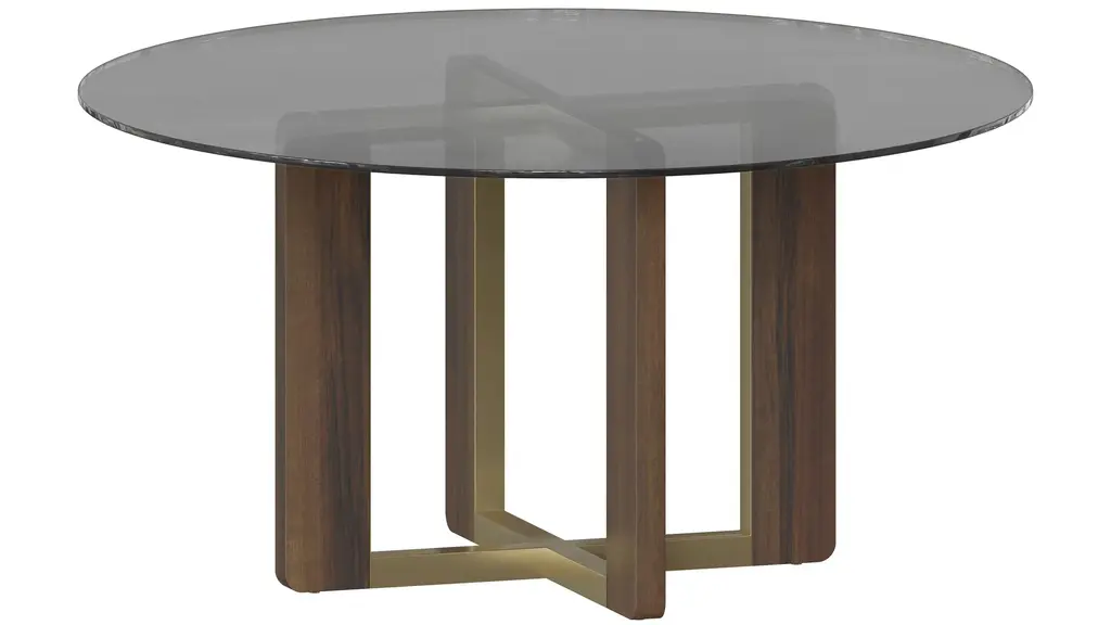 Rejane Dining Table Base that features contrasting brown solid mindi wood paired with a gold iron finish. Intended for use with a 59" round glass dining table top, or use two bases with a 96" glass top for a rectangular table combination. Table tops sold separately. Designed for use with glass table tops only. As wood is an organic, porous material, these pieces will contain natural variation of texture and may also exhibit fine indentations and cracks. Wood pieces will also display a disparity of colour and grain, and visible knots and burls that add to the character of each piece.