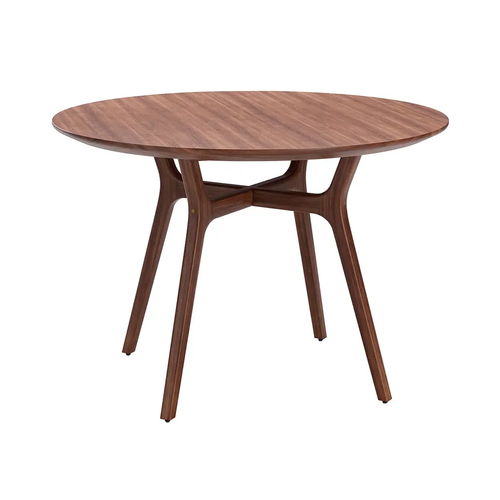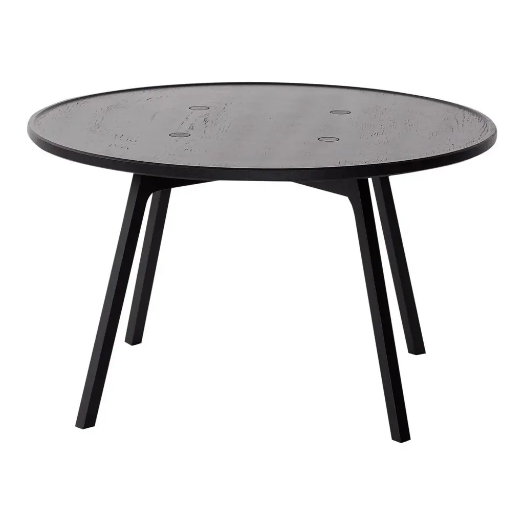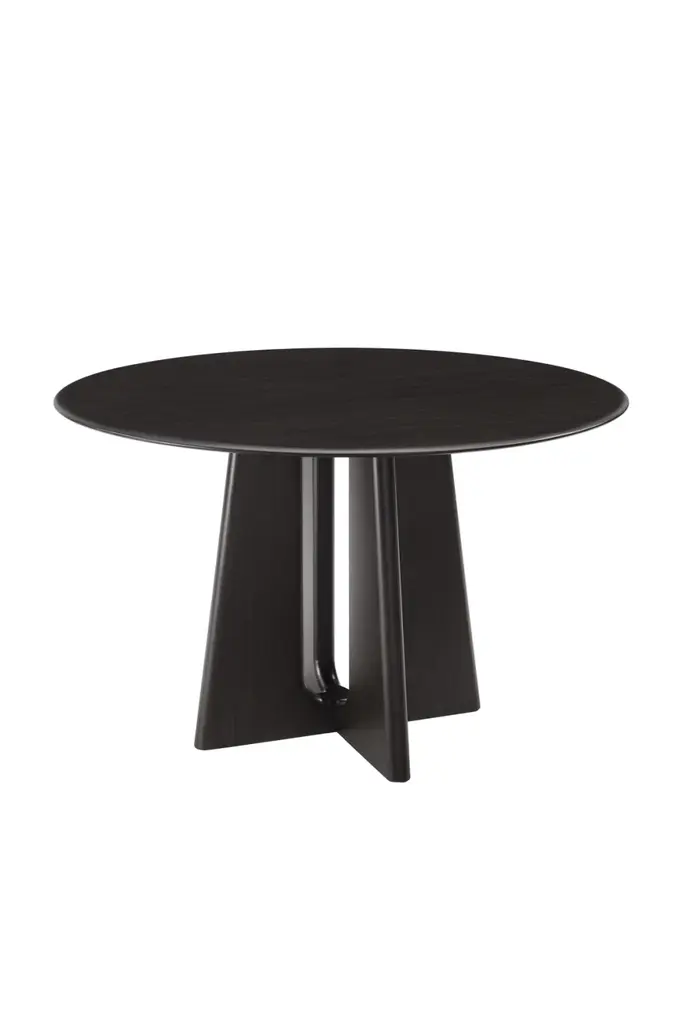 The graceful wood base of this extraordinary round dining table combines both a Nordic influence and a purity of line often found the design traditions of Japan and China. Signe Bindslev Henriksen and Peter Bundgaard Rutzou of Space Copenhagen then chose a tabletop with a veneer laminate surface and elegant angled edge that underscores the fluid lines of Stellar Works' entire Ren series. Table crafted in stained ash with brass-plated detail, from cross-cultural brand Stellar Works, which melds traditional production finesse from Shanghai with a European-influenced modernity.
