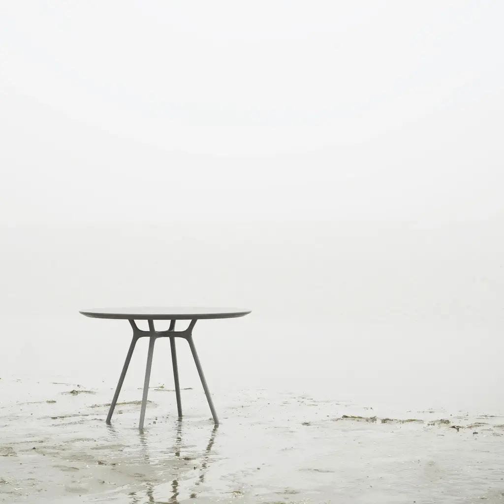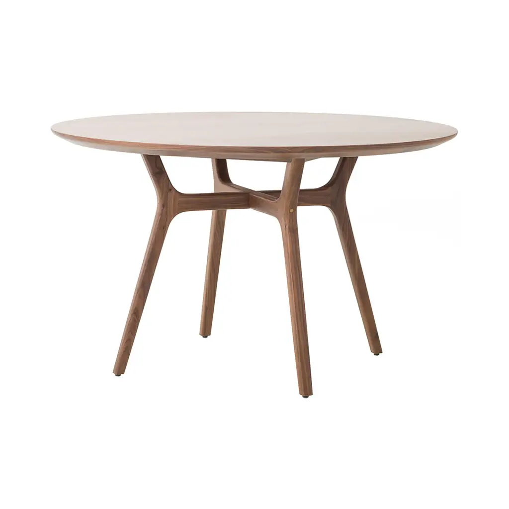 The graceful wood base of this extraordinary round dining table combines both a Nordic influence and a purity of line often found the design traditions of Japan and China. Signe Bindslev Henriksen and Peter Bundgaard Rutzou of Space Copenhagen then chose a tabletop with a veneer laminate surface and elegant angled edge that underscores the fluid lines of Stellar Works' entire Ren series. Table crafted in stained ash with brass-plated detail, from cross-cultural brand Stellar Works, which melds traditional production finesse from Shanghai with a European-influenced modernity.