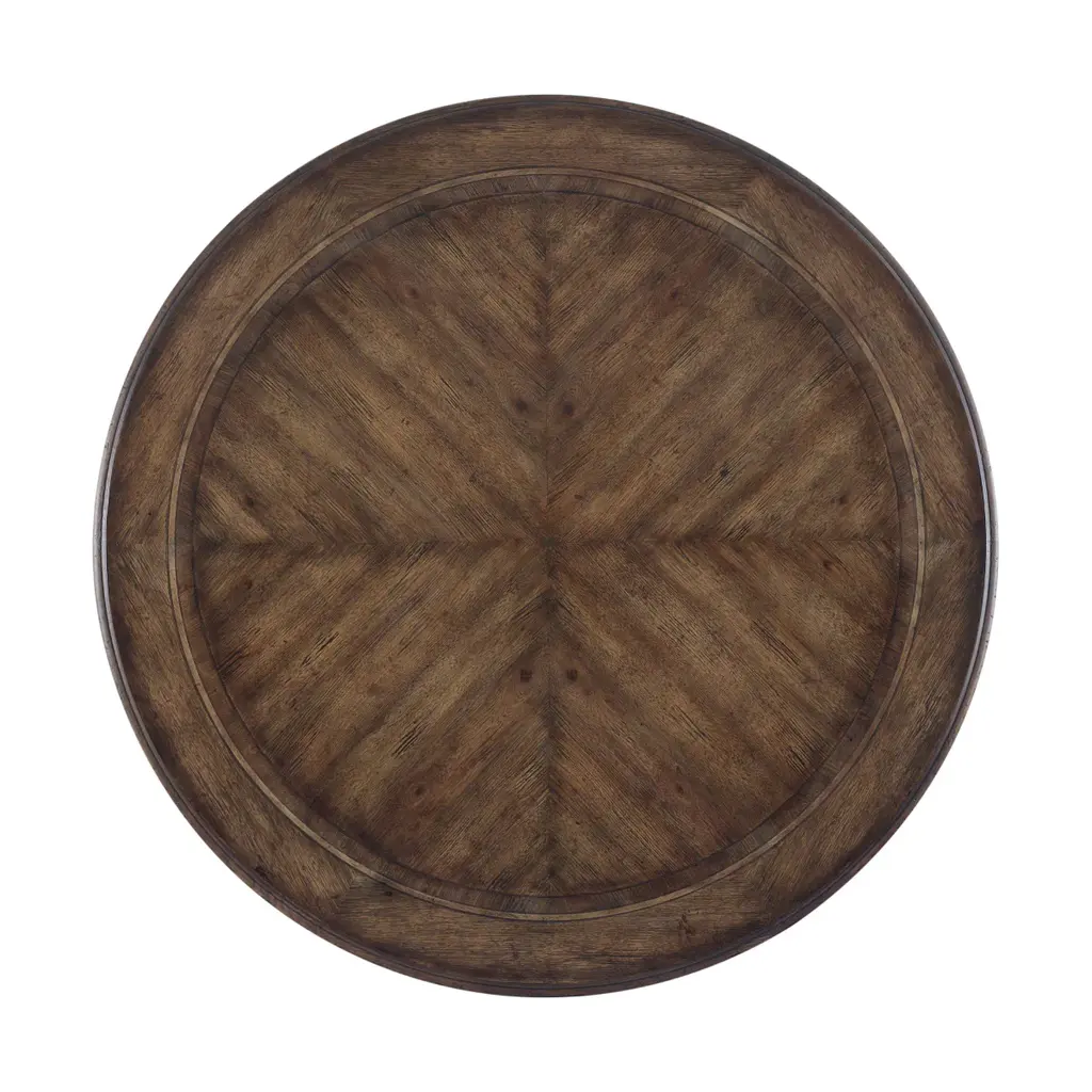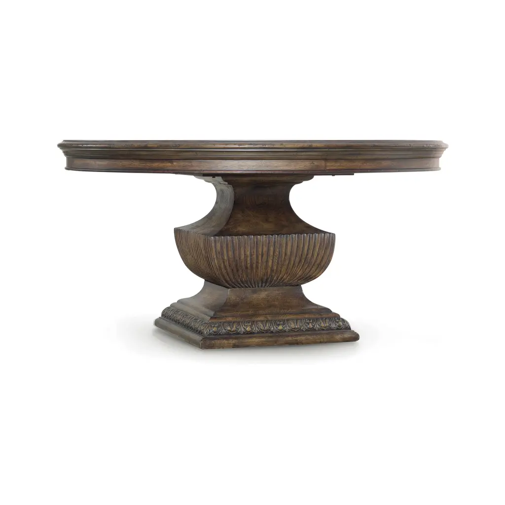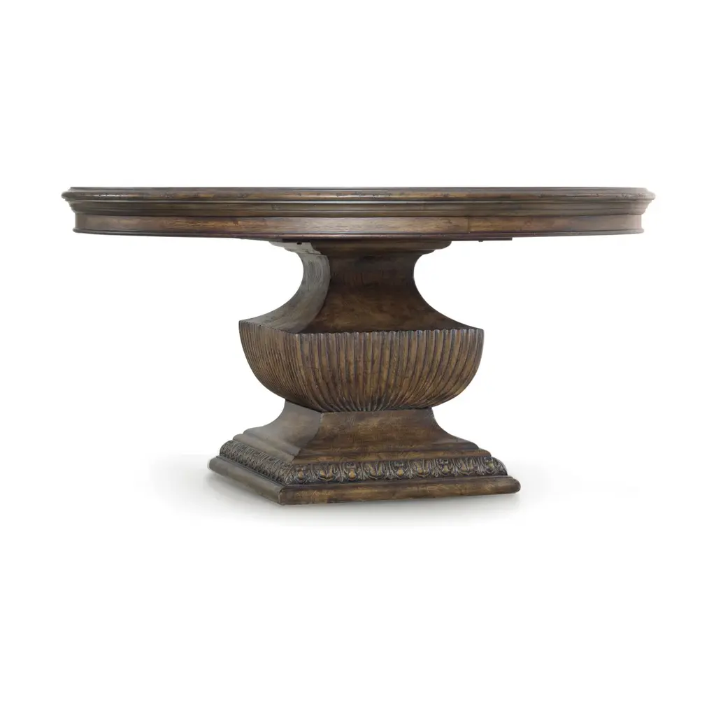A breathtaking statement of casual opulence, the Rhapsody Round Dining Table from Hooker Furniture brings a grand, old-world charm to your home. This stunning dining table is defined by its massive, classical urn-shaped pedestal base, richly detailed with timeless motifs. The expansive round top is crafted from a beautiful blend of veneers, all finished in a rustic, walnut color inspired by the patinas of reclaimed wood. A fusion of classic European design and rustic character, it’s an unforgettable centerpiece for any dining setting. Highlights: