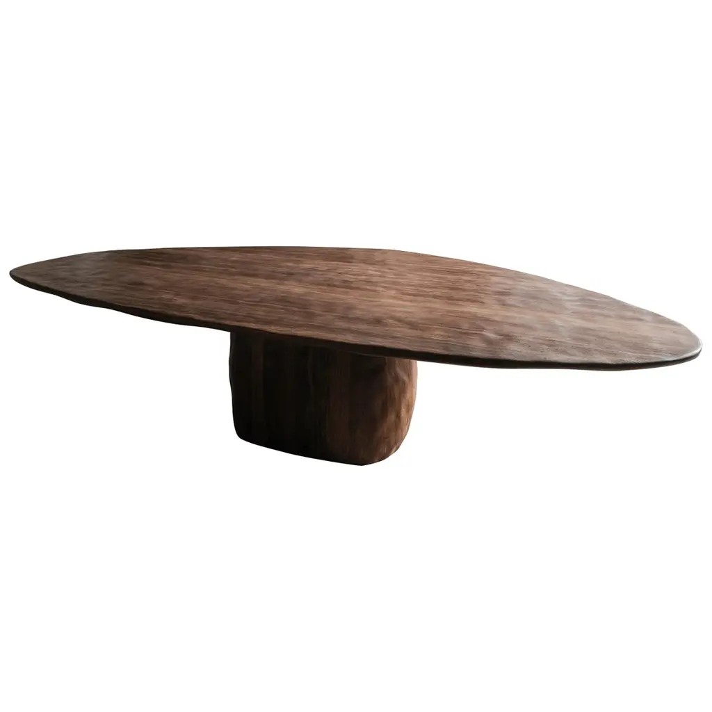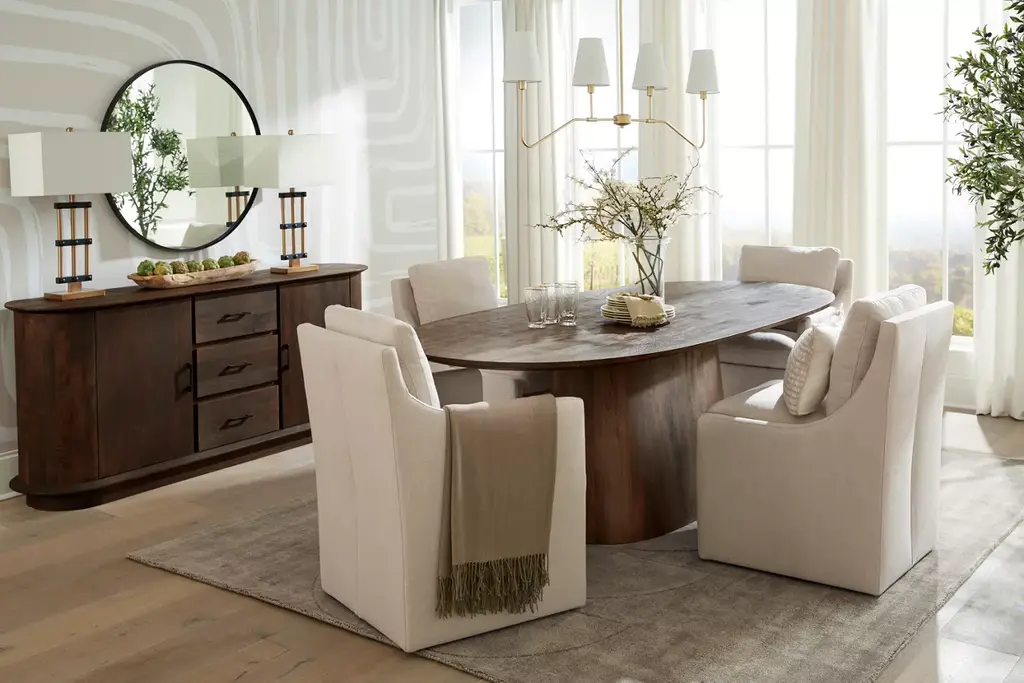 Our Rhodes oval dining table makes a simple and stunning statement with its quality craftsmanship, size, shape and pedestal base. Featuring responsibly sourced and hand-planed Mango solids in a distressed matte brown finish, this table exudes cool, contemporary style. Shown with our