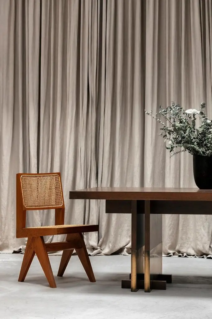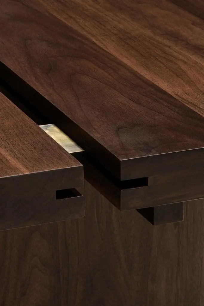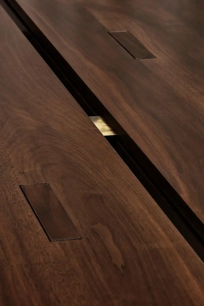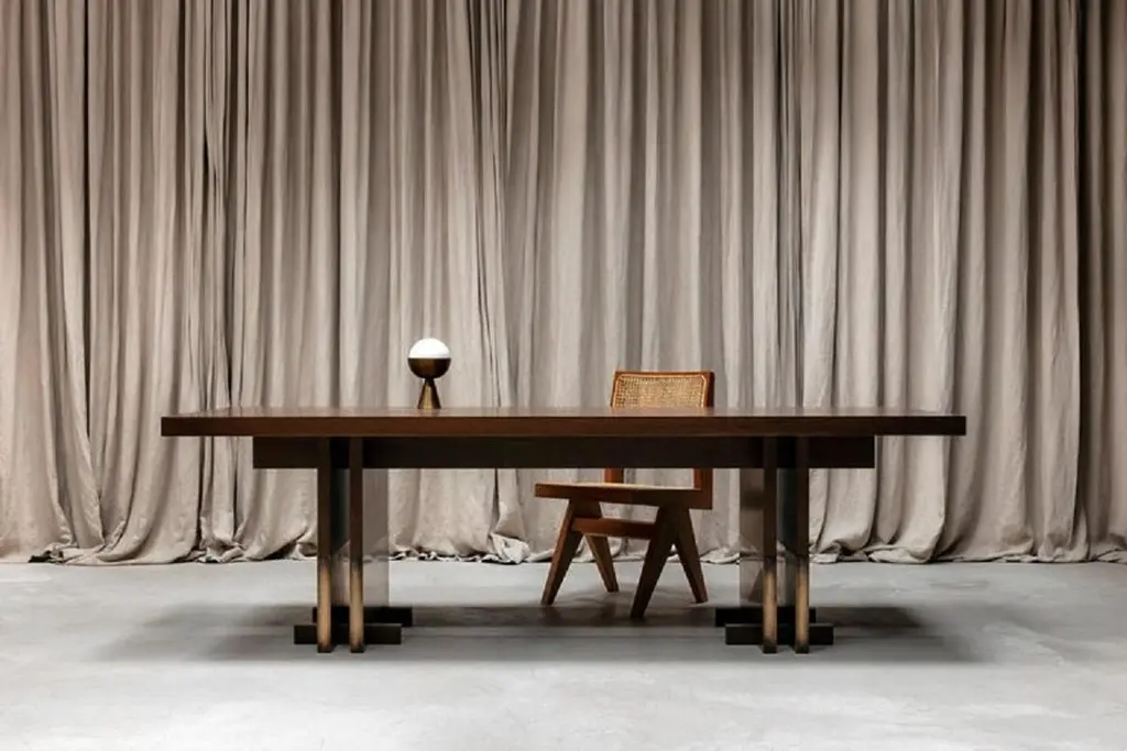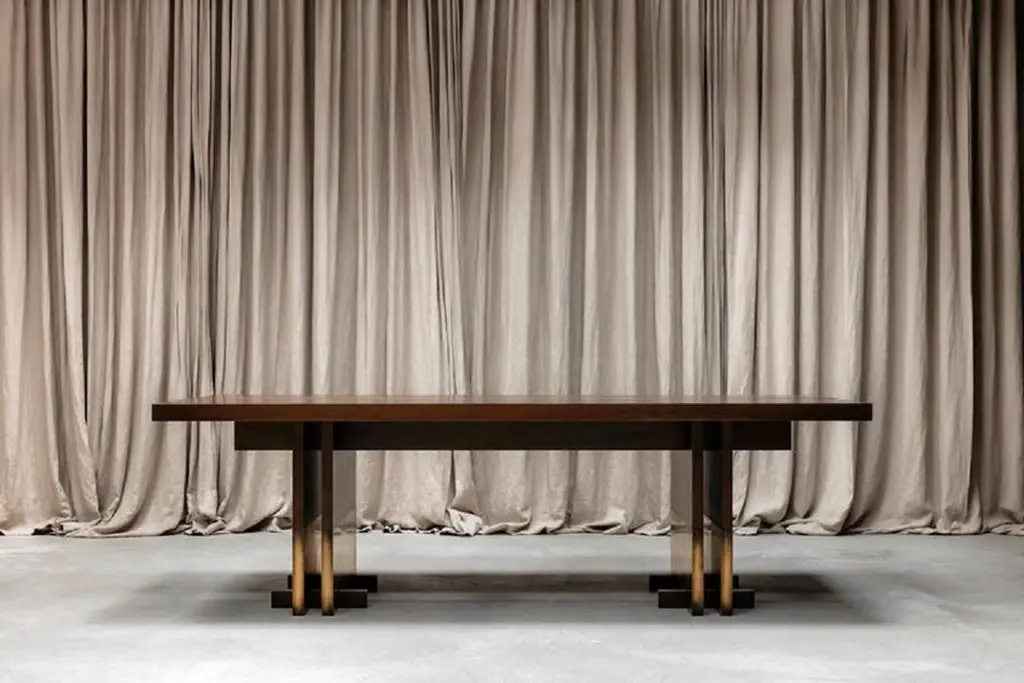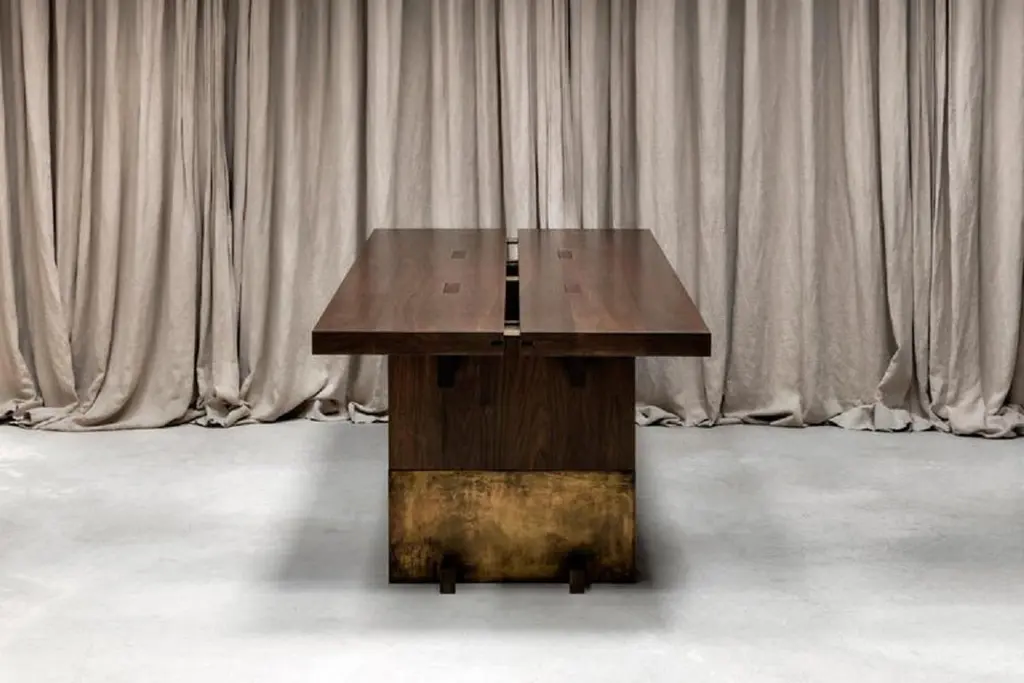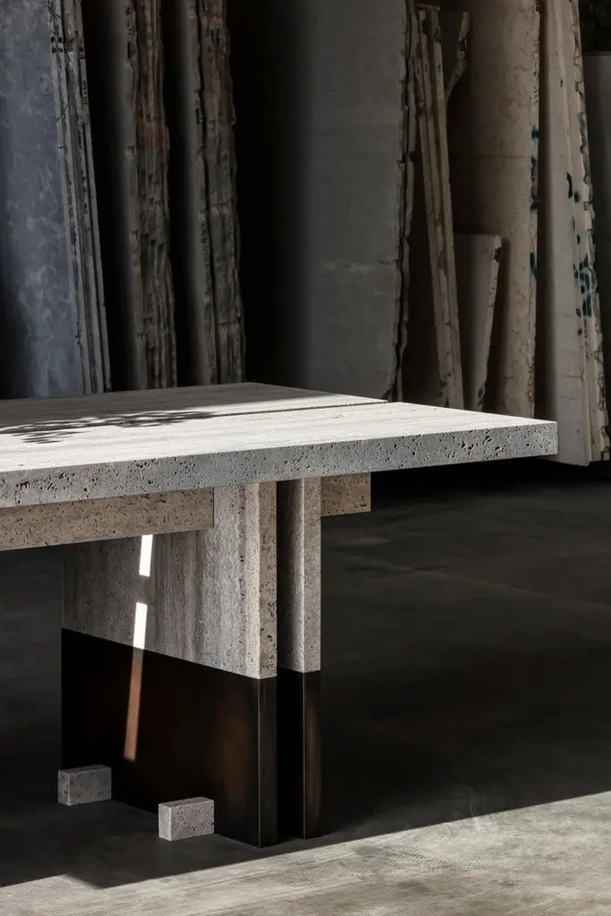 Rift Travertin dining table by Andy KerstensLimited Edition of 12 Dimensions: W 240 x D 98 x H 74 cmMaterials: Travertin Grigio, blackened steelHandmade in BelgiumAvailable in Solid Larch, Oak and Walnut and various sizes. Please contact us.Available in various sizes: 240cm x 98cm x 74cm320cm x 102cm x 74cm450cm x 106cm x 74cmTop part available in natural stone: Travertin Grigio, Invisible Grey, Nero Terrazzo Wood: Dark stained walnut, white washed larch or brushed oakBase part available in weathered brass patinated, bronze or blackened steel The design was created by the need for a simple esthetic with an honest construction.By duplicating all elements, the table has a stable basis and also a certain finesse. The simple idea to split the elements creates an honest and visible construction that is self-supporting, with a nod to the Japanese design method.Metal details and leg casings stand in contrast with the naturally worked wood and give the whole design more durability. Deep and tactile patines on the metal form a dialogue with the brushed wood and tell a story about its use and its traces through time. The design is available in multiple realizations in terms of material and lengths. There are also the exclusive versions in natural stone and terrazzo.The natural materials all passed through the hands of our talented Belgian craftsmen. Every element is processed and finished in Flanders to guarantee the quality we’re striving for.Rift is available in various combinations of materials and dimensions.All materials are processed and finished by hand with a lot of care.The tactile finishes of the metal details blend with the wooden or stone bodies.Different finishes of the metal parts are possible.A wax enriches the patine finishes, which results in these parts changing through time. They will age more beautifully and can get darker after time. The wax treatment should be repeated every few months.The varnish finish stops the aging process and ensures that the texture and color stay the same. Therefore, the metal is resistant to external factors and very easy to maintain.Wooden parts follow te same principles. Oil treatments emphasize the natural look ofThe stone bodies are sawn or honed, depending on your choice.Small yet functional feet supporting the table legs, are optional on the wooden versions.Kerstens was founded in 2015 and is based in Antwerp. Kerstens is a multidisciplinary design studio with a clear vision of architecture, interior design, and furniture design. The focus is on total projects in which an affinity for craftsmanship, detail, and atmosphere are essential. This applies both to the residential market and to catering and retail projects.Our vision on interior is to create an atmospheric quality within a refined architectural design language. We strive for simplicity, a timeless, minimal design combined with rich, natural materials for a warm and sober look. The atmosphere created by a dialogue between unique objects, intriguing art, and tactile materialization results in contrast to a larger architectural whole and leads to a deeper emotion. Craftsmanship and sustainability are inextricably linked and form the basis of a project. Our work exudes a certain serenity, resulting from a monochrome and timeless signature, combined with a touch of understated luxury.Each assignment is unique and analyzed extensively to obtain a balanced basis for the concept and its further elaboration. Research into the program, use, context, layout and proportion, light and space, materialization, and budget are an important part of the process. A project is a combination of wishes, ideas, and designs in which we work in a detailed manner and on various scales. The interior is the extension of our senses and actions and is central to daily life. The personal interpretation and perception of the user, therefore, form a guideline throughout our process. Designing the smallest details is crucial to achieving a total design, whereby the mutual relationship of all elements is enhanced by one idea, concept, and design.Andy Kerstens graduated in 2015 as a Master of Science in Interior Architecture (cum laude) at the University of Antwerp. With the preparatory trajectory, in 2013 he obtained his Bachelor of Arts in Interior Design at the Thomas More College in Mechelen. Freelance interior designer at Dieter Vander Velpen Architects and previoulsy at De Meester Vliegen Architects.