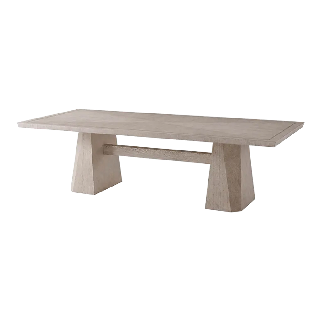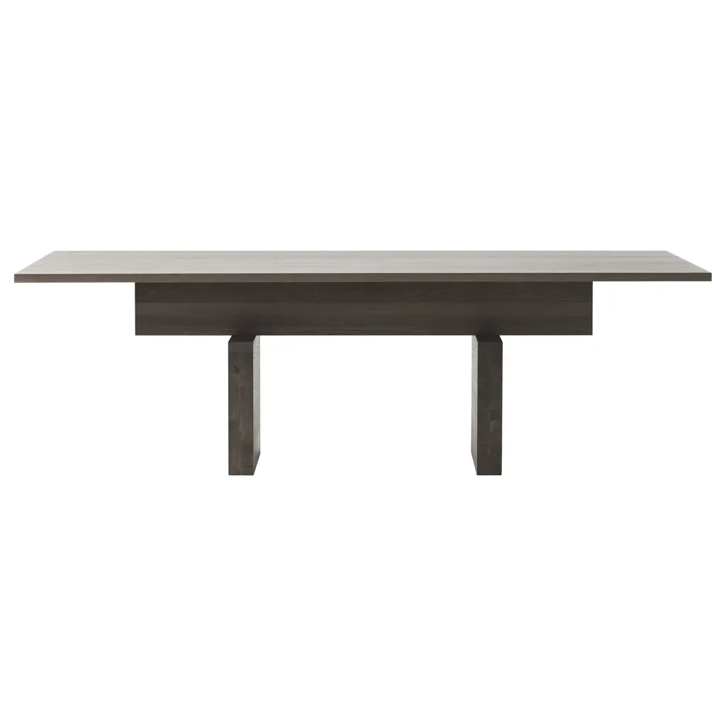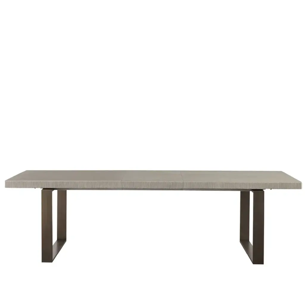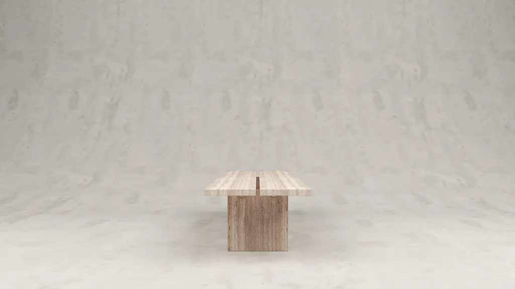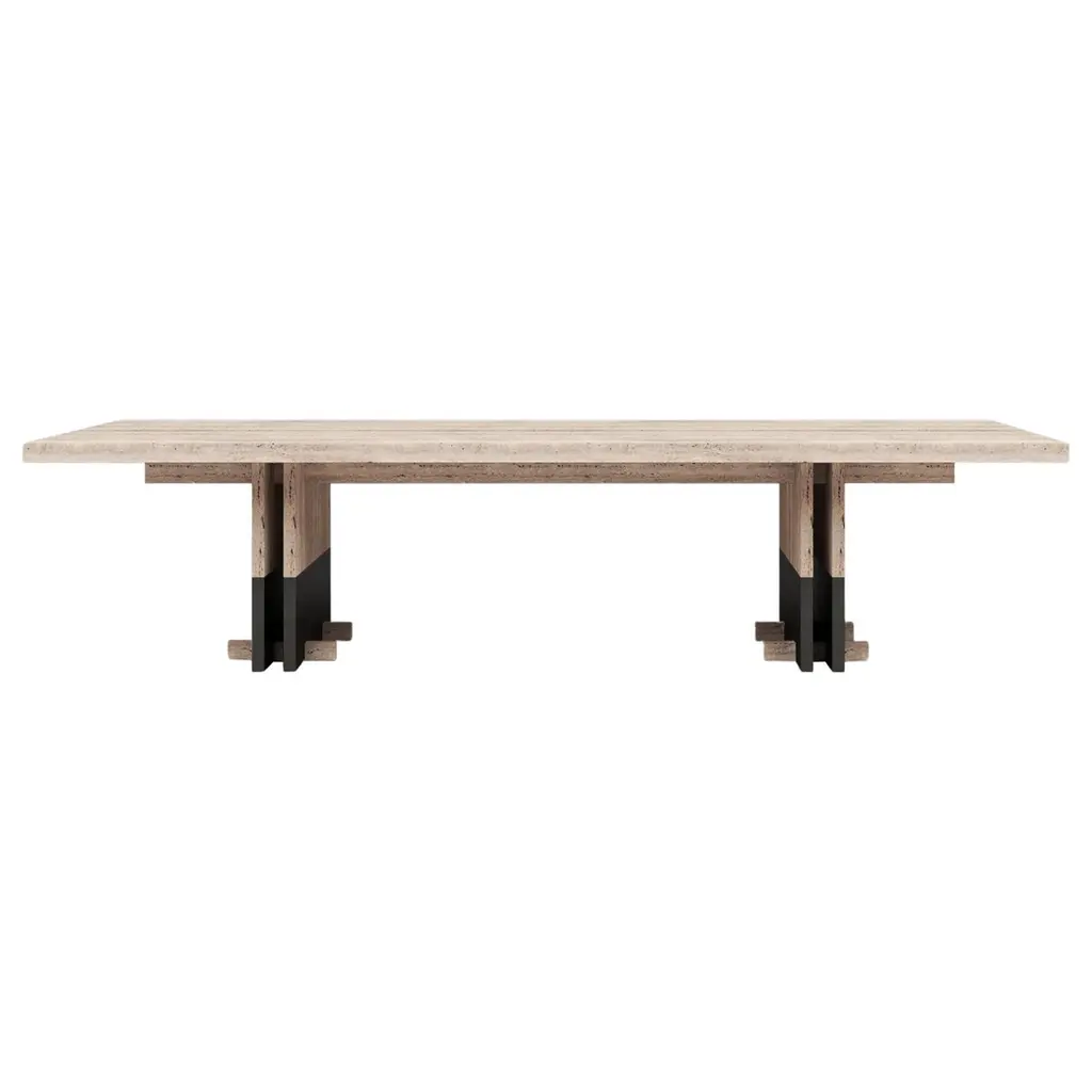 Rift travertino Gririo dining table by Andy KerstensDimensions: W 240 x D 98 x H 74 cmMaterials: All stone travertino gririoOptional little feet at table legsHandmade in Belgium.Available in Solid Larch, Oak and Walnut and in 320 x 102 x 74 cm, and 450 x 106 x 74 cm. Please contact us.The design was created by the need for a simple esthetic with an honest construction.By duplicating all elements, the table has a stable basis and also a certain finesse. The simple idea to split the elements creates an honest and visible construction that is self-supporting, with a nod to the Japanese design method. Metal details and leg casings stand in contrast with the naturally worked wood and give the whole design more durability. Deep and tactile patines on the metal form a dialogue with the brushed wood and tell a story about its use and its traces through time. The design is available in multiple realizations in terms of material and lengths. There are also the exclusive versions in natural stone and terrazzo.The natural materials all passed through the hands of our talented Belgian craftsmen. Every element is processed and finished in Flanders to guarantee the quality we’re striving for.Rift is available in various combinations of materials and dimensions. All materials are processed and finished by hand with a lot of care the tactile finishes of the metal details blend with the wooden or stone bodies. Different finishes of the metal parts are possible. A wax enriches the patine finishes, which results in these parts changing through time. They will age more beautifully and can get darker after time. The wax treatment should be repeated every few months. The varnish finish stops the aging process and ensures that the texture and color stay the same. Therefore, the metal is resistant to external factors and very easy to maintain.Wooden parts follow te same principles. Oil treatments emphasize the natural look of The stone bodies are sawn or honed, depending on your choice.Small yet functional feet supporting the table legs, are optional on the wooden versions.Kerstens was founded in 2015 and is based in Antwerp. Kerstens is a multidisciplinary design studio with a clear vision of architecture, interior design, and furniture design. The focus is on total projects in which an affinity for craftsmanship, detail, and atmosphere are essential. This applies both to the residential market and to catering and retail projects.Our vision on interior is to create an atmospheric quality within a refined architectural design language. We strive for simplicity, a timeless, minimal design combined with rich, natural materials for a warm and sober look. The atmosphere created by a dialogue between unique objects, intriguing art, and tactile materialization results in contrast to a larger architectural whole and leads to a deeper emotion. Craftsmanship and sustainability are inextricably linked and form the basis of a project. Our work exudes a certain serenity, resulting from a monochrome and timeless signature, combined with a touch of understated luxury.Each assignment is unique and analyzed extensively to obtain a balanced basis for the concept and its further elaboration. Research into the program, use, context, layout and proportion, light and space, materialization, and budget are an important part of the process. A project is a combination of wishes, ideas, and designs in which we work in a detailed manner and on various scales. The interior is the extension of our senses and actions and is central to daily life. The personal interpretation and perception of the user, therefore, form a guideline throughout our process. Designing the smallest details is crucial to achieving a total design, whereby the mutual relationship of all elements is enhanced by one idea, concept, and design.Andy Kerstens graduated in 2015 as a Master of Science in Interior Architecture (cum laude) at the University of Antwerp. With the preparatory trajectory, in 2013 he obtained his Bachelor of Arts in Interior Design at the Thomas More College in Mechelen. Freelance interior designer at Dieter Vander Velpen Architects and previoulsy at De Meester Vliegen Architects.