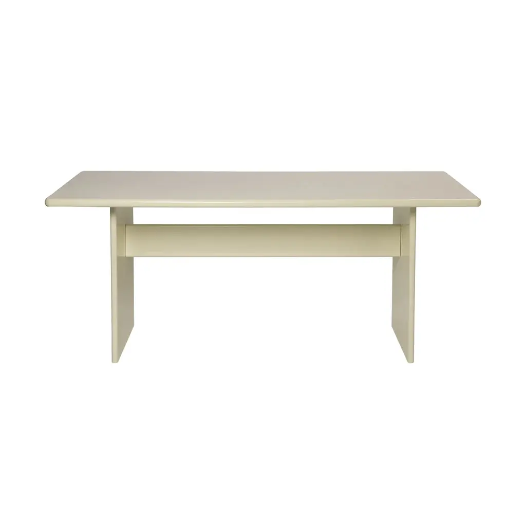 The Rink Dining Table blends a classic design with a smooth, high-gloss lacquer finish on an FSC™-certified MDF core, creating a sleek and reflective surface. Its shape is balanced by rounded edges, giving it a softer, modern feel. Offered in 2 sizes and in colors Eggshell or Tea Green, it can fit into a variety of dining spaces. This table seamlessly integrates with different interior styles.