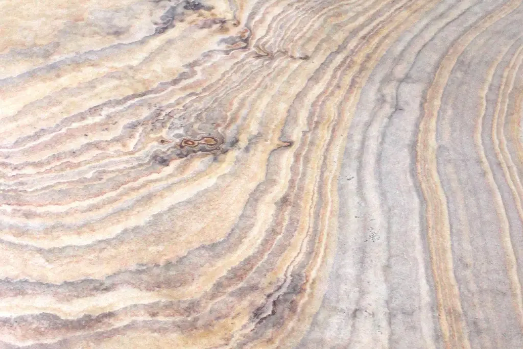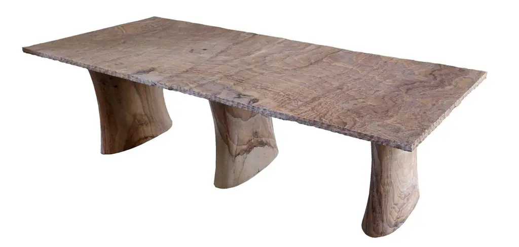 Available size: 72" x 36" x 30" HWhen the renowned designer Paul Mathieu first saw the extraordinary swirling colors and patterning of the Indian sandstone “Rainbow teak wood” he realized that he had discovered the perfect material for a large format table that would combine the look of both stone and wood. The tabletops are cut to display the unique patterning characteristic of the stone, which resembles the appearance of wood cut across the grain. The massive yet deceptively elegant curved bases are each carved from a solid block of stone. Due to the size of these blocks, they must be quarried with the grain in the stone, not across the grain as the tabletops. The bases therefore have a similar appearance, but do not display the swirling grain as much, which would be distracting. Both tops and bases come sealed from the quarry. The different graining patterns show the sealer slightly differently, the bases looking “more dry” than the top. No two tables will be alike.Customization: These tables may be customized for size and edge treatment (cleft edge is standard). They can be other shapes including round and oval. Generally 7’ long is the maximum length; occasionally lengths up to 9’ have been available. 4 feet is the maximum width; occasionally width up to 5 feet is also available. It can also be made in length up to 13’ of two book-matched tops resting on three bases.Customization is our specialty. Please do not hesitate to get in touch with us for any queries regarding size, material or design customization.Buyer Cancellation-The cancellation charge is 25% which increases to 50% if the production is started.Prices do not include shipping from India (for custom orders) or our MN warehouse (items from stock). That will be additional.