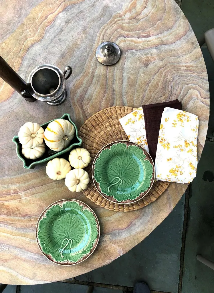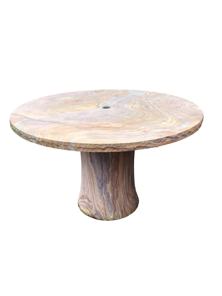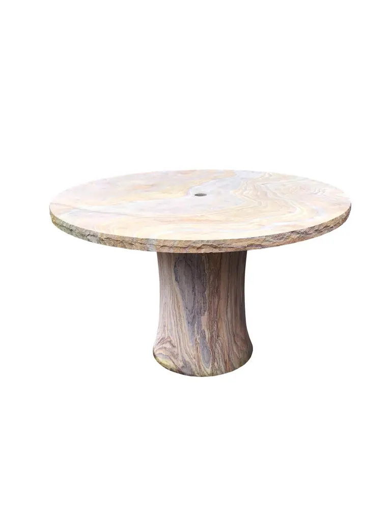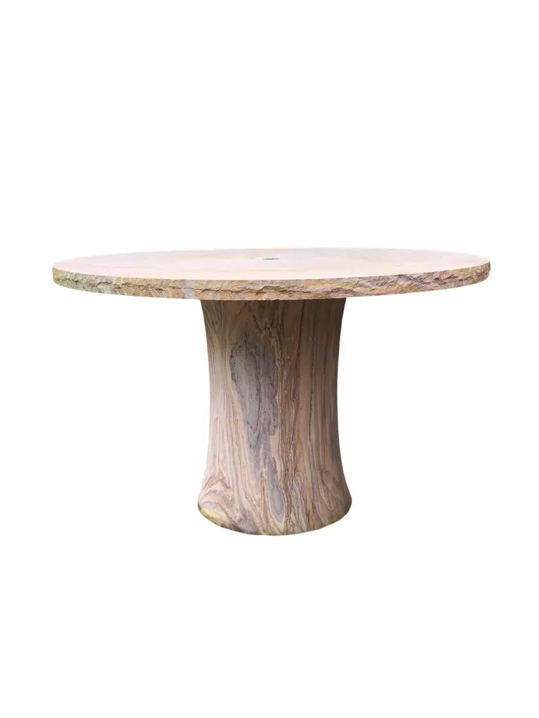 This round dining table was designed by the renowned designer Paul Mathieu for Stephanie Odegard. When he first saw the extraordinary swirling colors and patterning of the Indian sandstone “Rainbow Teakwood” he realized that he had discovered the perfect material for a large format round dining table that would combine the look of both stone and wood. The table tops of this round dining table are cut to display the unique patterning characteristic of the stone, which resembles the appearance of wood cut across the grain. The massive yet deceptively elegant curved bases are each carved from a solid block of stone. Due to the size of these blocks, they must be quarried with the grain in the stone, not across the grain as the table tops. The bases therefore have a similar appearance, but do not display the swirling grain as much, which would be distracting. Both tops and bases of this round dining table come sealed from the quarry. The different graining patterns show the sealer slightly differently, the bases looking “more dry” than the top. No two Rise Round Dining Tables will be alike.CUSTOMIZATION These round dining table may be customized for size and edge treatment (cleft edge is standard). They can be other shapes including round and oval. Generally 8’ long is the maximum length; occasionally lengths up to 9’ have been available. 4 feet is the maximum width; occasionally width up to 5 feet is also available. It can also be made in length up to 13’ of two book matched tops resting on three bases.Rise Round Dining Table by Paul Mathieu for Stephanie OdegardSize- 60"x60"x30HMaterials - Sandstone, Hand-Carved