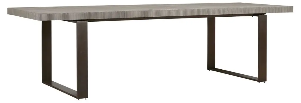 At home in a variety of decors, this extendable dining table is designed with an open bronze base and oak top that shows off a beautifully carved rim and prominent, expressive grain. Comfortably seats eight without the leaf and ten when fully extended.