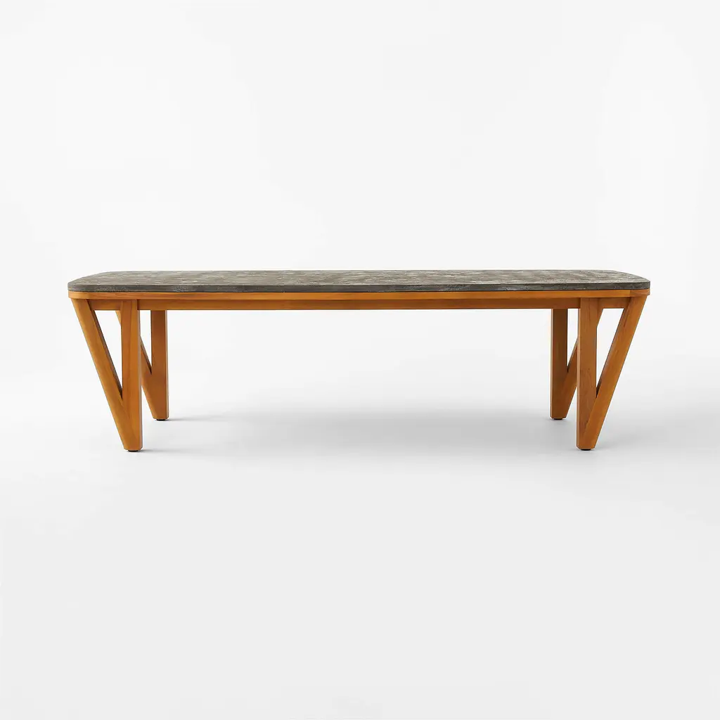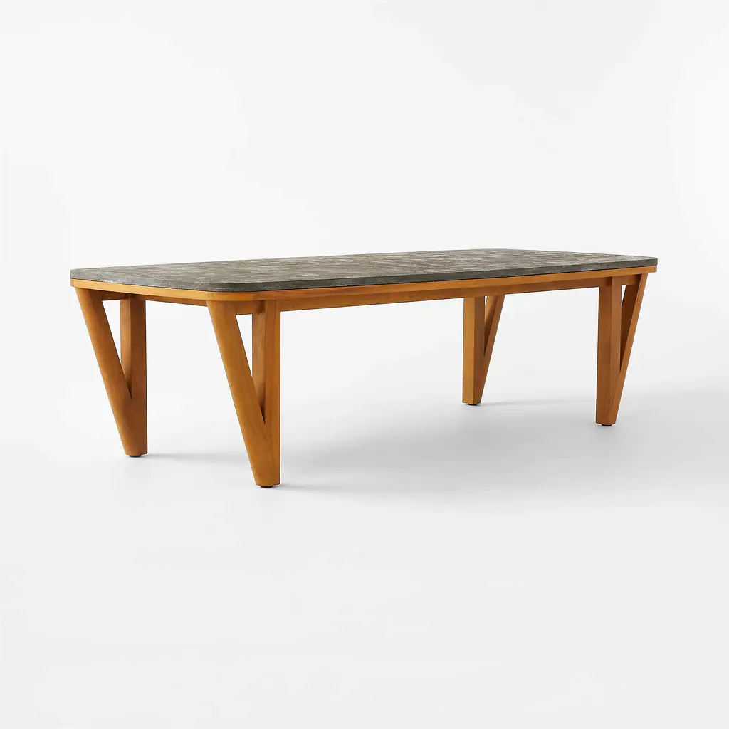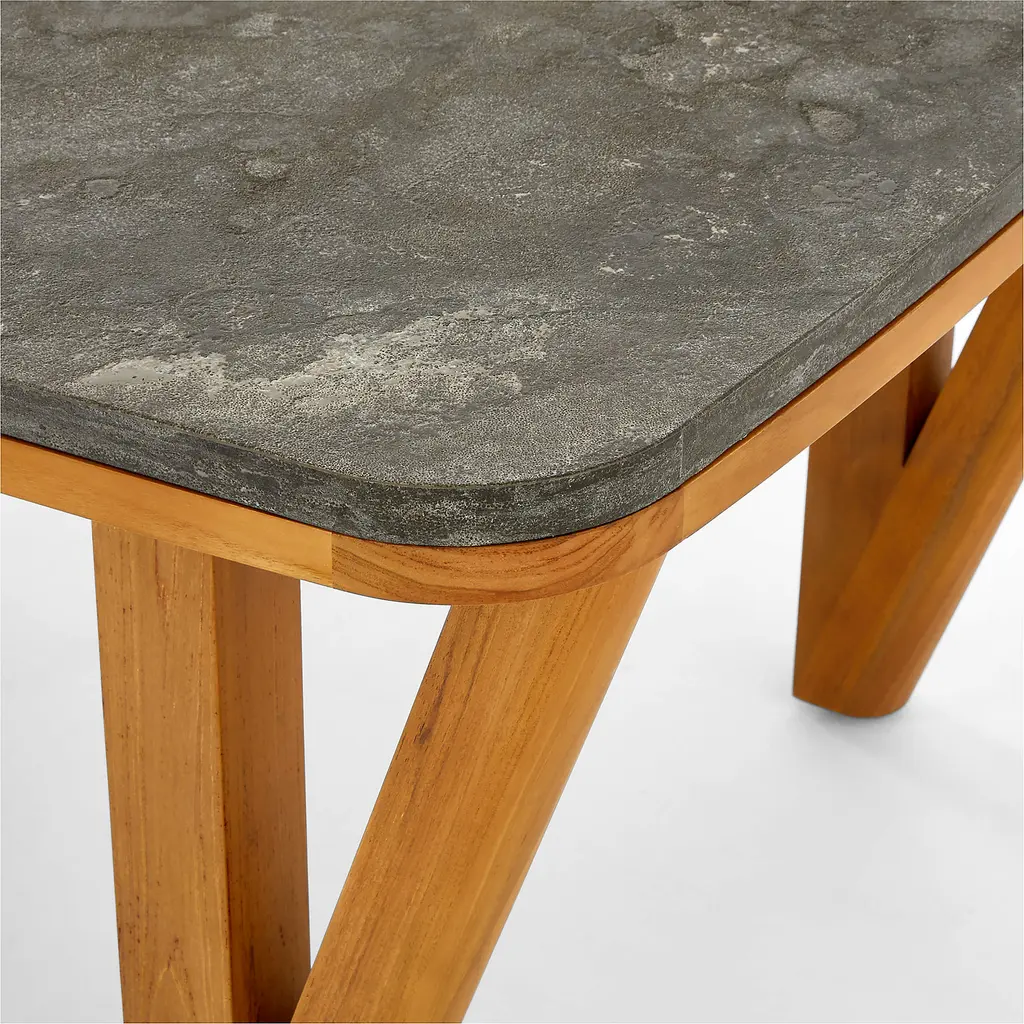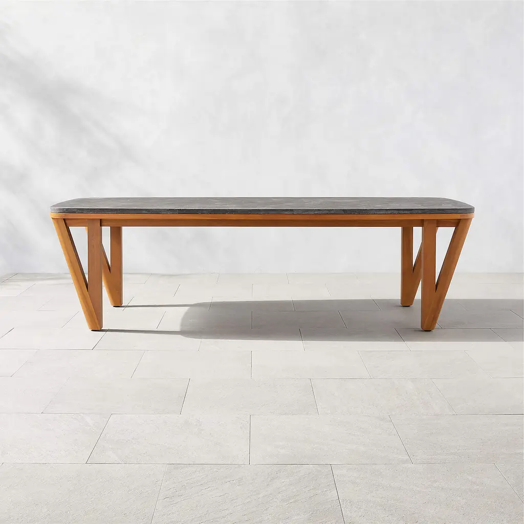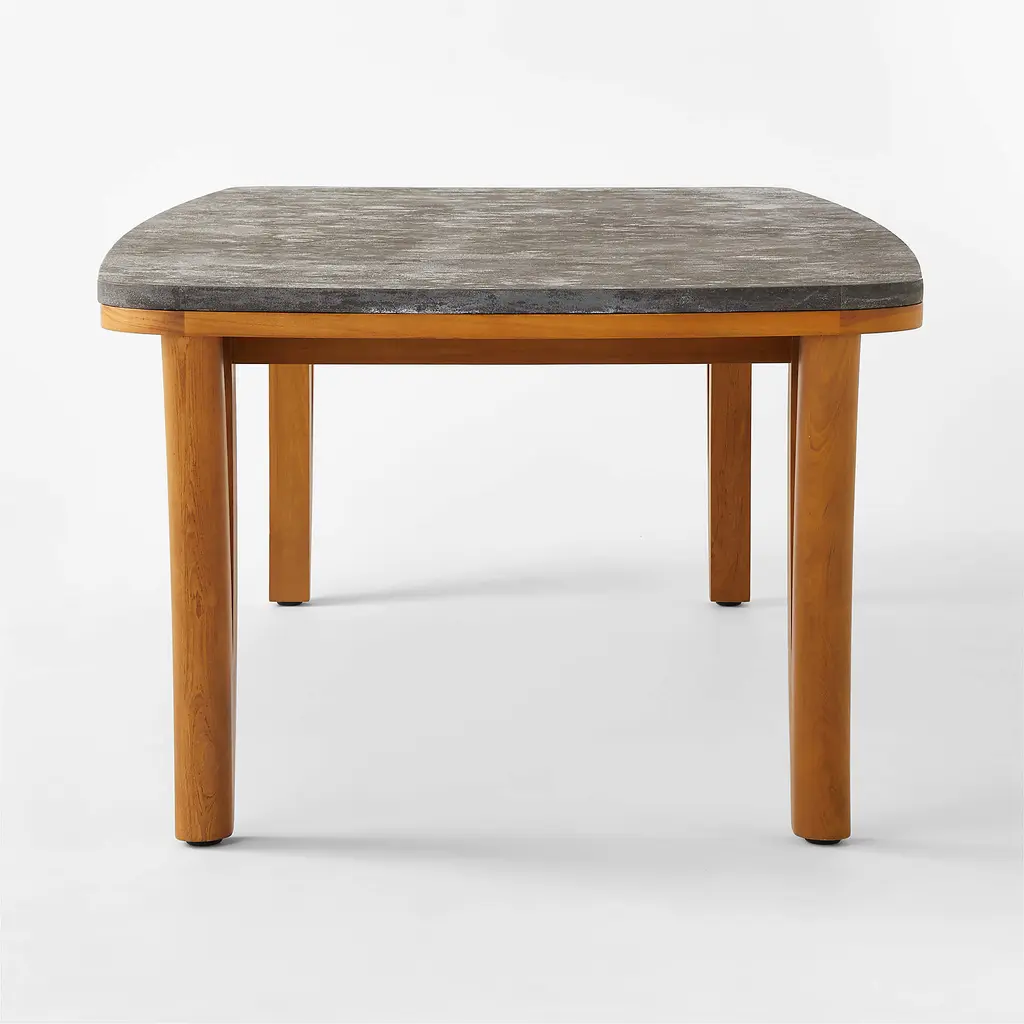 Stately outdoor dining table by Ross Cassidy combines the natural beauty of teak with a luxurious bluestone tabletop that can stand up to any outdoor soiree. Teak frame, certified sustainable by the Forest Stewardship Council ®, has a warm tone that may develop a gorgeous silvery-grey patina over time. The naturally filled Bluestone top undergoes an acid etching process that enhances the stone's surface, giving it a rich and sensual texture. Add the coordinating Roc Rattan and Teak Dining Chairs or Dining Bench to provide room for eight. CB2 exclusive. If left uncovered and untreated, natural teak will patina to a beautiful silvery grey.