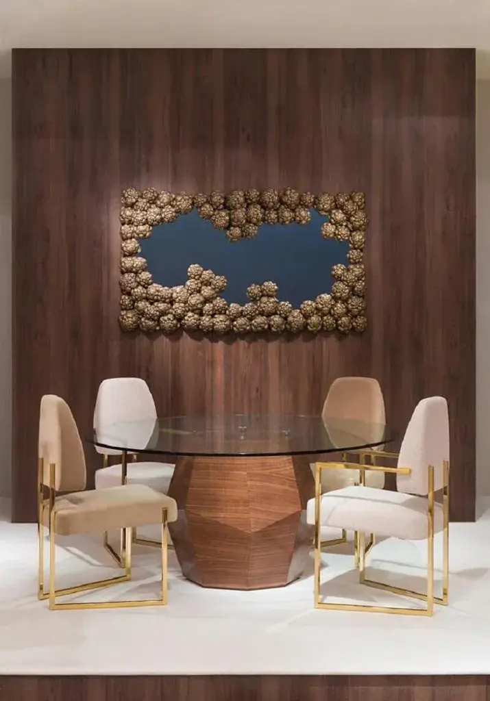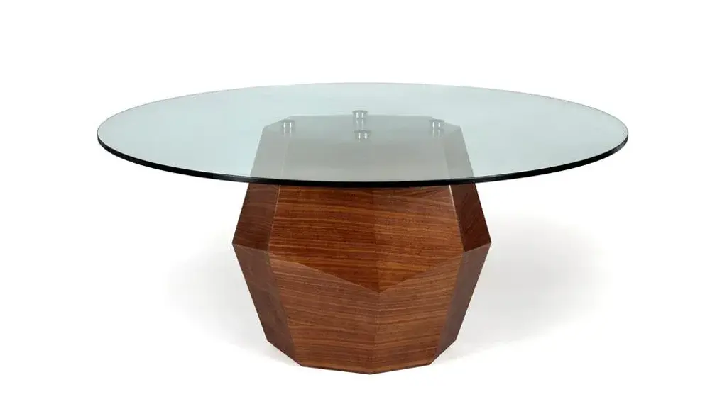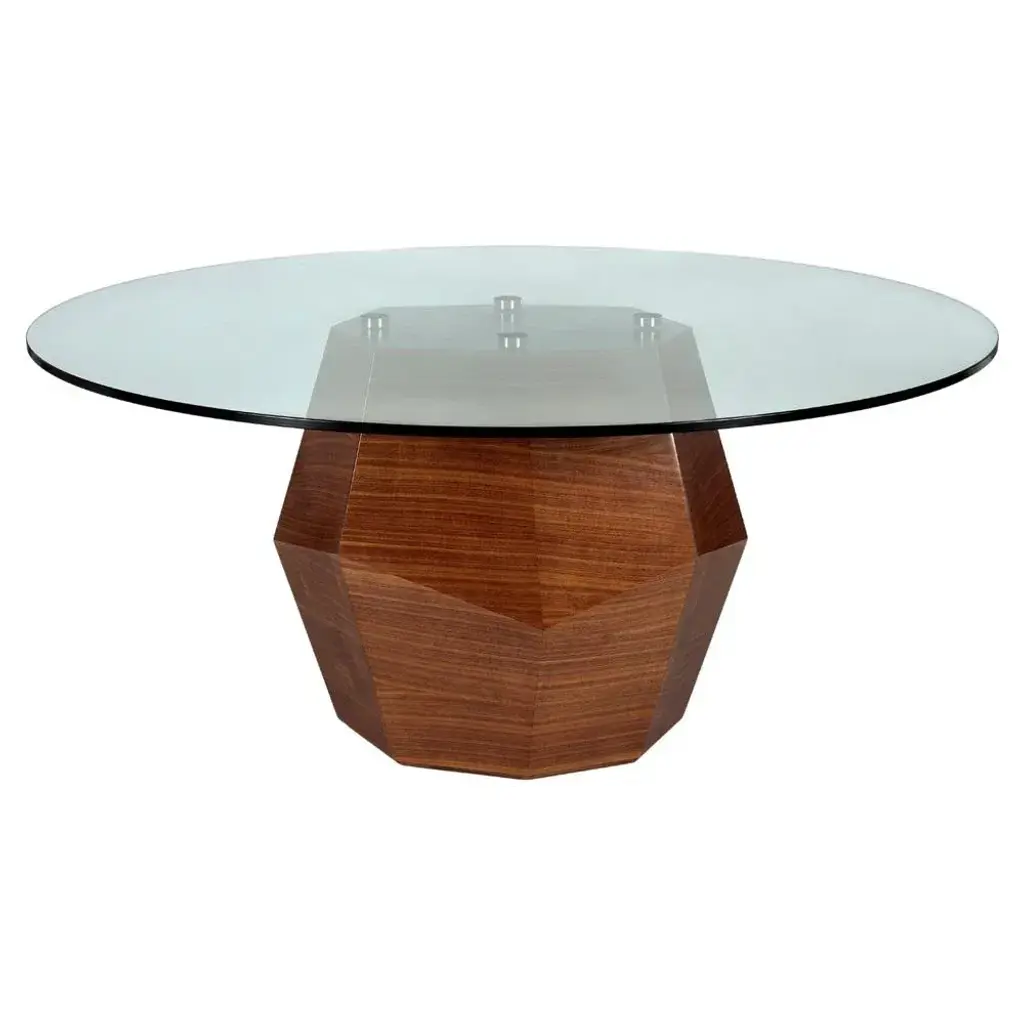 Rock Walnut Dining Table by InsidherLand Dimensions: D 160 x W 160 x H 74 cm. Materials: Glass, walnut veneer. 130 kg. The robust volume of Rock dining table entirely finished in walnut veneer on an elegant faceted work that resembles the irregular nature of rocks, descends from the original designs created on the Three Rocks set of center and side tables. Completed with a round top is in glass, the construction process is entirely involved with the skills of Portuguese artisans to achieve the singularity of an exceptional handmade central piece designed for the most distinctive interiors.