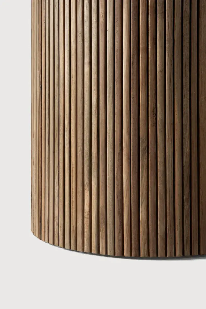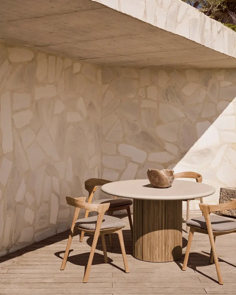 The Roller Max collection is remarkable in its design, distinguished with its stacked wood-stick effect. This outdoor dining table melds form with function in a natural and timeless way. Featuring a hand-finished concrete top, paired with a reclaimed solid teak base, a beautiful material mix provides durable practicality to both indoor and outdoor spaces.