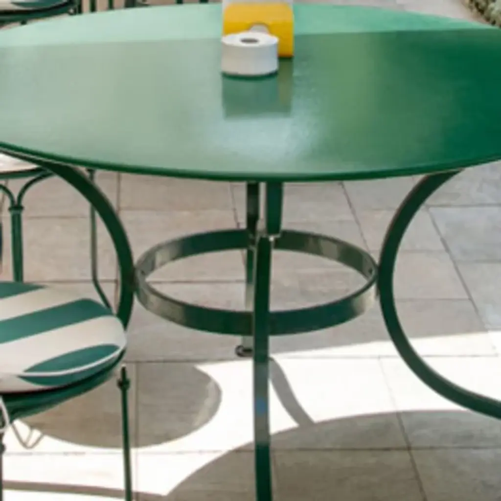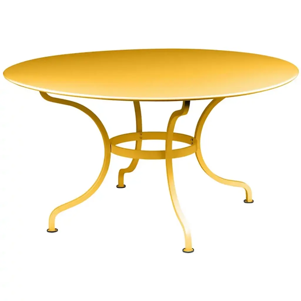 The Fermob Romane Round Table is a solid and sophisticated piece for elegant outdoor dining. Its base is comprised of 4 deeply curved, solid steel legs connected with a flat steel belt; it is topped by a round of solid sheet steel. Complements any outdoor decor with one of more than 20 finish colors.