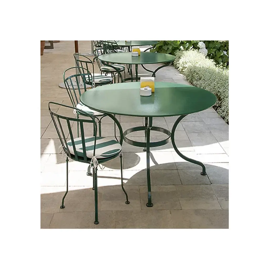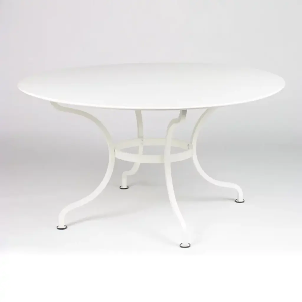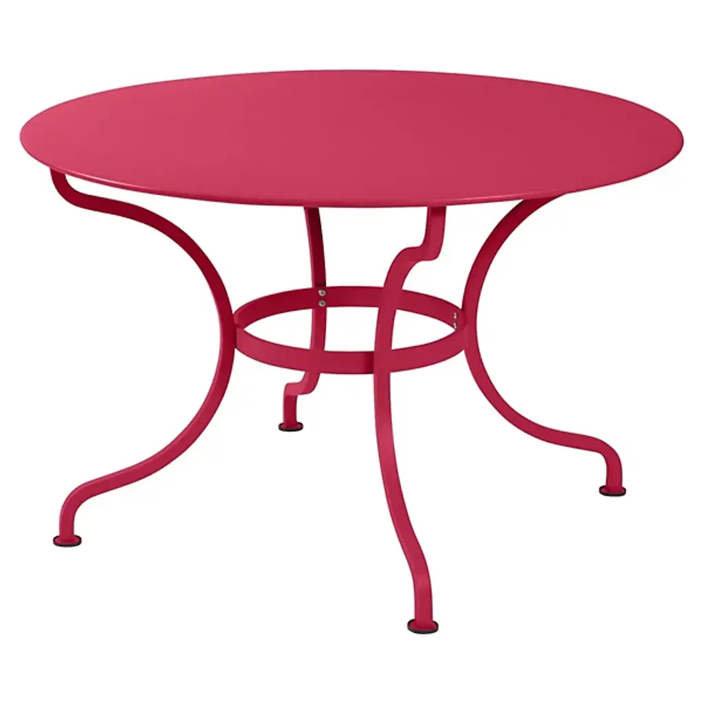 The Fermob Romane Round Table is a solid and sophisticated piece for elegant outdoor dining. Its base is comprised of 4 deeply curved, solid steel legs connected with a flat steel belt; it is topped by a round of solid sheet steel. Complements any outdoor decor with one of more than 20 finish colors.