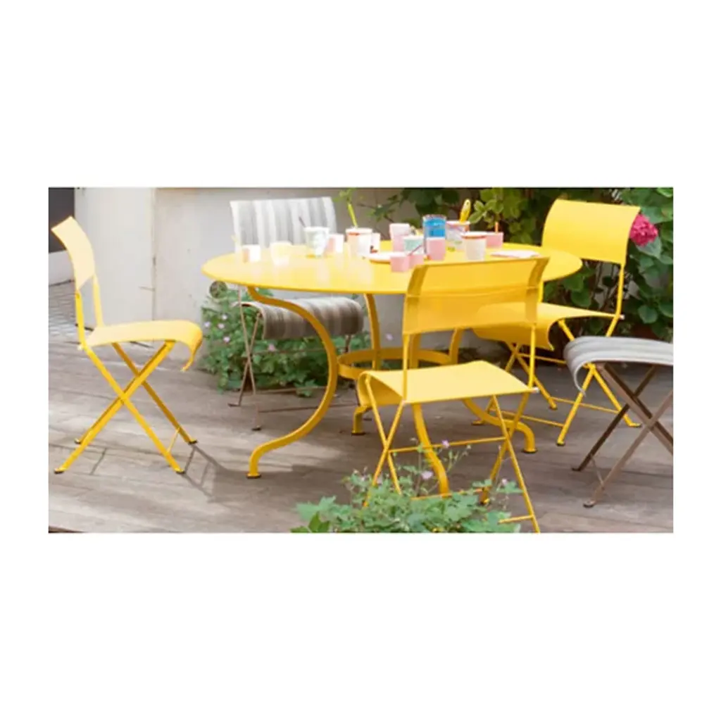 The Fermob Romane Round Table is a solid and sophisticated piece for elegant outdoor dining. Its base is comprised of 4 deeply curved, solid steel legs connected with a flat steel belt; it is topped by a round of solid sheet steel. Complements any outdoor decor with one of more than 20 finish colors.