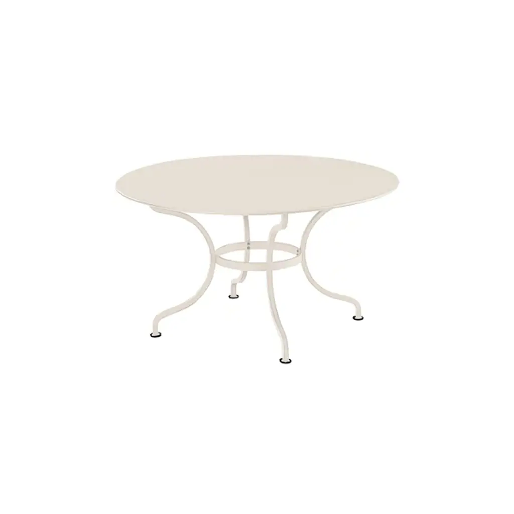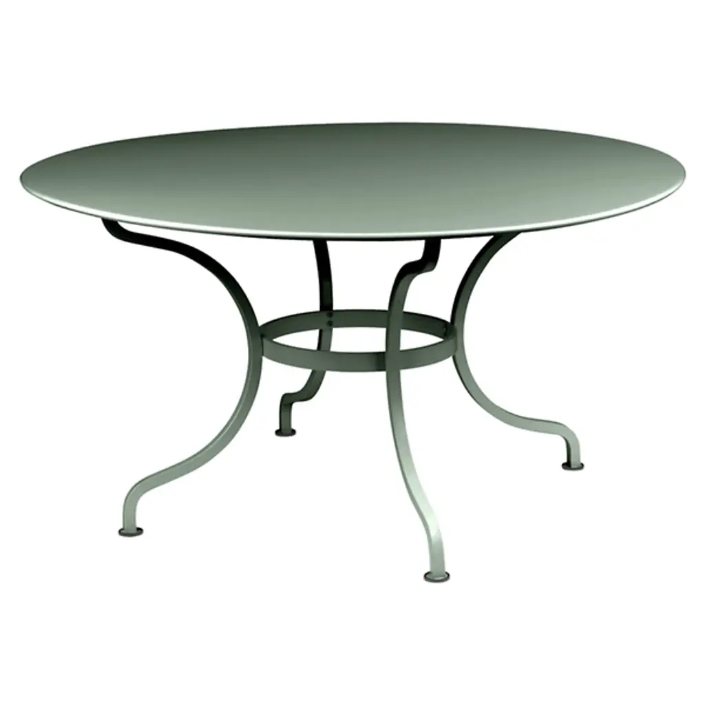 The Fermob Romane Round Table is a solid and sophisticated piece for elegant outdoor dining. Its base is comprised of 4 deeply curved, solid steel legs connected with a flat steel belt; it is topped by a round of solid sheet steel. Complements any outdoor decor with one of more than 20 finish colors.