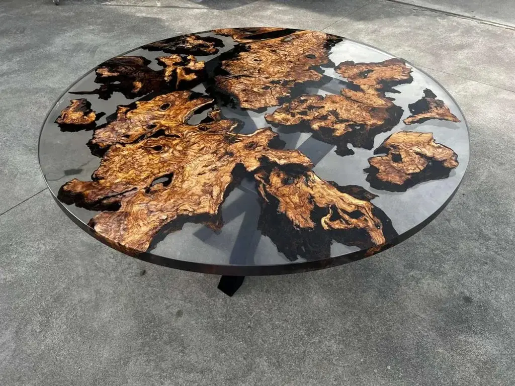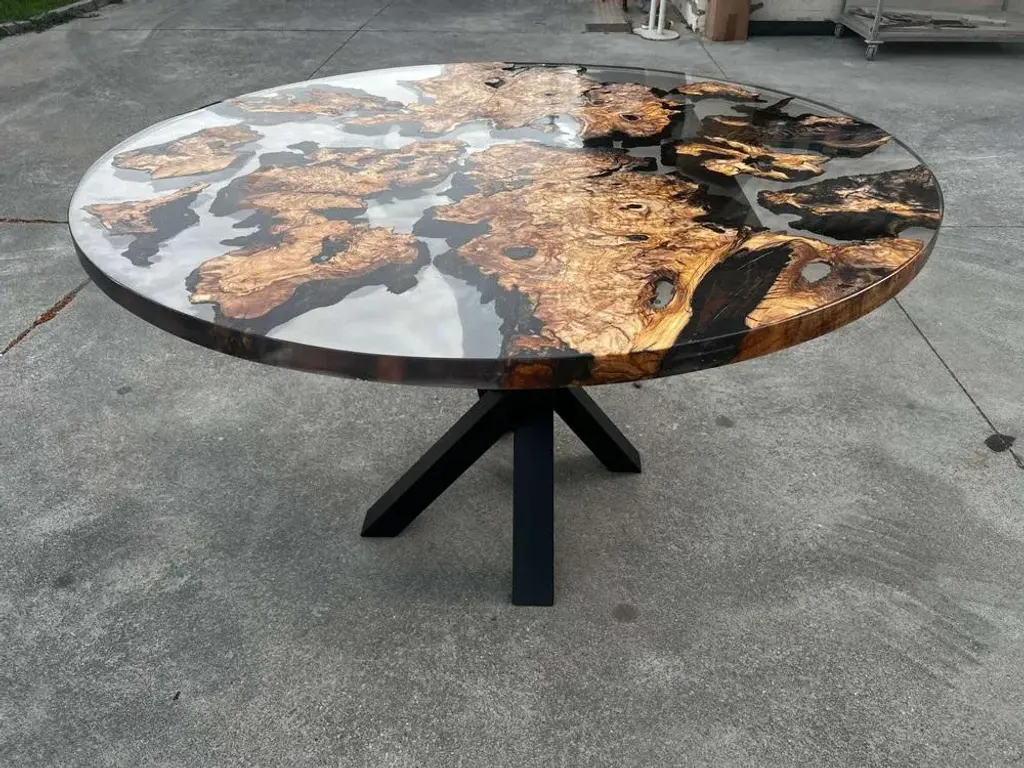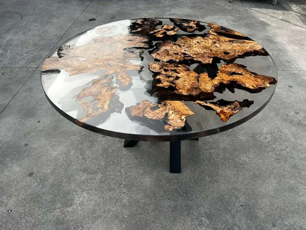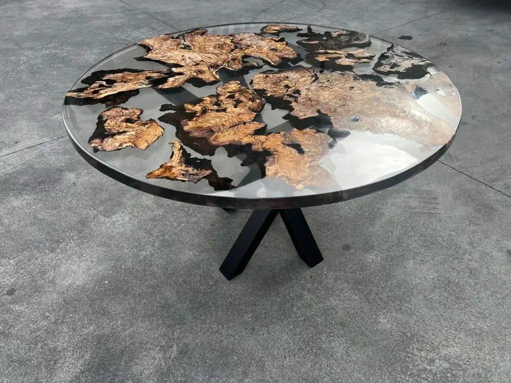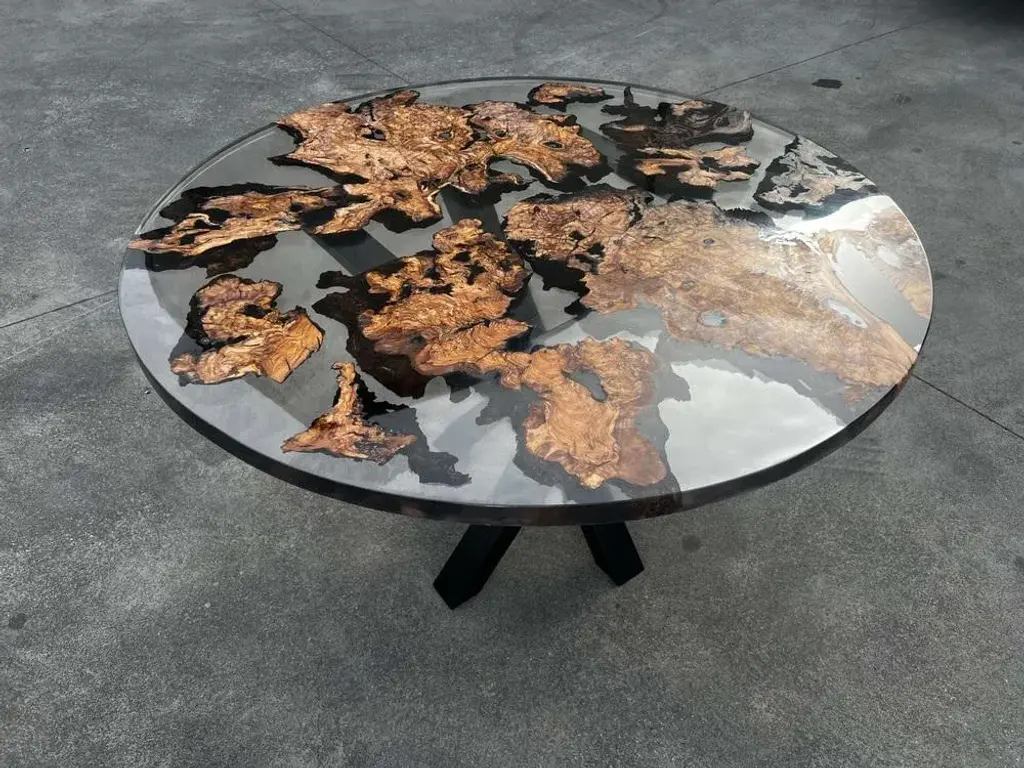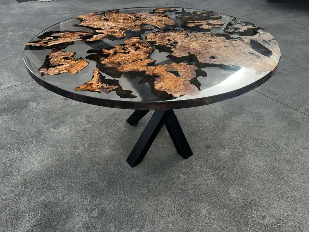 Rondò is a dining table made of wood and epoxy resin. in this river table are used i will eradicate from lecce and transparent epoxy resin and resin the top table is treated with cooked linseed oil that maintains the naturalness of the wood part, the resin is polished by hand. the spyder spyder wap model matchers are opaque black lacquered. each table of mine is made exclusively by hand, in italy, on commission and tailored to the customer. the proposed images concern a table already made. in case of order, a news table will be created on the basis of the rondò model. Signed by maker