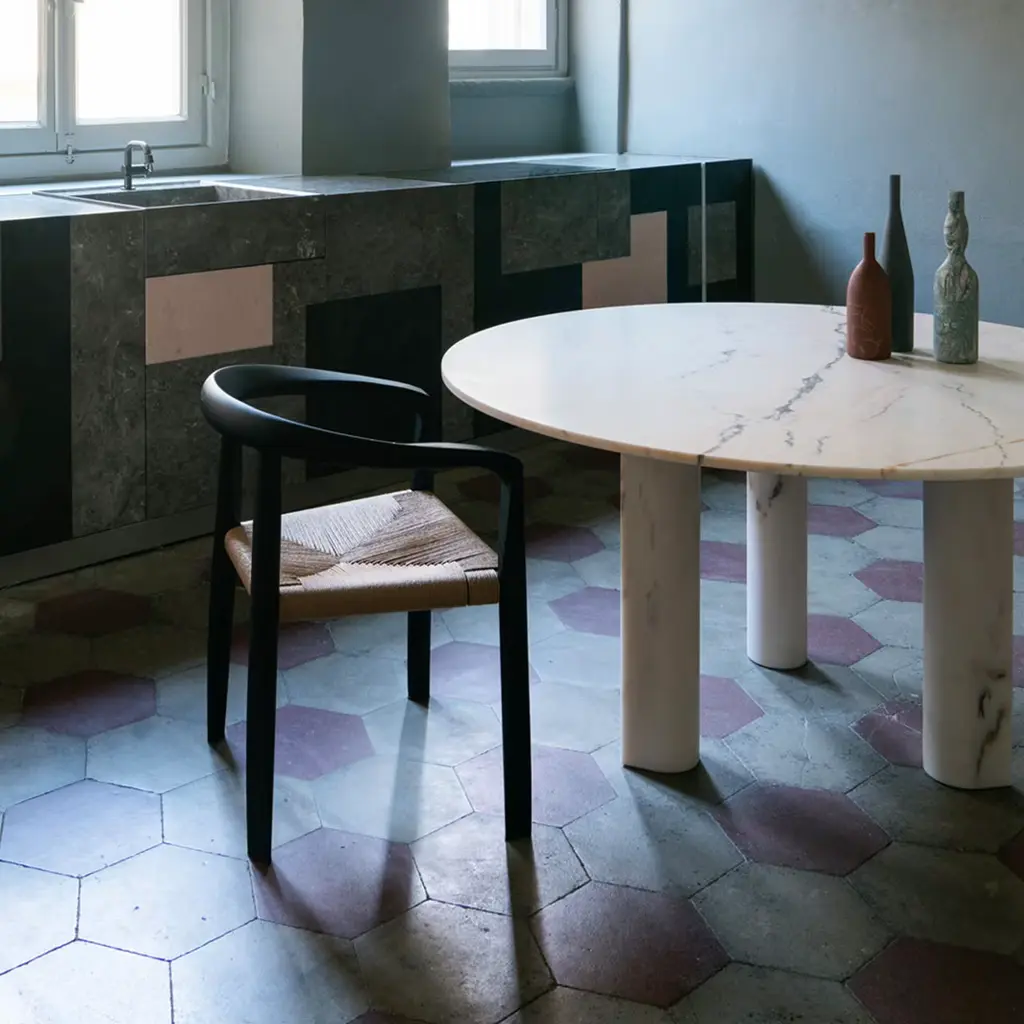 The Rosa Portogallo marble is the star of the show in the Lovemelovemenot Dining Table, designed by Michael Anastassiades to highlight the opulence of the marbles chosen for the collection. Instead of a highly polished finish, the designer chose a matt look which provides a more contemporary feel to the stone, highlighting the specific qualities through this subdued process.