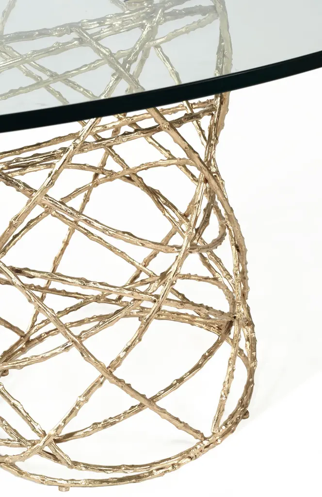 Rosebush Dining Table by Ginger & JaggerDimensions: Ø 120 x H 73 cm. Materials: Estremoz Glass and brass.Finish: Top in glass with clear finish; base in cast brass with brass finishing.This product is suitable for custom size. This product is made for living areas and interior spaces only. This product is not specified for bathrooms, spas, or humid environments. Not suitable for exteriors. Available in different finishes. Please contact us.Launched in Europe in 2012, Ginger & Jagger is a product design brand that prides itself on creating handcrafted high-end contemporary products inspired by Nature.Designed and produced in Porto, a land of craftsmen and age-old tradition, Ginger & Jagger’s Earth to Earth collection is an evocative poetic realm, where Nature’s sculptural shapes are made eternal through handcraft, with unique artisanal techniques and an outstanding blend of superb materials such as brass, silver and copper, marble and stone, and wood.The designer's compass is kept by an uncompromising desire for creative innovation balanced with the integrity of the materials, the artisanal techniques employed, and the brand's very own narrative element.The artisanal techniques availed range from brass casting, wood, and marble marquetry, hand-hammered metals, and hand-sculpted marble.Striving towards sustainability. Ginger & Jagger supports organizations worldwide, with contributions indexed to the products crafted every year.