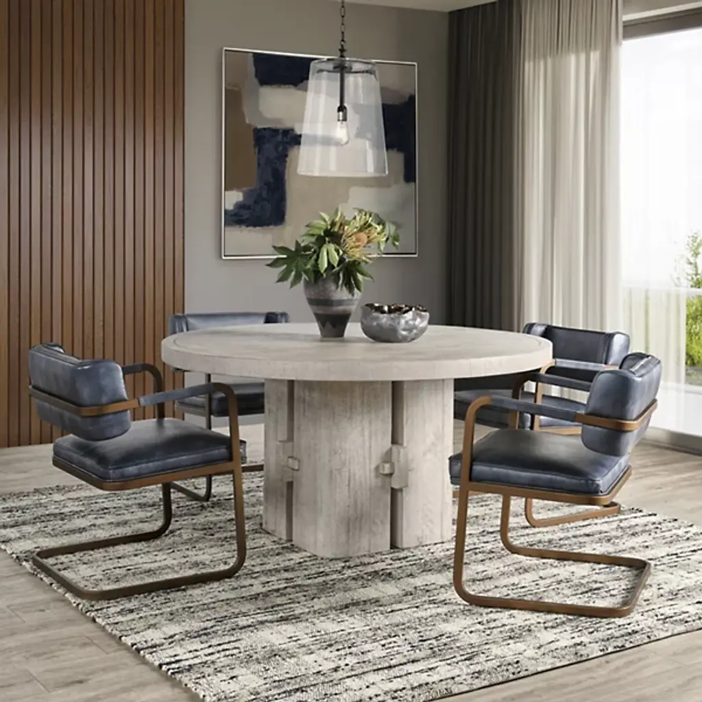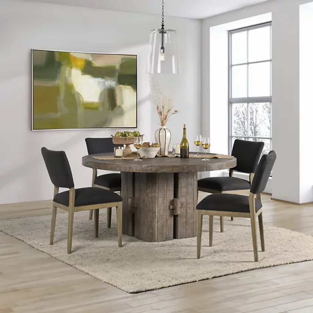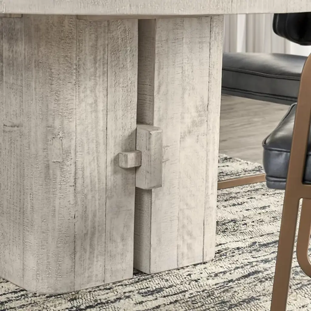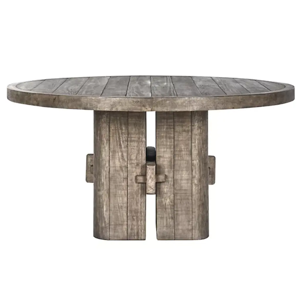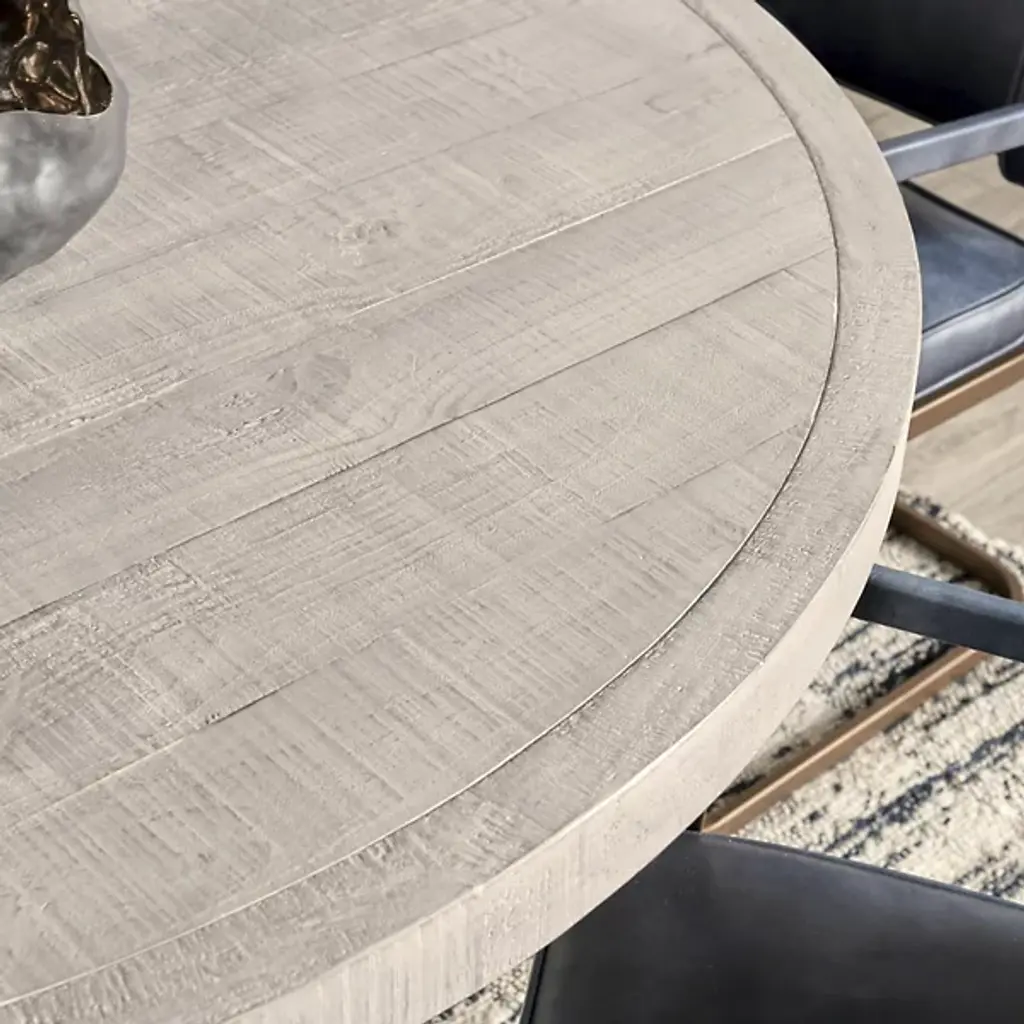 Transform your dining spaces with the Rosemount Dining Table from Classic Home. This striking piece features a distinctive base of gathered vertical beams supporting a round top, all crafted from FSC-certified reclaimed pine. The bold architectural design is distinctive, merging contemporary styling with rustic warmth, creating an unforgettable gathering place.