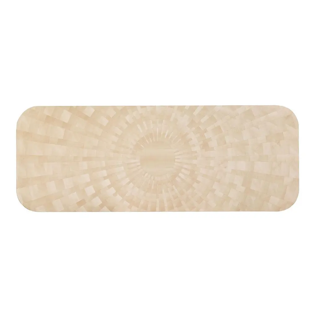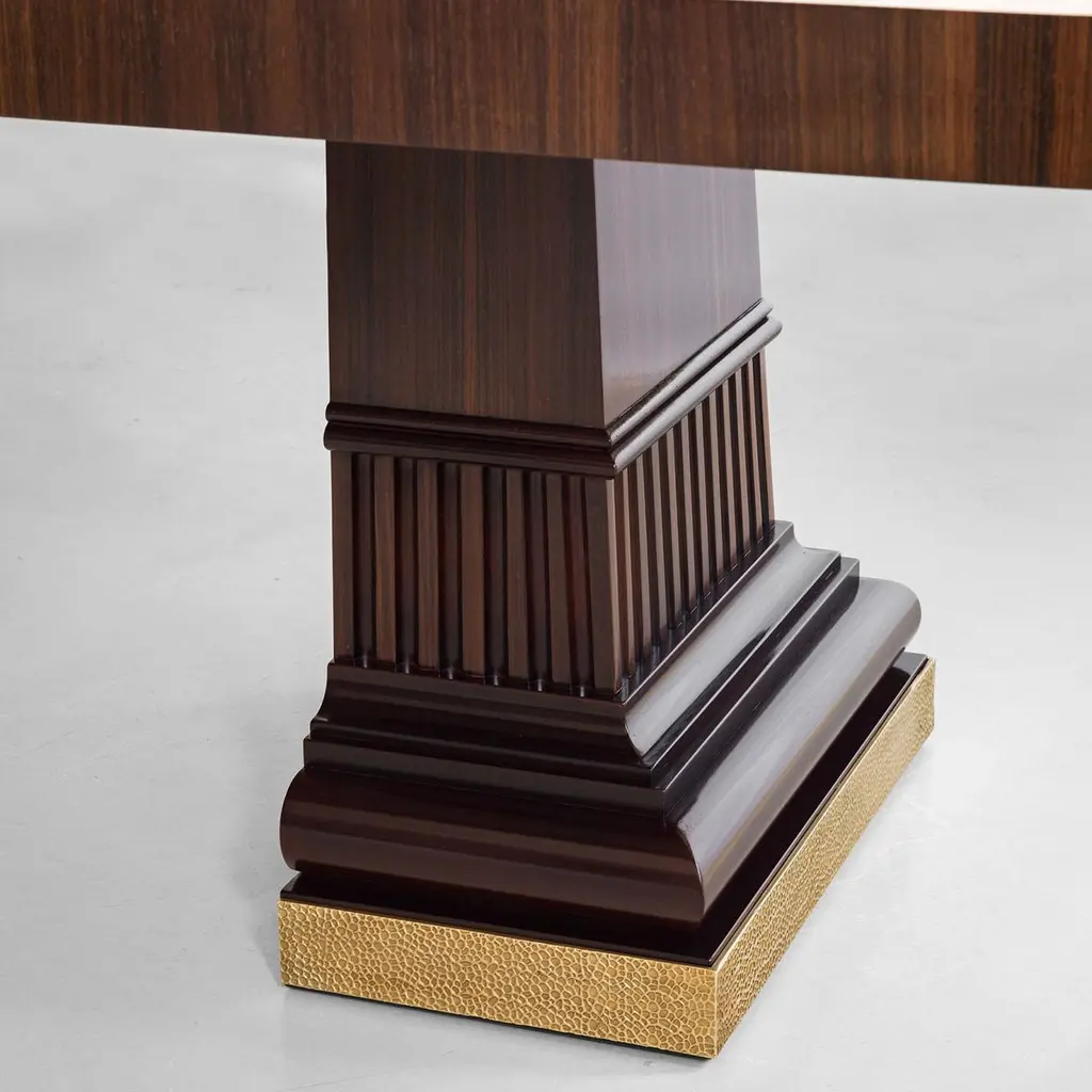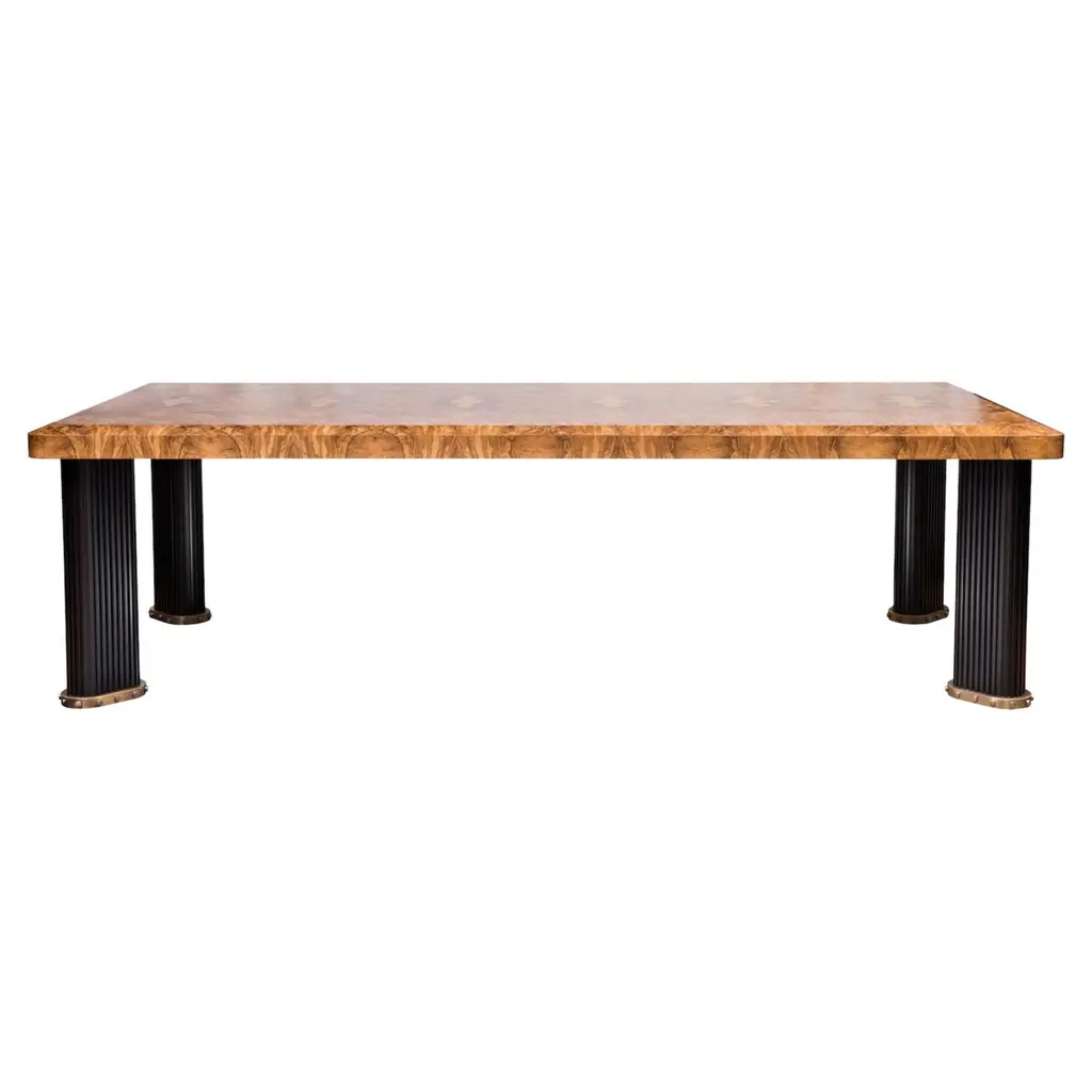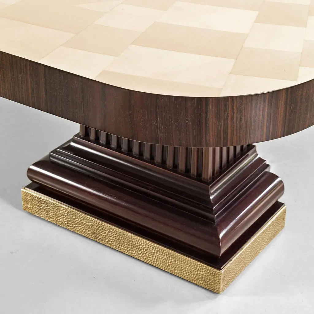 Dining table with inlaid natural maple top and solid rosewood and mahogany pedestals.
