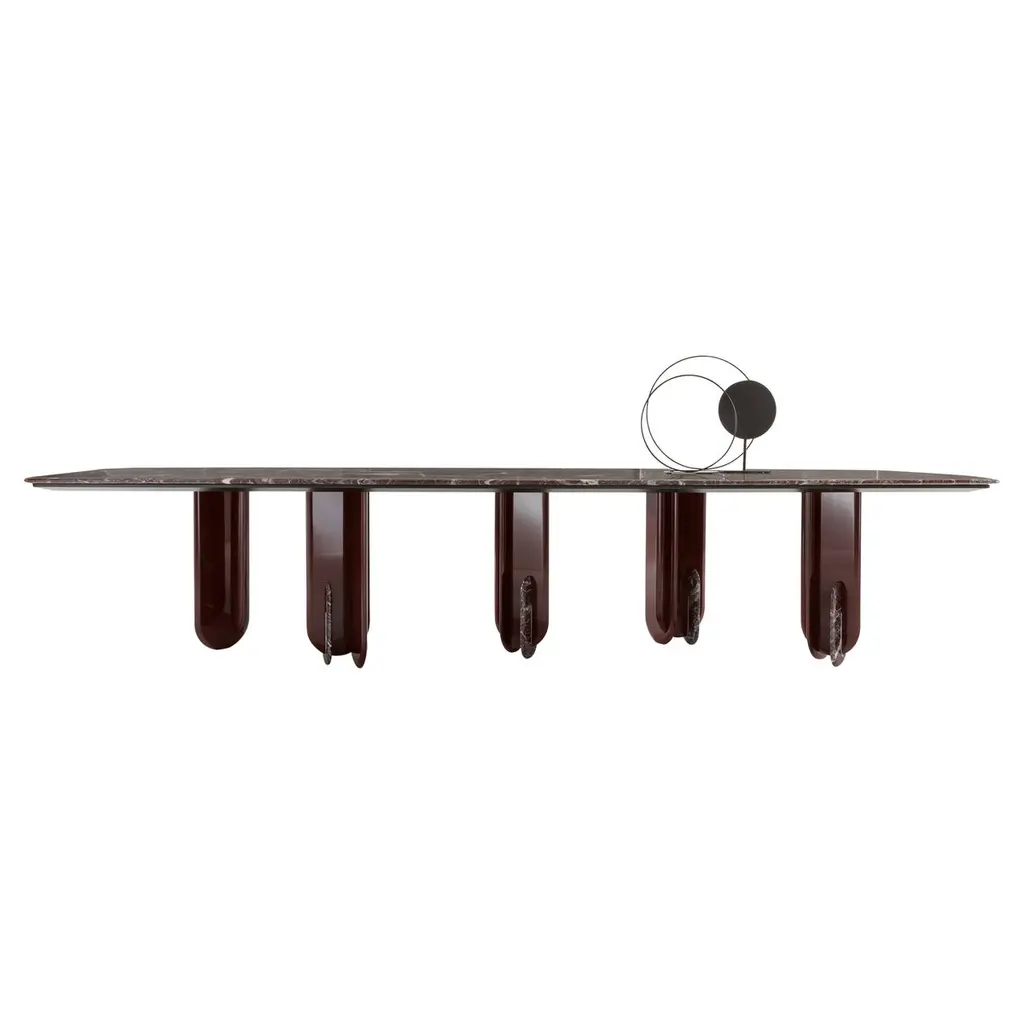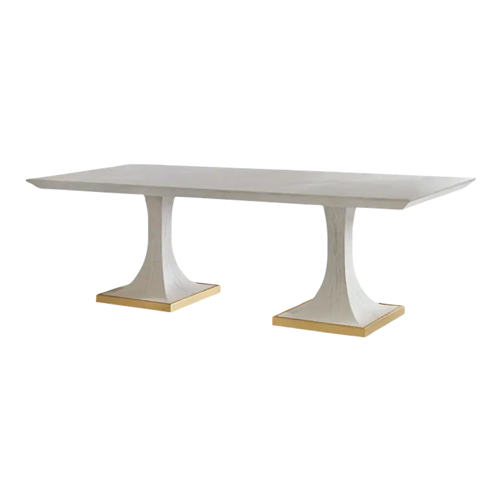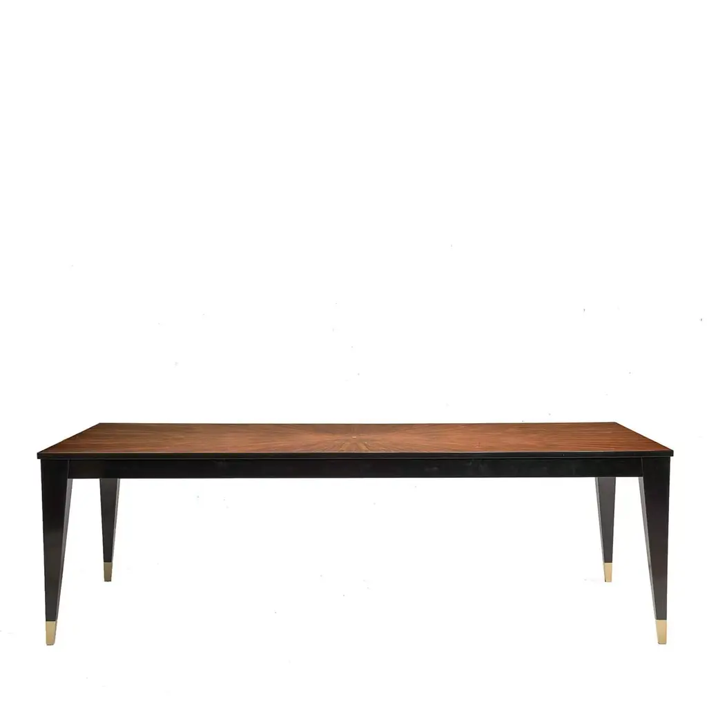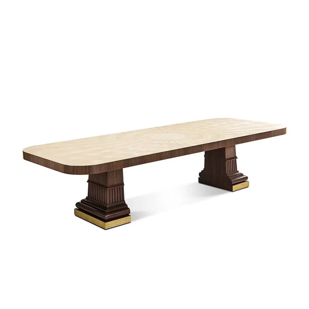 Dining table with inlaid natural maple top and solid rosewood and mahogany pedestals.