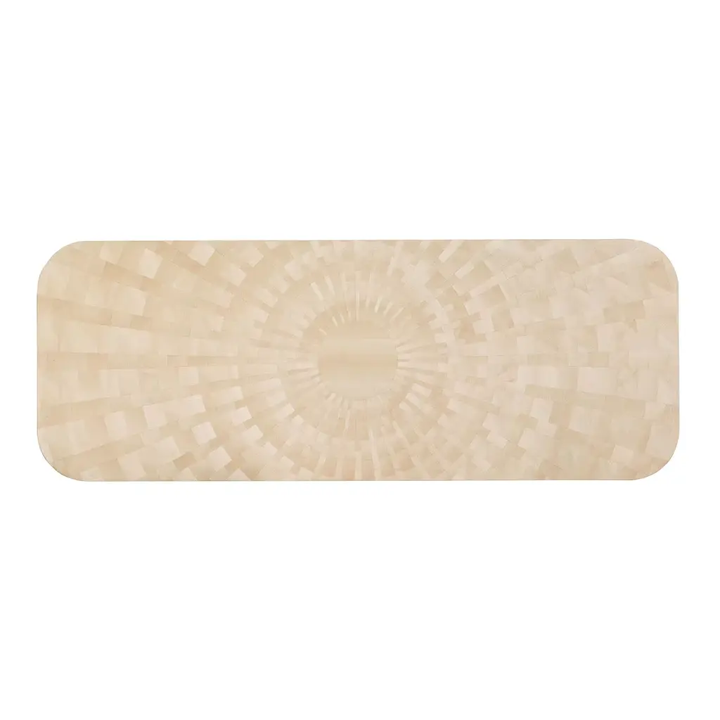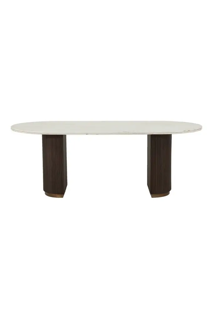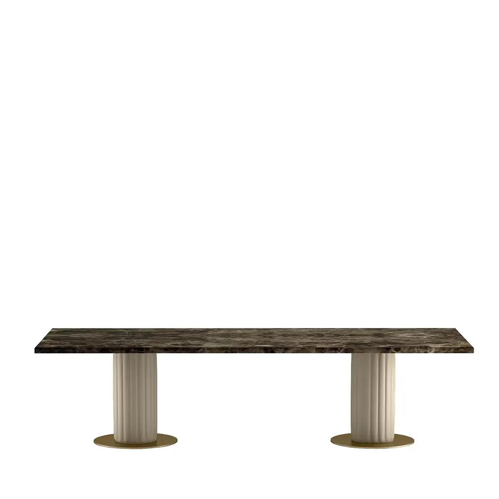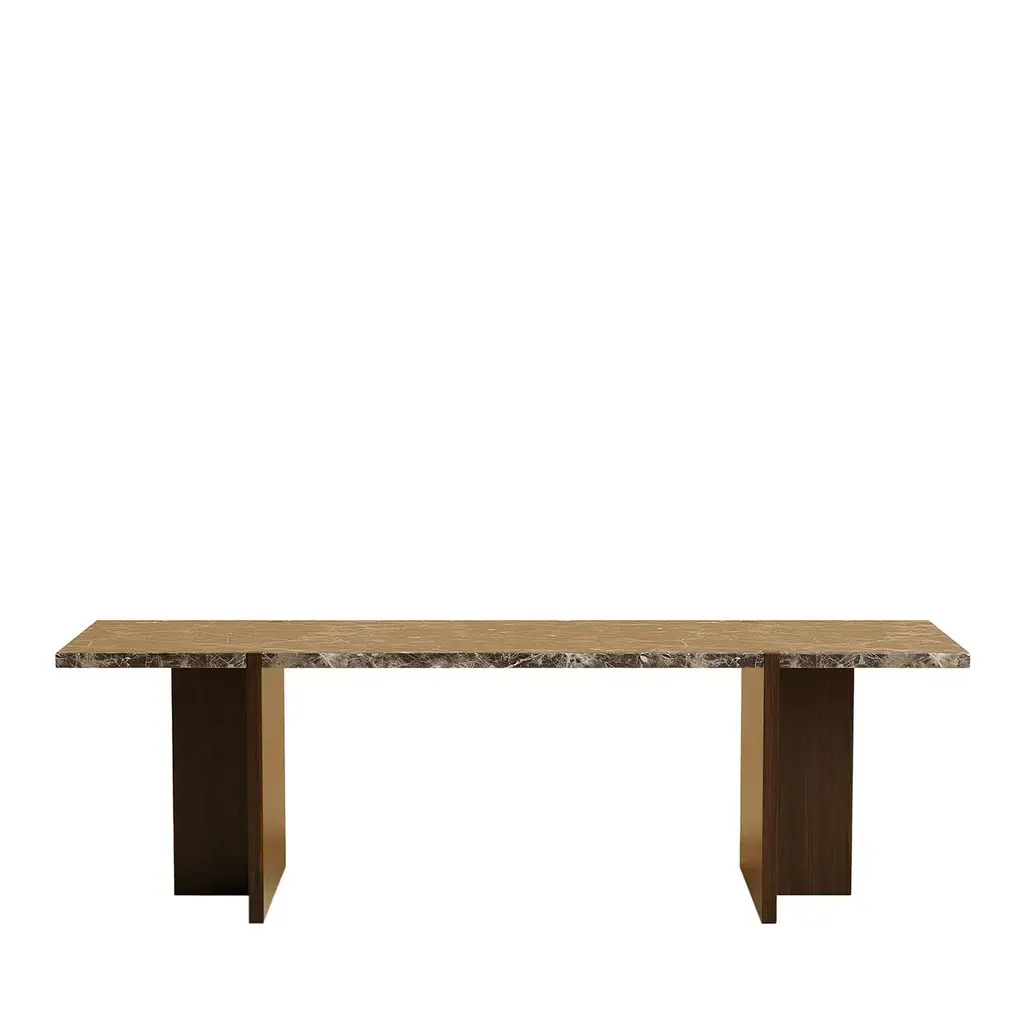 Dining table with inlaid natural maple top and solid rosewood and mahogany pedestals.