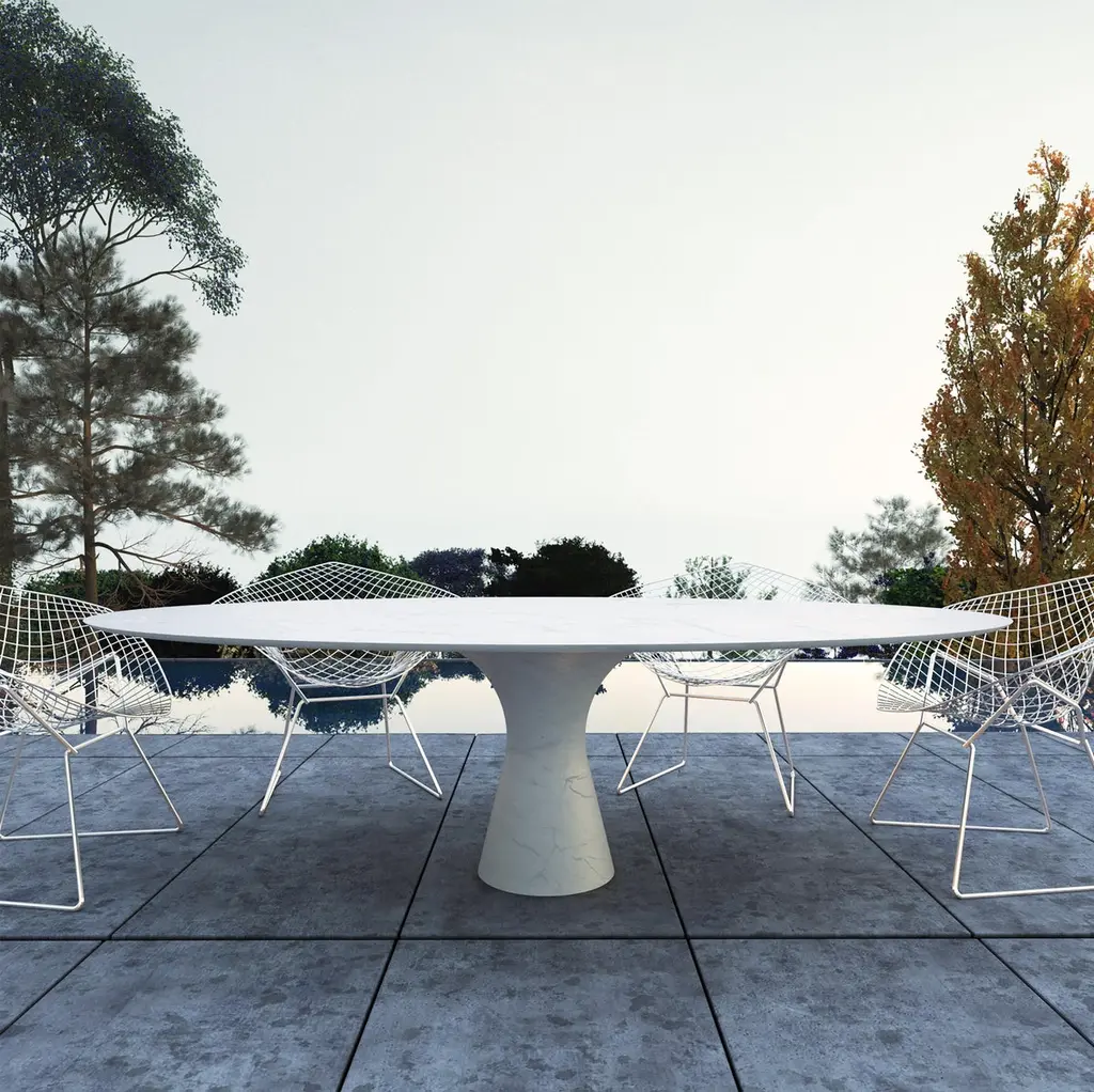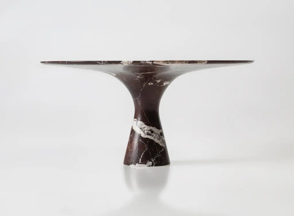 Rosso Lepanto refined contemporary marble dining table 250/75Dimensions: 250 x 160 x 75 cmMaterials: Rosso Lepanto marble.Angelo is the essence of a round table in natural stone, a sculptural shape in robust material with elegant lines and refined finishes.The collection consists of a round/oval dining or conference table, side tables and lower tables.Suitable for both indoor and outdoor use!All tables are made by order and finished by hand to be sure that the tabletop and base become one pieceThe basic collection consists of 9 different marbles and different standard dimensions, however on request we make to measure.Almost any size or marble is possible!All tables are signed and numbered (the low and side tables are only signed).All tables are impregnated with Lithofin Nanotop. This protection is not visible and the marble keeps its natural look and feel. With the delivery of every table, a maintenance set of Lithofin is included.The production time is standard 12 weeks.The design Angelo is the essence of a round or oval table in natural stone, it features a sculptural form, sturdy material, an elegant line and a refined finish. Two elements, table base and top, form one whole together. The bottom is one running curve from table foot to edge. The conical connection creates a stabile whole.To show the marble in it’s most expressive character, different finishes are possible (polished, honed, brushed, striped, sandblasted & brushed). The basic collection consists of nine different types of marble and different sizes. On request this design can be executed in almost any type of marble and on measure. This table is perfectly suitable in a housing, retail or office environment. As the table is supported by one central foot it creates a lot of flexibility in seating. Executed in hard variations of natural stone suited for external use, this design can be a perfect garden table or sculpture.Angelo M/R 130 : ø 130 x 75 cmAngelo M/R 160 : ø 160 x 75 cmAngelo M/R 180 : ø 180 x 75 cmAngelo M/O 210 : 210 x 135 x 75 cmAngelo M/O 250 : 250 x 160 x 75 cmAngelo M/O 290 : 290 x 160 x 75 cm The basic collection is available in the following marbles: Kyknos, Grafite, Travertino Rosso, grey saint Laurent, Picasso green, port saint Laurent, Travertino silver, Rosso Lepanto and Bianco Statuarietto in a honed finish. On request different sizes, finishes and marbles are possible. AwardsGood Design Award – Chicago, USA (2018)People’s Choice, AZ Award – Toronto, Canada (2019)German Design Award – Frankfurt, Germany (2020).