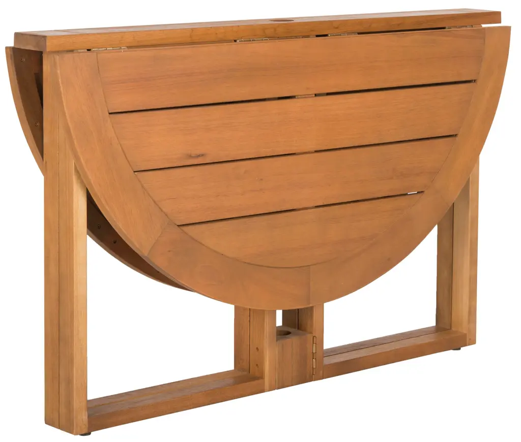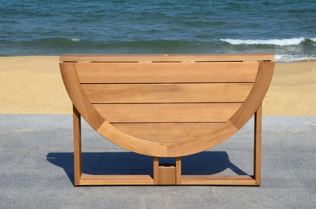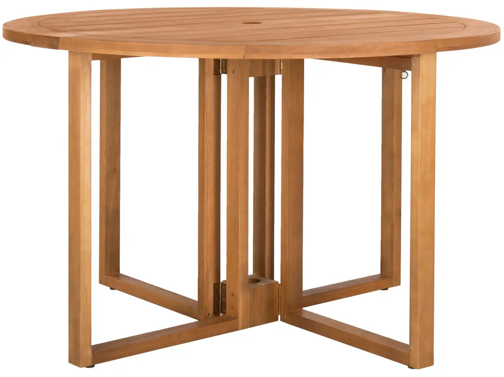 an exotic resort inspired this contemporary 47.24-inch round dining table. Crafted in a natural hue, it's bold geometric style blends into any outdoor living area. Ideal for entertaining at extended family gatherings or a candlelit dinner for two. Store outdoor furniture indoors or cover well when not in use. Remove wooden furniture from standing water. Dust regularly with small brush or vacuum. Spills should be taken care of immediately before they harden or stain with a slightly dampened sponge. Do not use bleach solutions. Some assembly required.