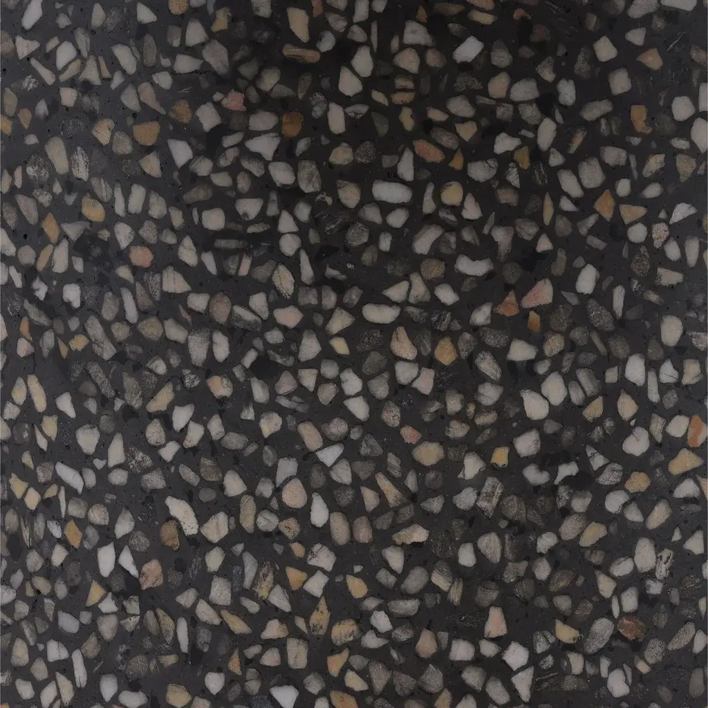Black finish concrete terrazzo outdoor round dining table with pedestal base. Modern simple design. Each will have natural variations in terrazzo appearance. Weight is approx. 245 lbs.
