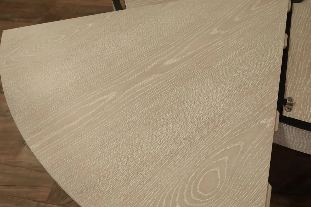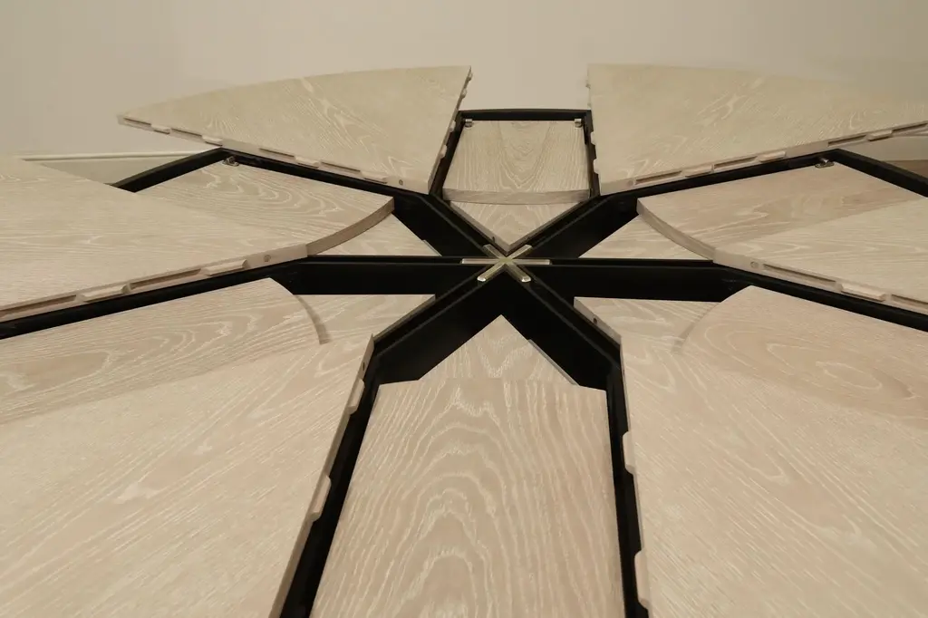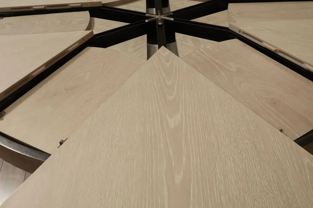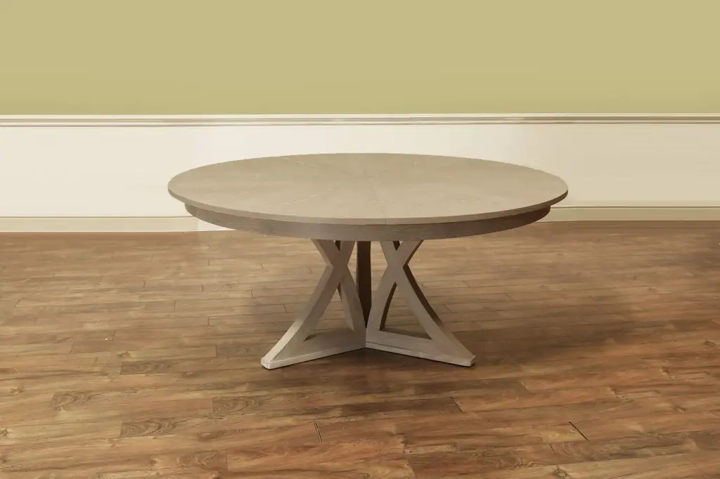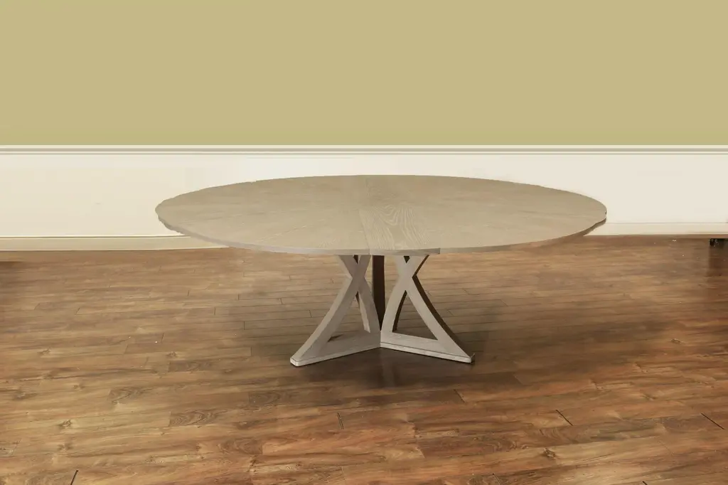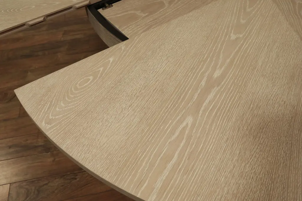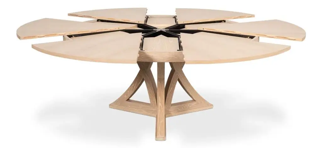 66-86 Inch Round Jupe Table with a Natural Finish, a bleached oak expandable dining table that easily opens from 66 inches to 86 inches round. Transitional pedestal table.. Measurements: 66" Round to 86" Round, 30" High