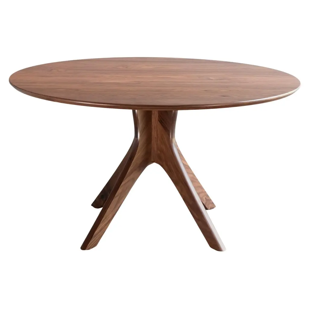 Our "Kapok" round dining table fits seamlessly into any dining room or kitchen decor style. With mid century modern good looks and solid hardwood construction this dining table adds timeless beauty that you'll love and your guests will admire.The pedestal table base with stylishly curved legs allows for ample leg room even when seating large groups around the table. AVAILABLE TABLE SIZES:- 30 inch table seats 2 to 3- 36 inch table seats 3 to 4- 42 inch table seats 4 to 5- 46 inch table seats 5 to 6- 54 inch table seats 6 to 7. PLEASE NOTE: This size requires additional delivery time of 2-3 weeks.- 60 inch table seats 7 to 8. PLEASE NOTE: This size requires additional delivery time of 2-3 weeks.- 70 inch table seats 8 to 10. PLEASE NOTE: This size requires additional delivery time of 2-3 weeks.TABLE FEATURES-Table is approx. 30" high.-Solid hardwood construction.-Time-honored mortise and tenon joinery.-Commercial grade worry-free finish (satin) allows easy water cleanup.-Ships with the base detached and easy assembly instructions included.Our craftspeople bring over 80 years of experience to every piece we make. We use all of this expertise to exceed your expectations for quality and customer service. Meet our team and check out our studio at Nathan Hunter Design on the web.Your round dining table is meticulously handmade for you in your choice of solid cherry, walnut, oak or mahogany wood (shown here in walnut). Your table gets its color from the natural beauty of the wood, not stains or dyes.And you never have to worry about spills and stains on the wood as our dining tables feature a commercial grade worry-free finish (satin) that allows easy water cleanup.