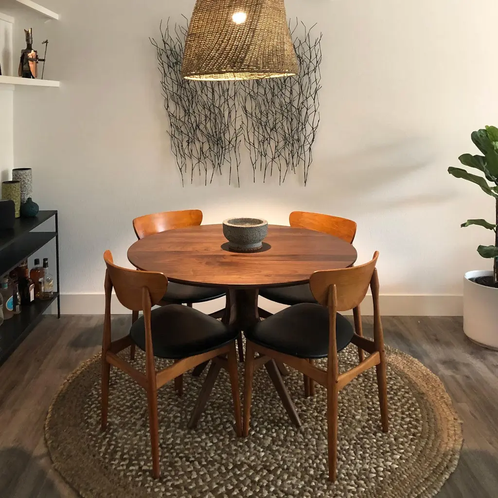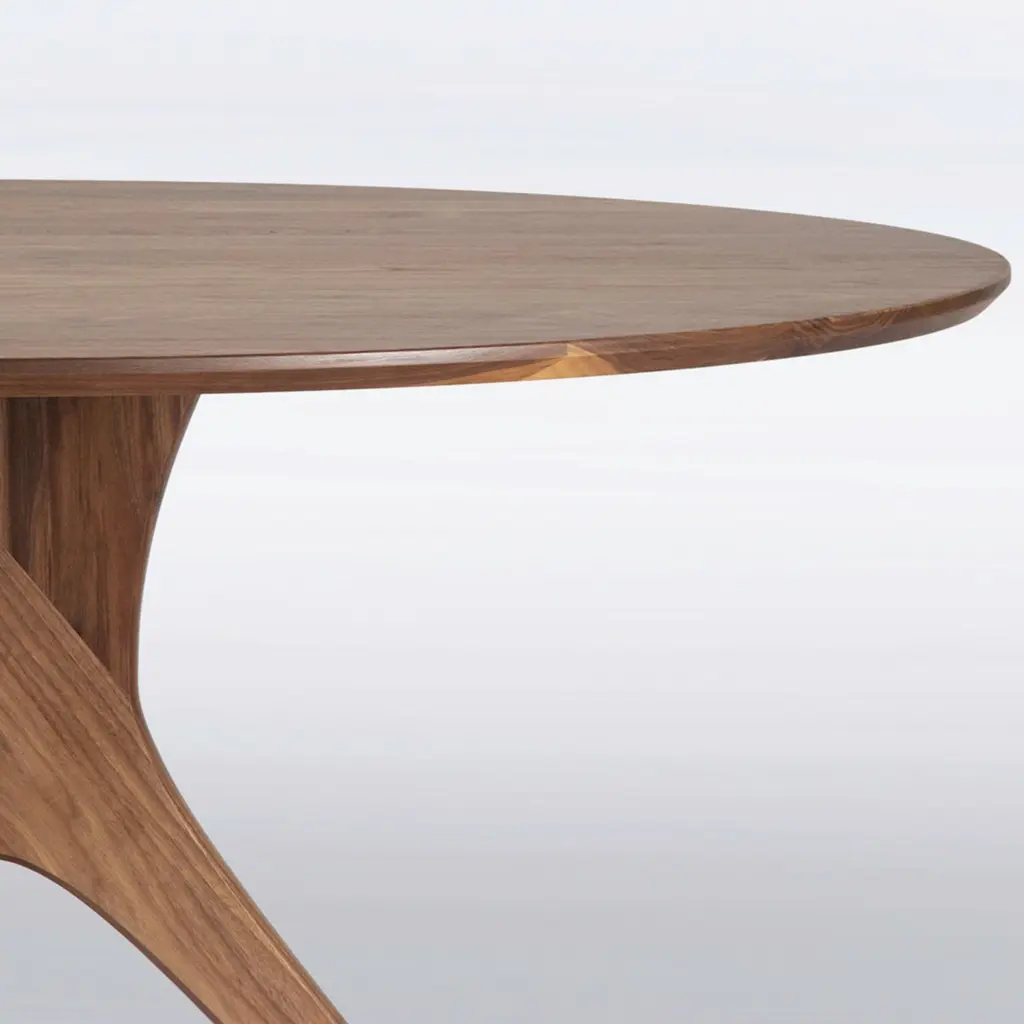 Our "Kapok" round dining table fits seamlessly into any dining room or kitchen decor style. With mid century modern good looks and solid hardwood construction this dining table adds timeless beauty that you'll love and your guests will admire.The pedestal table base with stylishly curved legs allows for ample leg room even when seating large groups around the table. AVAILABLE TABLE SIZES:- 30 inch table seats 2 to 3- 36 inch table seats 3 to 4- 42 inch table seats 4 to 5- 46 inch table seats 5 to 6- 54 inch table seats 6 to 7. PLEASE NOTE: This size requires additional delivery time of 2-3 weeks.- 60 inch table seats 7 to 8. PLEASE NOTE: This size requires additional delivery time of 2-3 weeks.- 70 inch table seats 8 to 10. PLEASE NOTE: This size requires additional delivery time of 2-3 weeks.TABLE FEATURES-Table is approx. 30" high.-Solid hardwood construction.-Time-honored mortise and tenon joinery.-Commercial grade worry-free finish (satin) allows easy water cleanup.-Ships with the base detached and easy assembly instructions included.Our craftspeople bring over 80 years of experience to every piece we make. We use all of this expertise to exceed your expectations for quality and customer service. Meet our team and check out our studio at Nathan Hunter Design on the web.Your round dining table is meticulously handmade for you in your choice of solid cherry, walnut, oak or mahogany wood (shown here in walnut). Your table gets its color from the natural beauty of the wood, not stains or dyes.And you never have to worry about spills and stains on the wood as our dining tables feature a commercial grade worry-free finish (satin) that allows easy water cleanup.