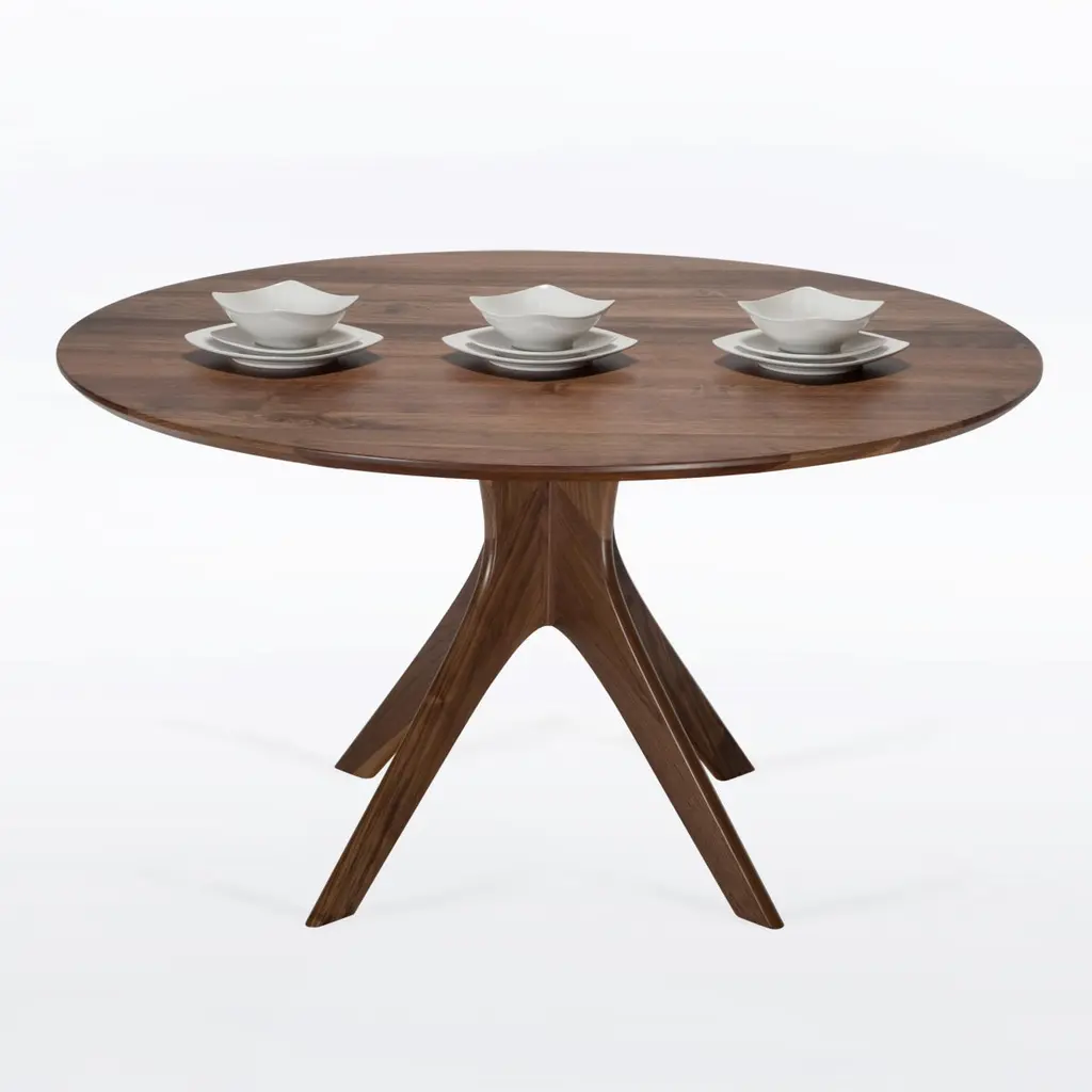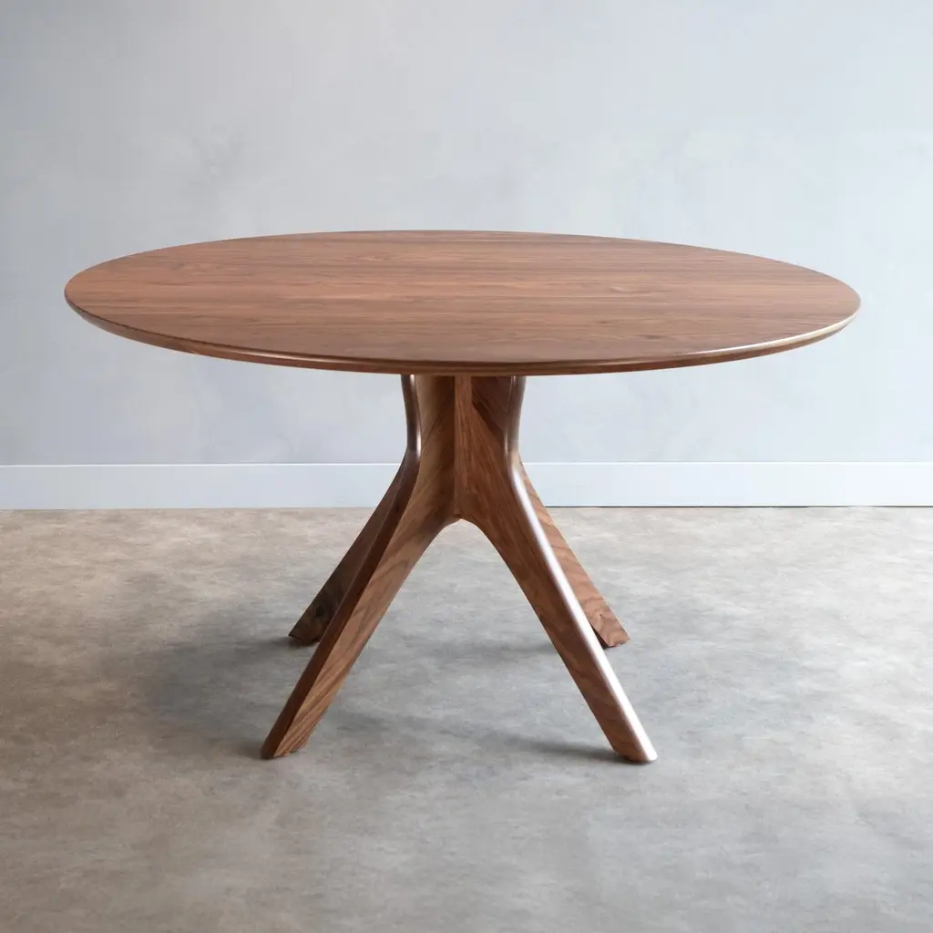 Our "Kapok" round dining table fits seamlessly into any dining room or kitchen decor style. With mid century modern good looks and solid hardwood construction this dining table adds timeless beauty that you'll love and your guests will admire.The pedestal table base with stylishly curved legs allows for ample leg room even when seating large groups around the table. AVAILABLE TABLE SIZES:- 30 inch table seats 2 to 3- 36 inch table seats 3 to 4- 42 inch table seats 4 to 5- 46 inch table seats 5 to 6- 54 inch table seats 6 to 7. PLEASE NOTE: This size requires additional delivery time of 2-3 weeks.- 60 inch table seats 7 to 8. PLEASE NOTE: This size requires additional delivery time of 2-3 weeks.- 70 inch table seats 8 to 10. PLEASE NOTE: This size requires additional delivery time of 2-3 weeks.TABLE FEATURES-Table is approx. 30" high.-Solid hardwood construction.-Time-honored mortise and tenon joinery.-Commercial grade worry-free finish (satin) allows easy water cleanup.-Ships with the base detached and easy assembly instructions included.Our craftspeople bring over 80 years of experience to every piece we make. We use all of this expertise to exceed your expectations for quality and customer service. Meet our team and check out our studio at Nathan Hunter Design on the web.Your round dining table is meticulously handmade for you in your choice of solid cherry, walnut, oak or mahogany wood (shown here in walnut). Your table gets its color from the natural beauty of the wood, not stains or dyes.And you never have to worry about spills and stains on the wood as our dining tables feature a commercial grade worry-free finish (satin) that allows easy water cleanup.