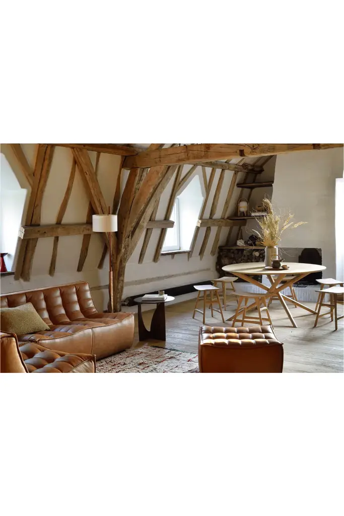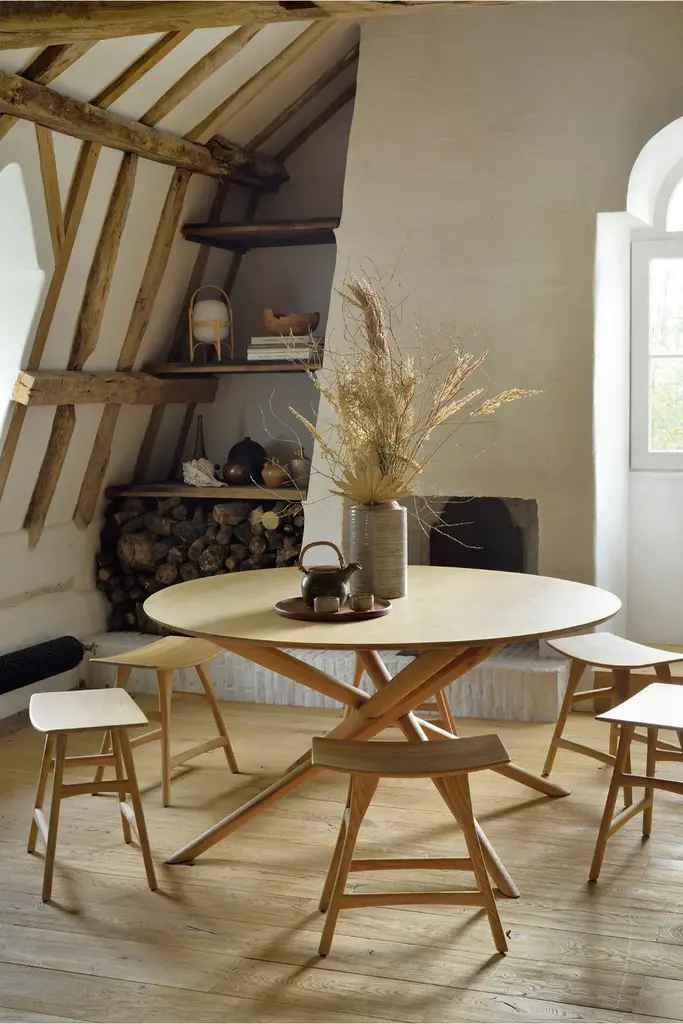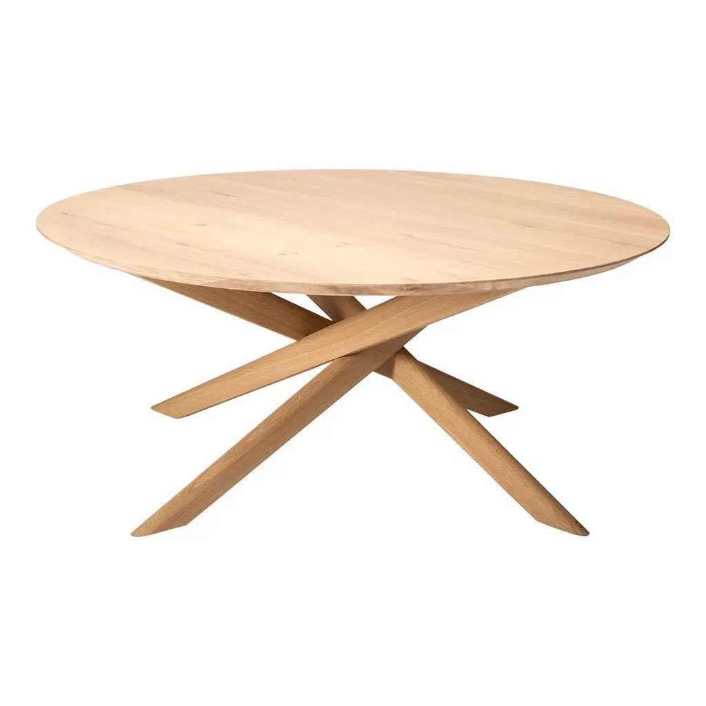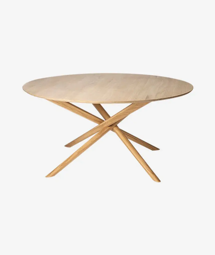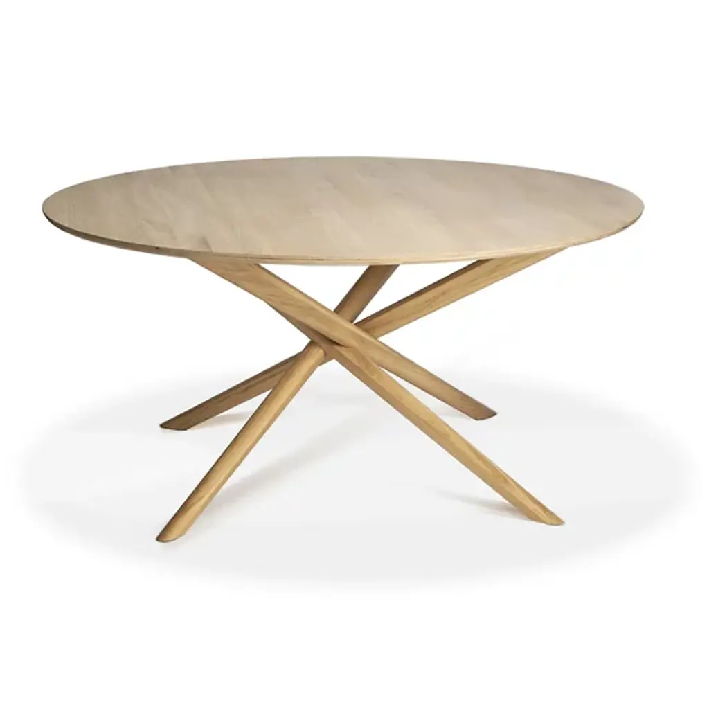 The Round Dining Table by Ethnicraft is a captivating addition to any kitchen or dining space. Crafted from solid oak with a varnished finish, this Mikado table exudes timeless charm. Its sculptural character is the result of a quest to find a balance between functionality and stability. The legs interlock like a well-thought-out puzzle, arranged under a solid round top. This piece showcases modern craftsmanship and adds an element of intrigue to your home.