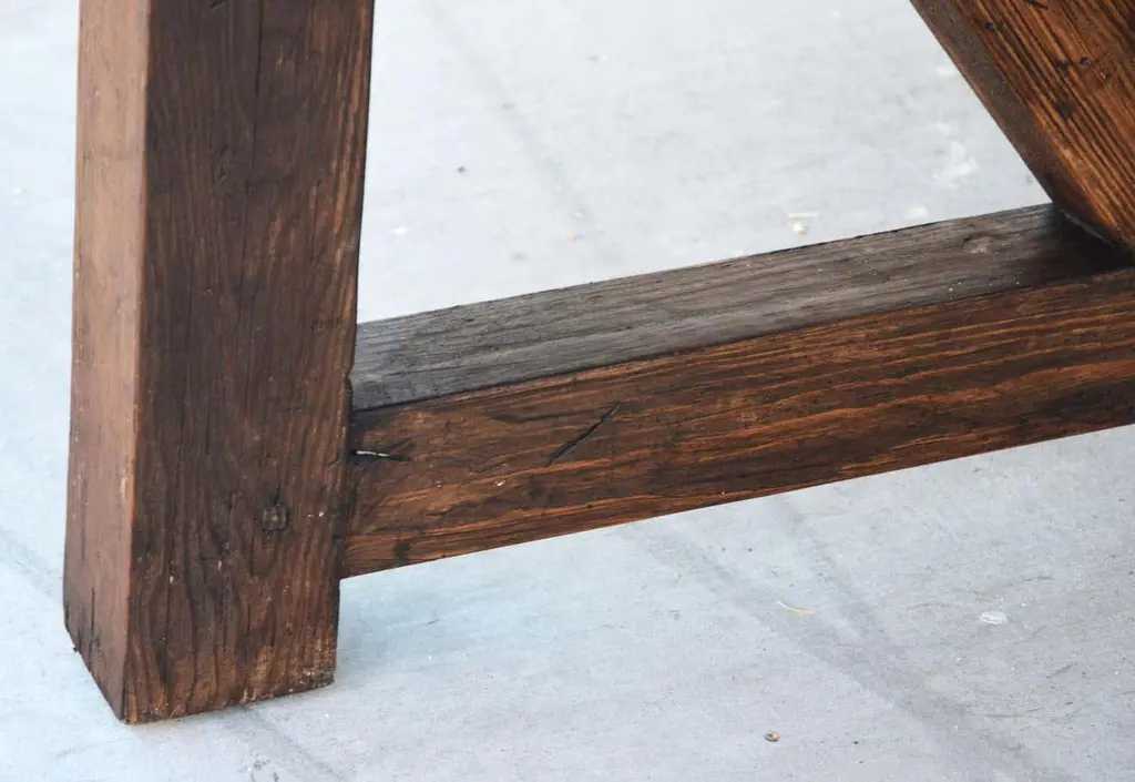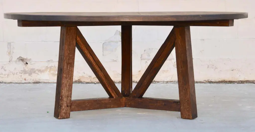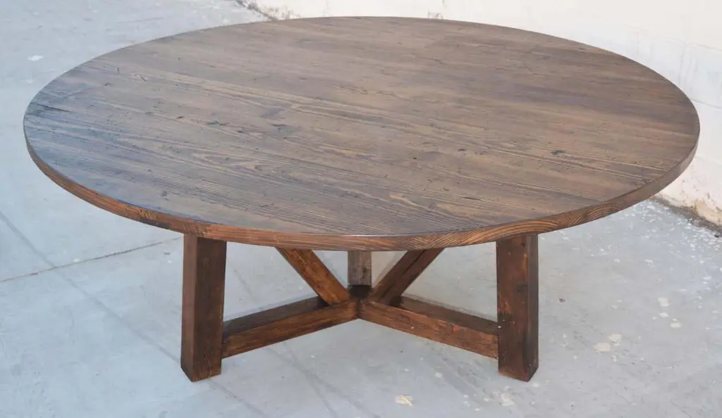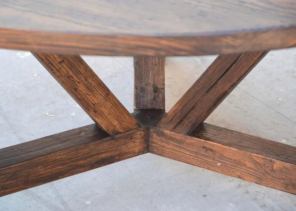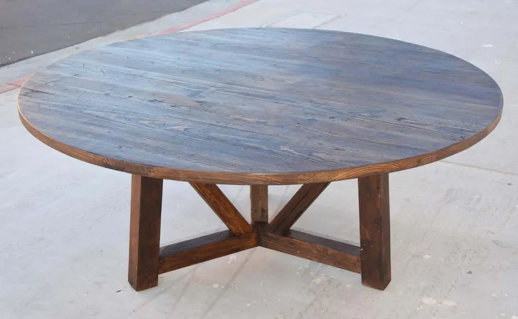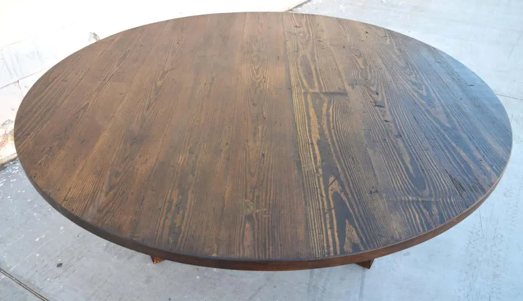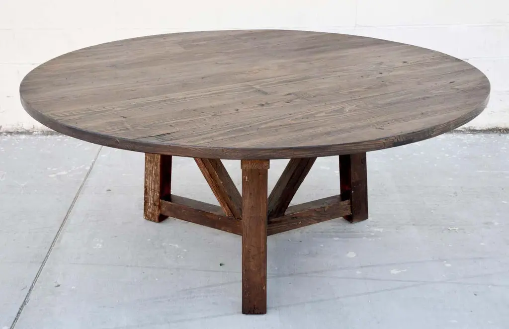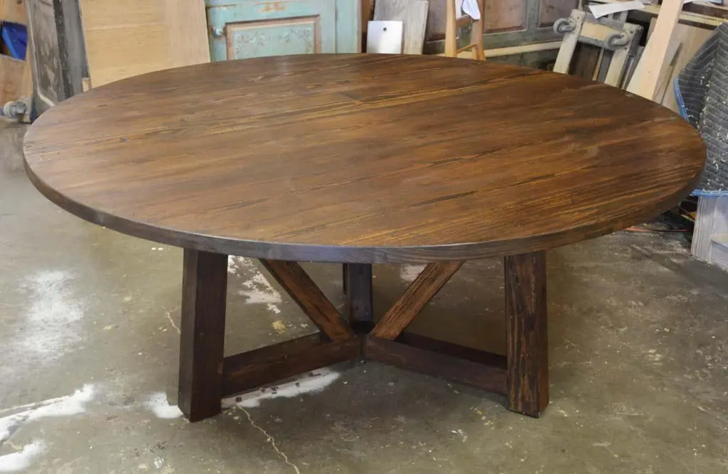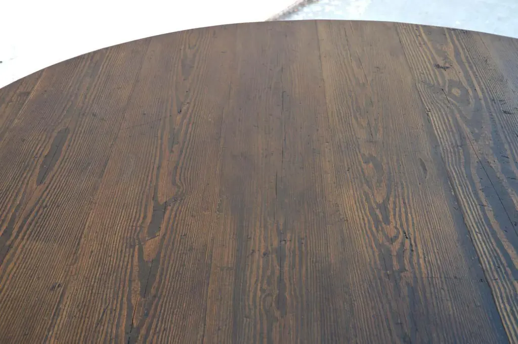This reclaimed pine dining table is seen here in a 72" diameter We use only traditional carpentry techniques, no nails or metal fasteners of any kind. Just mortise and Tenon construction reinforced with hand-cut wooden dowels.