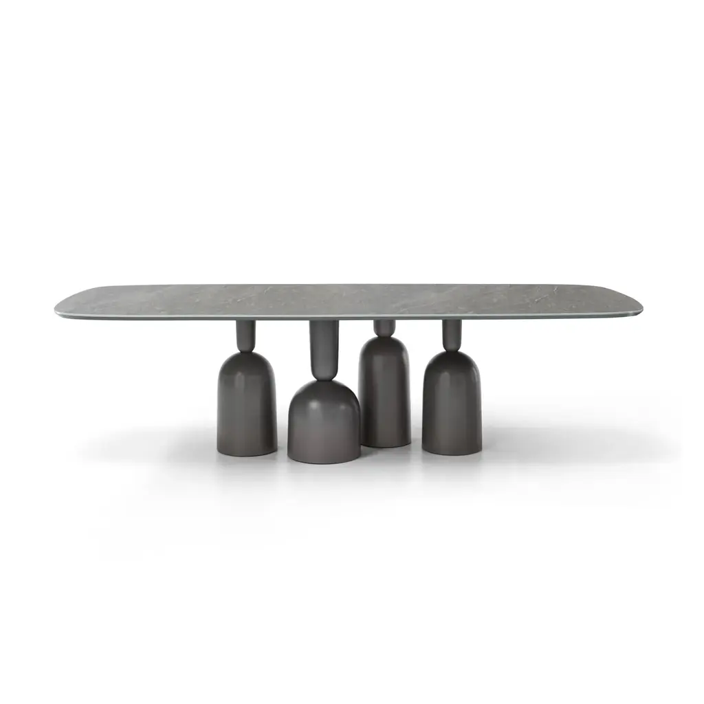 In everyday life, tables are normally covered with various objects but the surface of the Cop tabletop, with its innovative table leg design, is like a stretch of water on which the objects are upturned to form its unusual base. Stylized elements inspired by bottles, precious chalices and champagne glasses, appear in various shapes and sizes and are immediately striking, even in their unusual position. The top is a neutral element yet, at the same time, it is the dividing line of the world that it reflects. Flexible lines and careful formal research create a table intended to bring people and ideas together. The base of the Cop table is in painted metal, in a single color or in burnished, matt brass or matt copper finishes. The fixed top is available in wood, ceramic or marble and can be round or with rounded edges.