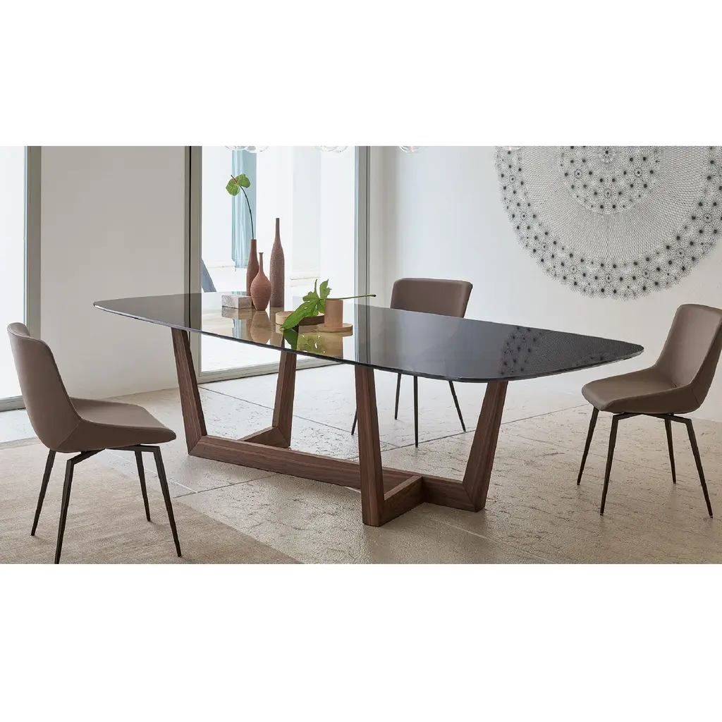 The base of the Art table is its most distinguishing feature: it is made of a metal trapezium that runs diagonally under the tabletop, allowing minimum obstruction and optimizing the space. Overall, the load-bearing structure designed in this way stands out for its high levels of dynamism, solidity and sculptural impact. The top is firmly supported but the final effect is one of great lightness.
