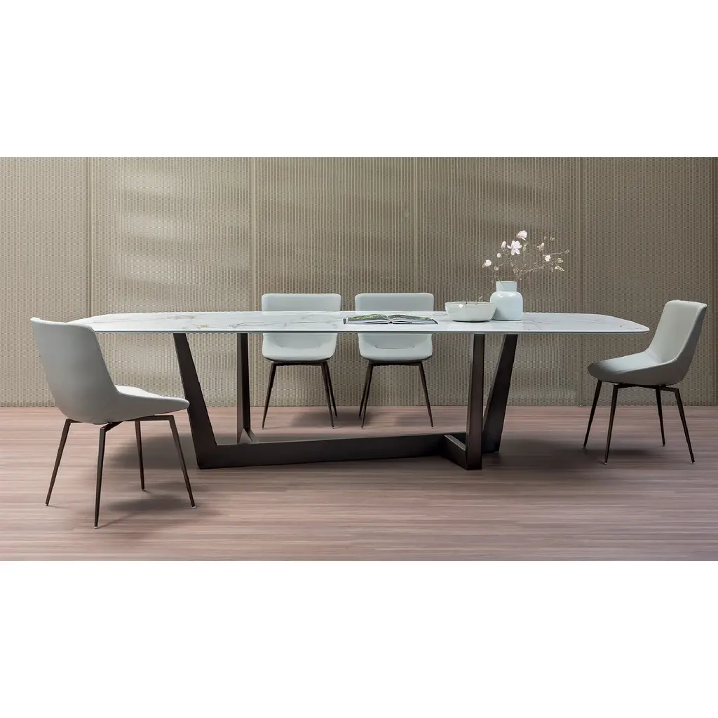The base of the Art table is its most distinguishing feature: it is made of a metal trapezium that runs diagonally under the tabletop, allowing minimum obstruction and optimizing the space. Overall, the load-bearing structure designed in this way stands out for its high levels of dynamism, solidity and sculptural impact. The top is firmly supported but the final effect is one of great lightness.