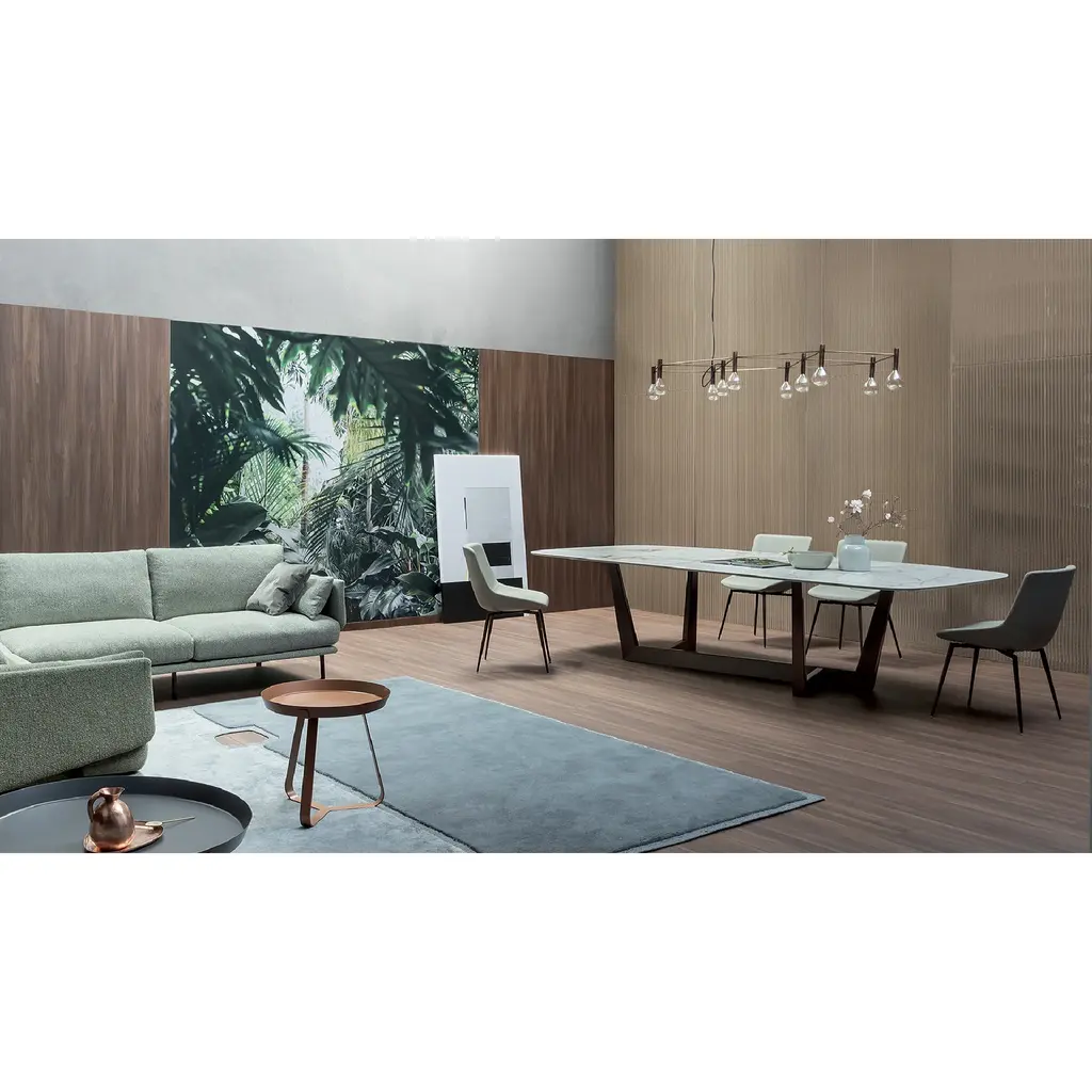The base of the Art table is its most distinguishing feature: it is made of a metal trapezium that runs diagonally under the tabletop, allowing minimum obstruction and optimizing the space. Overall, the load-bearing structure designed in this way stands out for its high levels of dynamism, solidity and sculptural impact. The top is firmly supported but the final effect is one of great lightness.