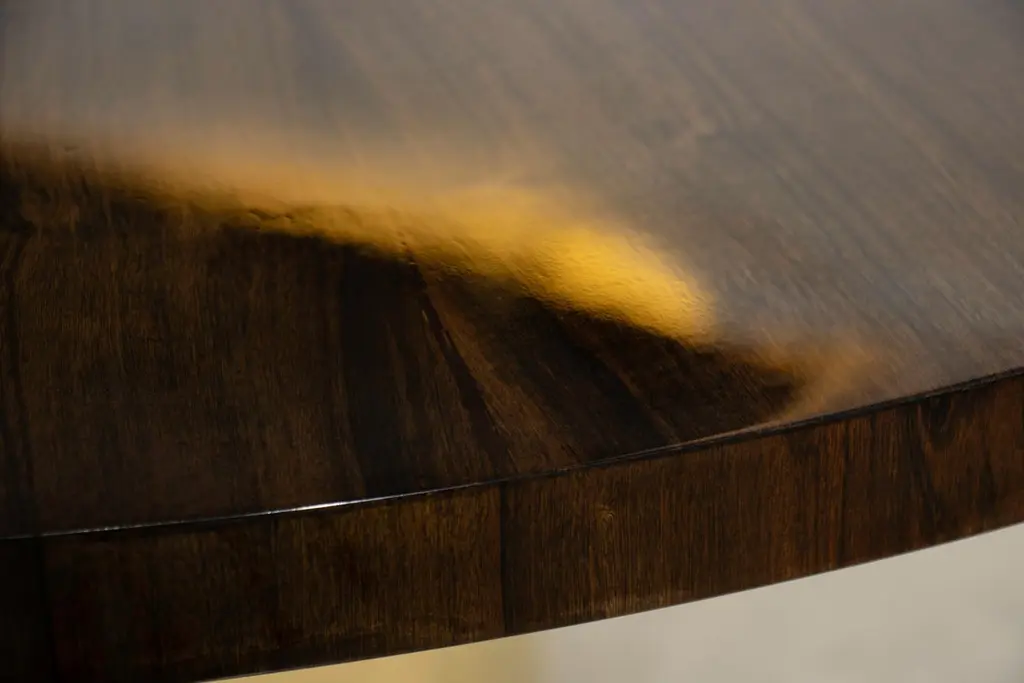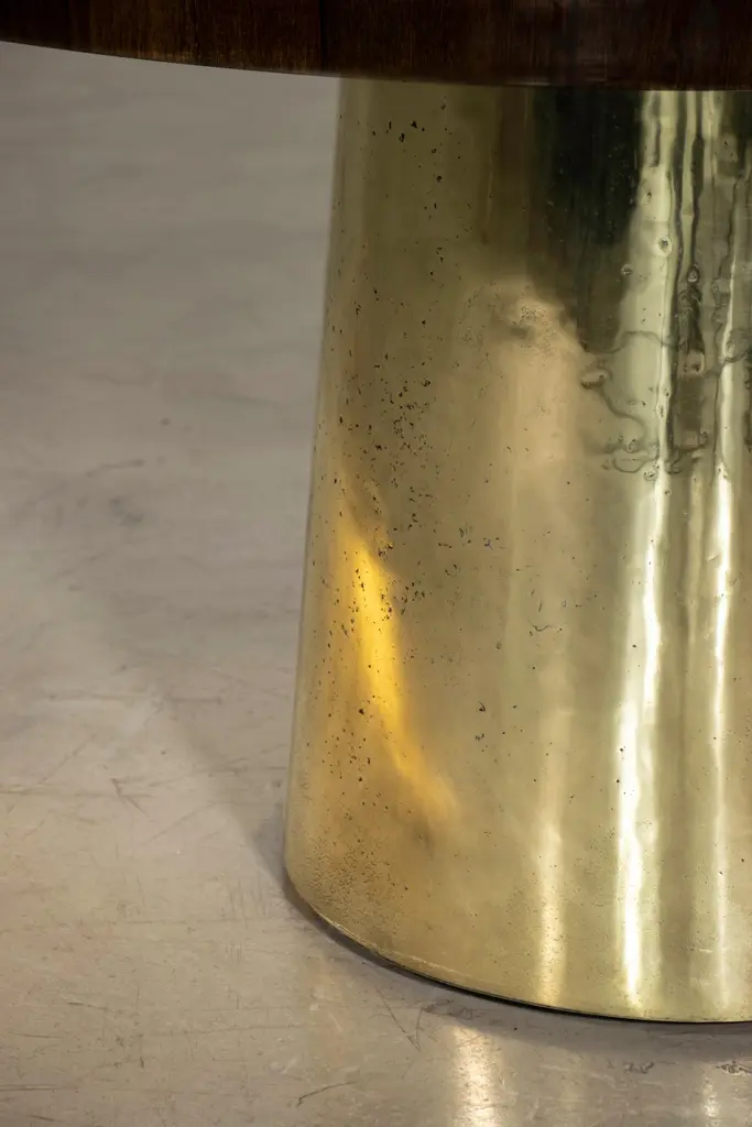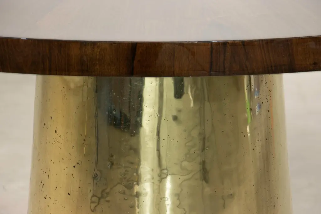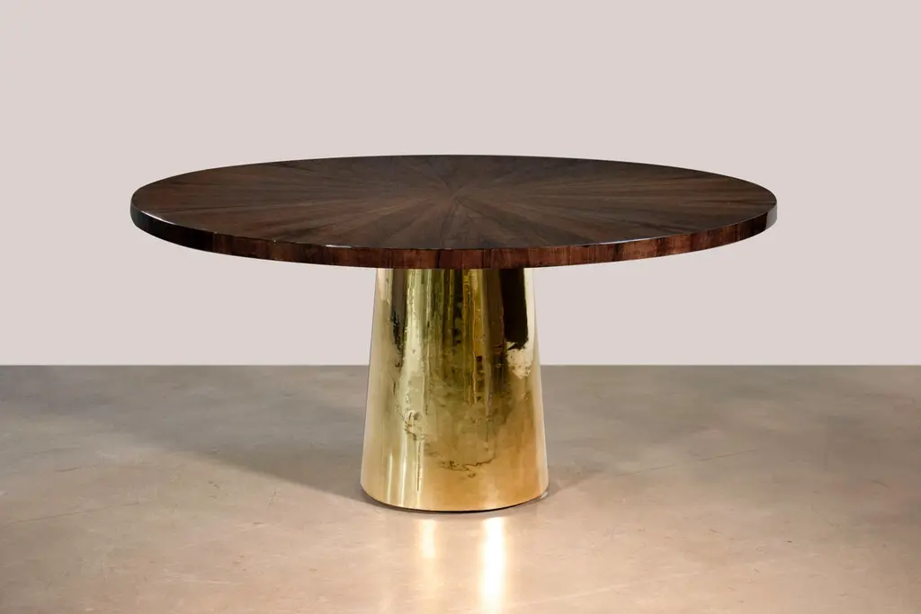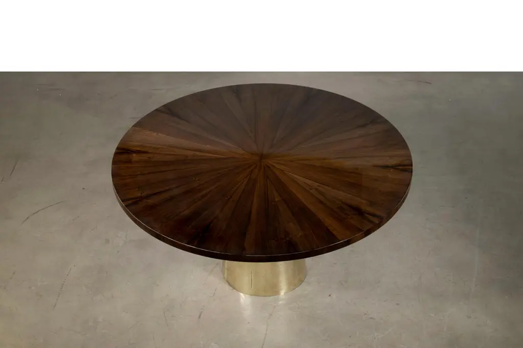 Benino Round Exotic Wood Cast Bronze Pedestal Dining Table by Costantini Design 60" round and 29" high as shownThe Benino Round Pedestal Table features a cast bronze base that is only partially polished in order to highlight the imperfections that evidence the burnt earth that once surrounded it during the casting process. Its top, by contrast, is finished smooth and in your choice of material and color. Shown in Argentine Rosewood with straight edge. Available also in stone or lacquered top, and in any size or finish.Base Finish Options: Bronze, Brass, AluminumOther materials available are Argentine Rosewood, Oak, Maple, Cherry, Beech, Elm, Okume, Teak, African Teak, Bird’s Eye Maple, Black Maple, Bubinga, Cerused Oak, Cerused Gray Oak, Gray Oak, Ebony, Macassar Ebony, Striped Macassar Ebony, Walnut Burl, Sycamore, Walnut and Zebrawood. Also available in any type of stone; Carrara, Calcutta Gold, Nero Marquina, St Laurent, Blue Jeans, Onyx and more. Available in matte, semi-gloss, high gloss finish or lacquered. Available as shown or customizable to your desired size, shape, finish, and more.About Costantini Design Costantini has been a trusted source for custom furniture, objects and lighting for a global client base since 2002. Its founder and owner, William Stuart, is a designer and artist who began his career as a multimedia artist and sculptor, practices which continue to inform the work. With a studio showroom in New York and a team of artisans at their own workshop in Buenos Aires, the Costantini team is able to connect artisans and artists with acclaimed clientele around the world. Its artisans work across many disparate materials such as bronze, solid wood, fiberglass, steel, plaster, goatskin, leather, rush, iron, marble, sheepskin and more. Visit their New York or Buenos Aires locations by appointment.