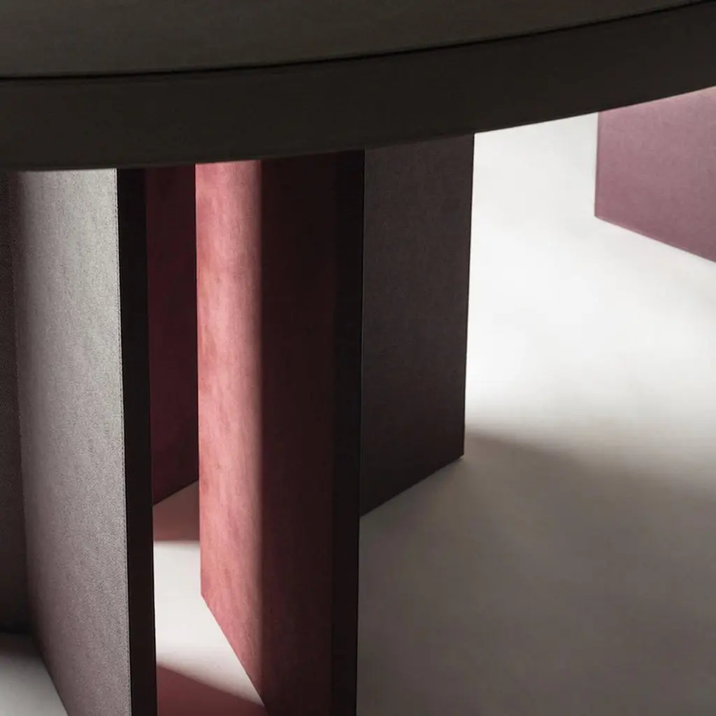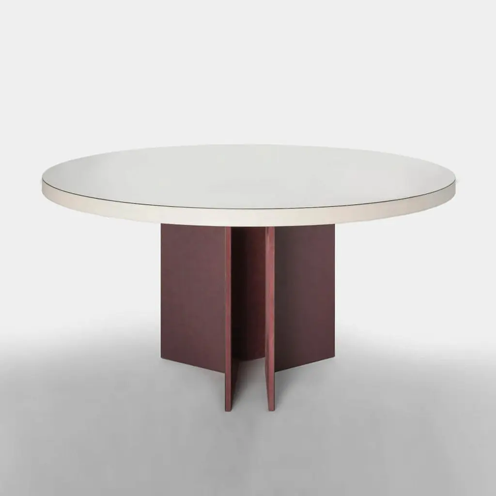 Contemporary round leather dining table - Bivio by Stephane Parmentier for Giobagnara.The object presented in the image has following finish: A05 White Suede Leather and A17 Bordeaux Suede Leather.A superb expression of creativity and craftsmanship, this table of the Bivio Collection is characterized by an intriguing base constructed of three folded wooden slabs lined in red suede and leather that support a white round top. The futuristic architecture of the iconic Villa Girasole by architect Angelo Invernizzi that rotates to follow the sun, is the main inspiration behind this unique design by Stéphane Parmentier.Design: Stéphane ParmentierMaterial: Golf, Suede or Nappa Leather, fully leather covered.Dimensions (in): W 62.99 x D 62.99 x H 29.72Dimensions (cm): W 160 x D 160 x H 75.5Made by hand, in Italy.This item is made to order. Please choose the finish that you want for your piece.