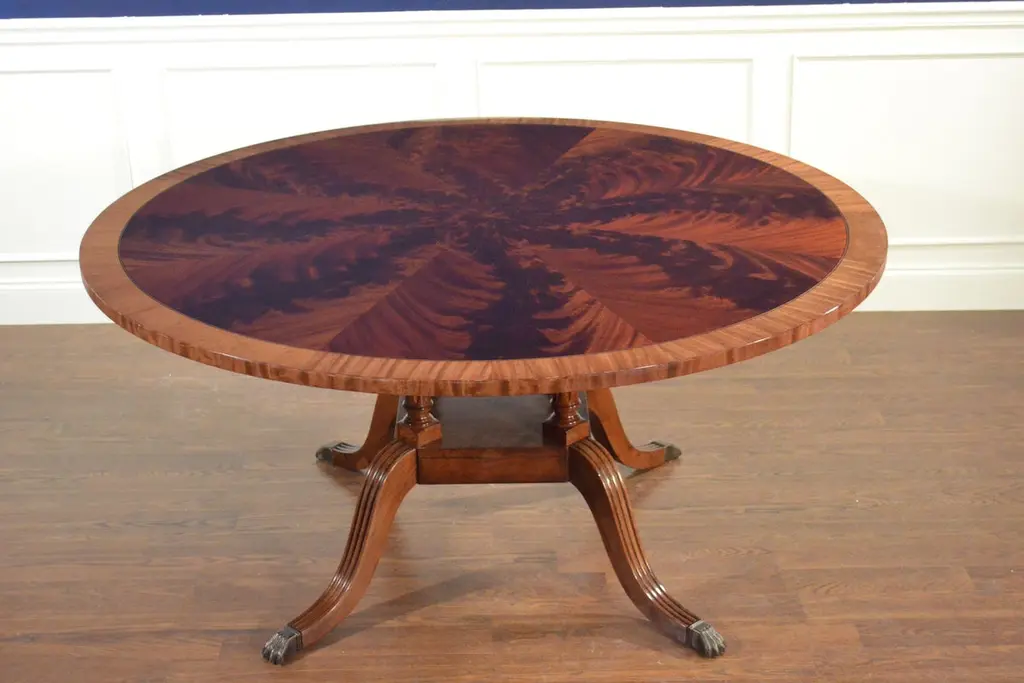 This is made-to-order round traditional mahogany dining table made in the Leighton Hall shop. It features field of radial cut West African swirly crotch mahogany and a border of satinwood. There is an inlay of ebony and white maple which separates the field from the border. The top has a hand rubbed and polished semigloss finish. The large birdcage pedestal has fluted legs which terminate with antique brass lions paw feet. Dimensions: 60 in. diameter, 30 in. high.You can purchase this table as shown ( 60 in. diameter) or we can make a custom table to your size and specifications in our shop. Optional sizes include: 66 in., 72 in., 84 in. and larger. Optional borders include: burled walnut, swirly crotch mahogany, straight grain mahogany, movingue and more. It also is available with optional finishes and optional feet.