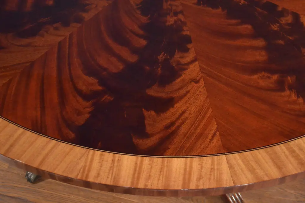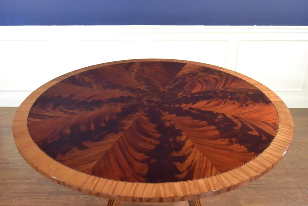 This is made-to-order round traditional mahogany dining table made in the Leighton Hall shop in Suwanee, Georgia. It features field of radial cut West African swirly crotch mahogany and a border of satinwood. There is an inlay of ebony and white maple which separates the field from the border. The top has a hand rubbed and polished semigloss finish. The large birdcage pedestal has fluted legs which terminate with antique brass lions paw feet. Dimensions: 60 in. diameter, 30 in. high.