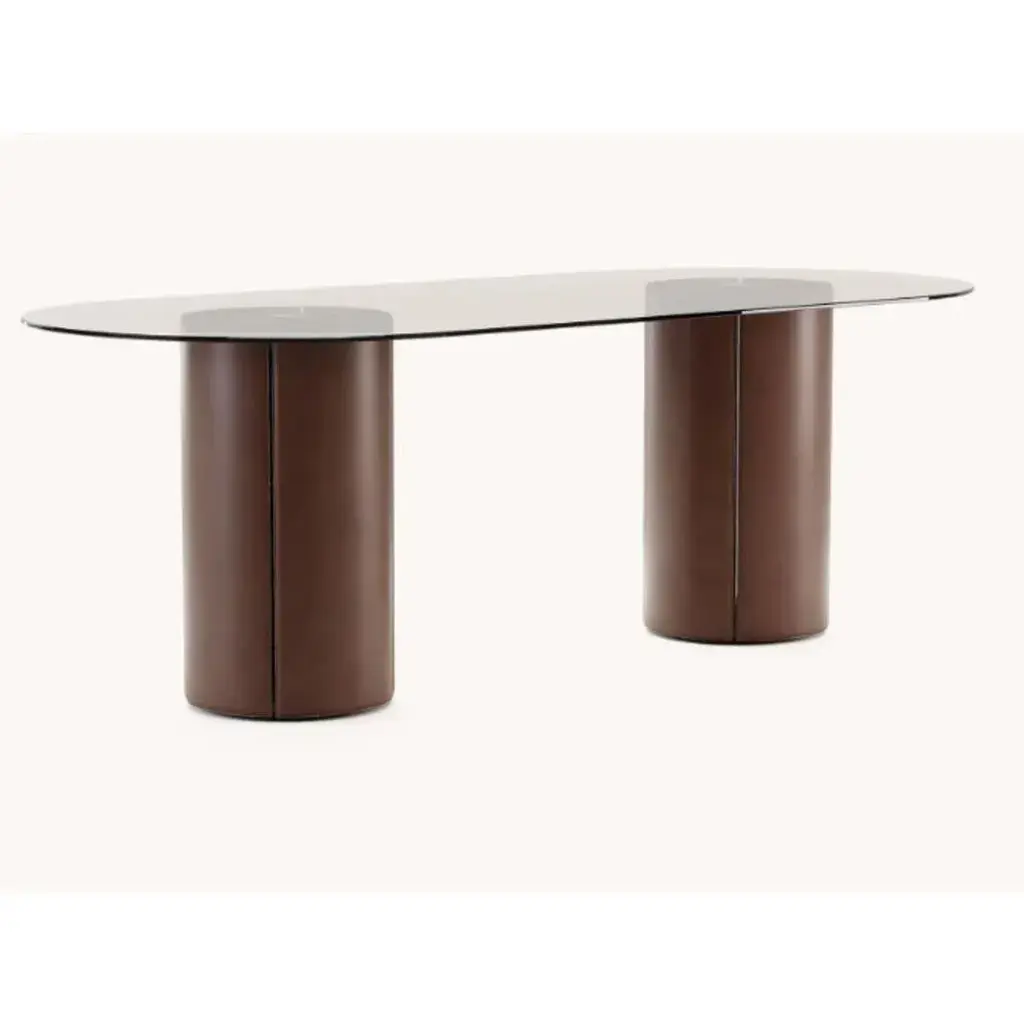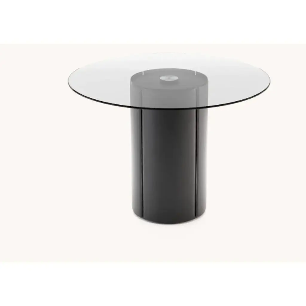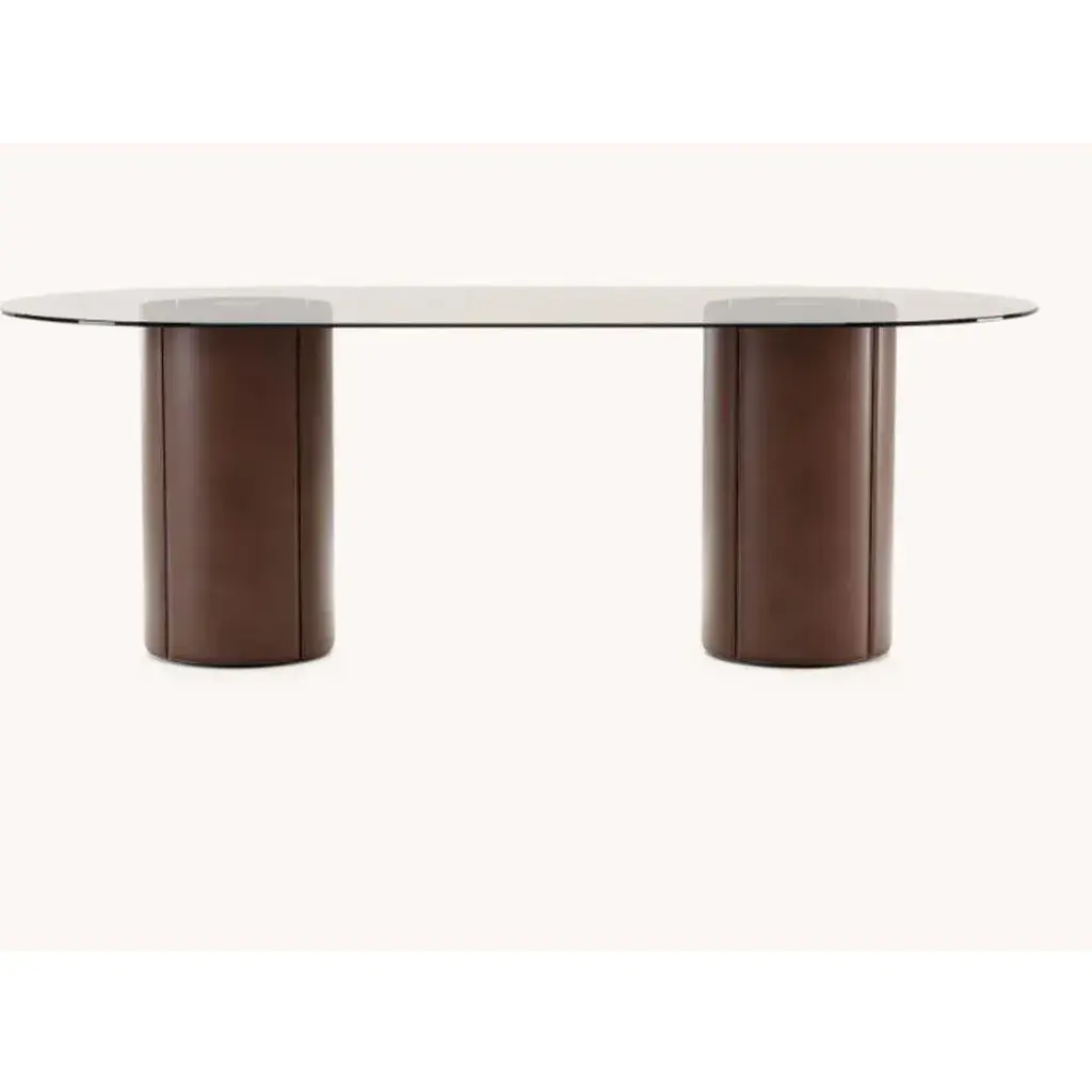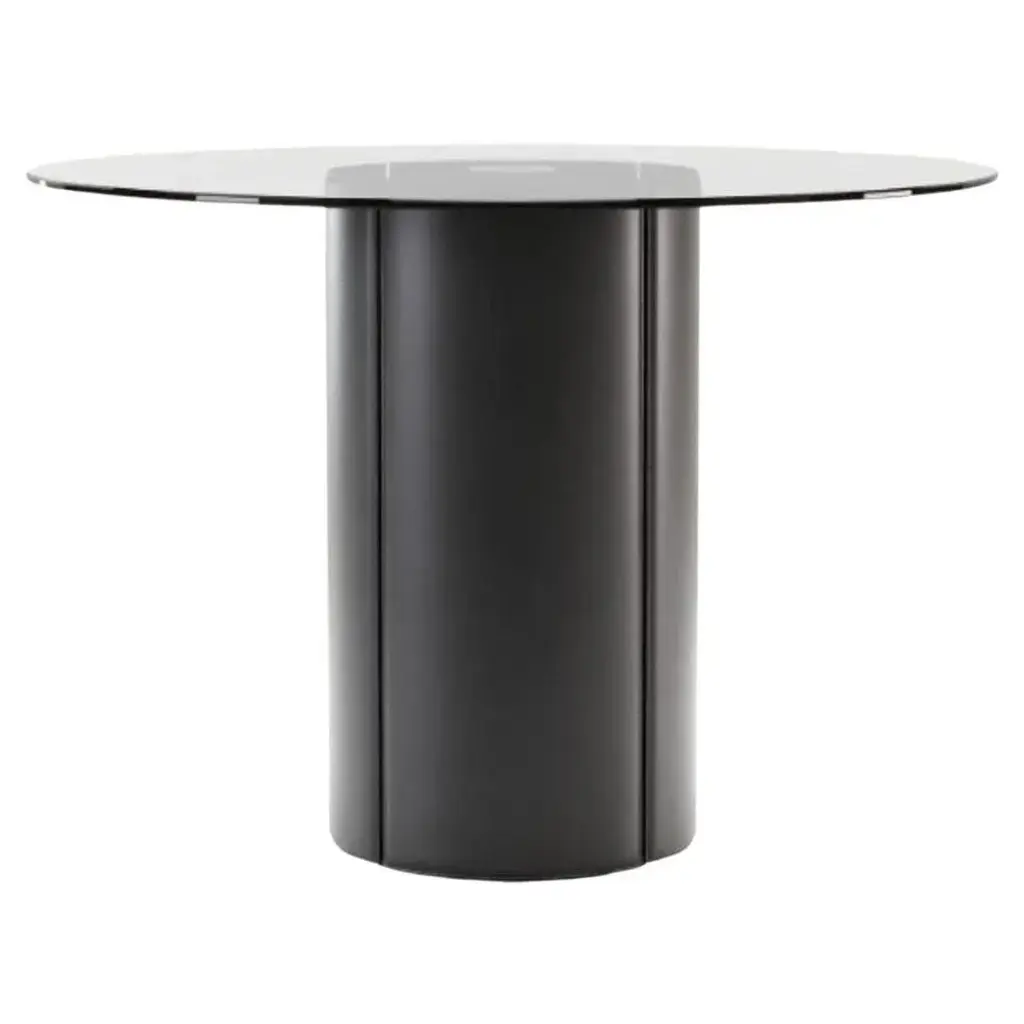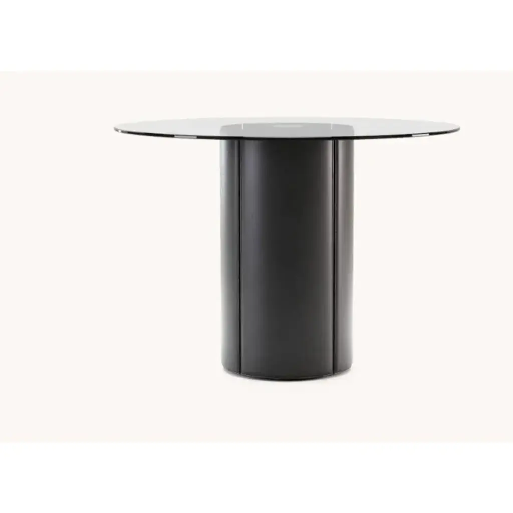 Round Mano dining table by Domkapa Dimensions: W 140 x D 140 x H 75 cm. Materials: Black lacquered matte, natural leather (Albany Black), smoked glass. Also available in different materials. with classic materials and an outstanding shape, Mano Dining Table inspires for its harmony and craftwork design. It is fully upholstered in natural leather contrasting with the top in glass, embodying a sense of authenticity and allowing your design to endure. Mano is also available in the coffee table and side table versions for you for an exclusive design.