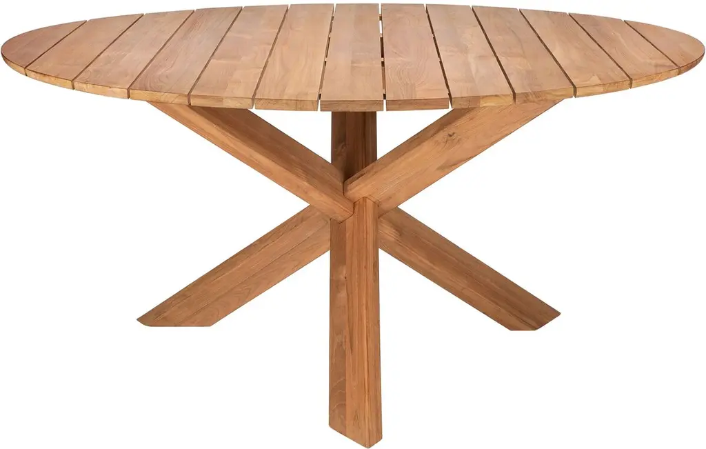 Crafted of teak, a hardwood prized for its resistance to moisture, decay, and even termites, this dining table pairs a slatted top with a base of intersecting angled legs. Durable enough for your patio or deck, it's also beautiful enough for your dining room or kitchen.